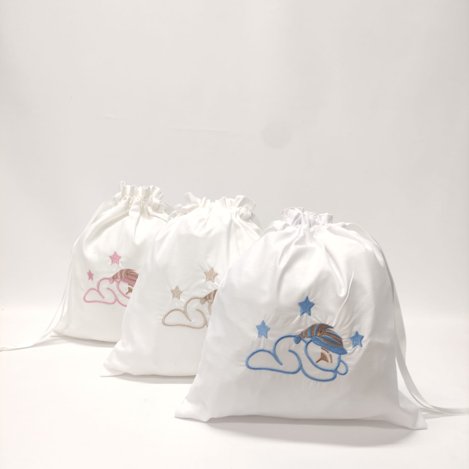 Saco em 100% algodão, com bordado infantil, ideal para transportar os bens pessoais do seu bebé. Bordado disponível na cor azul, bege e rosa.