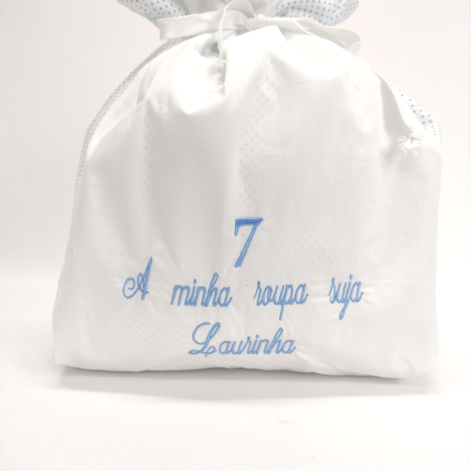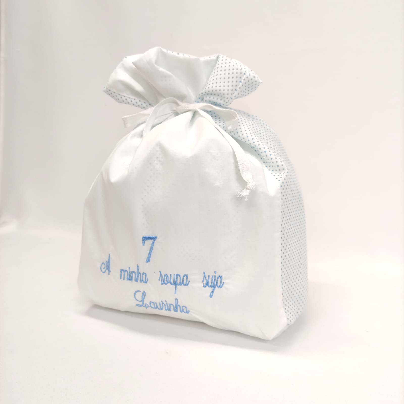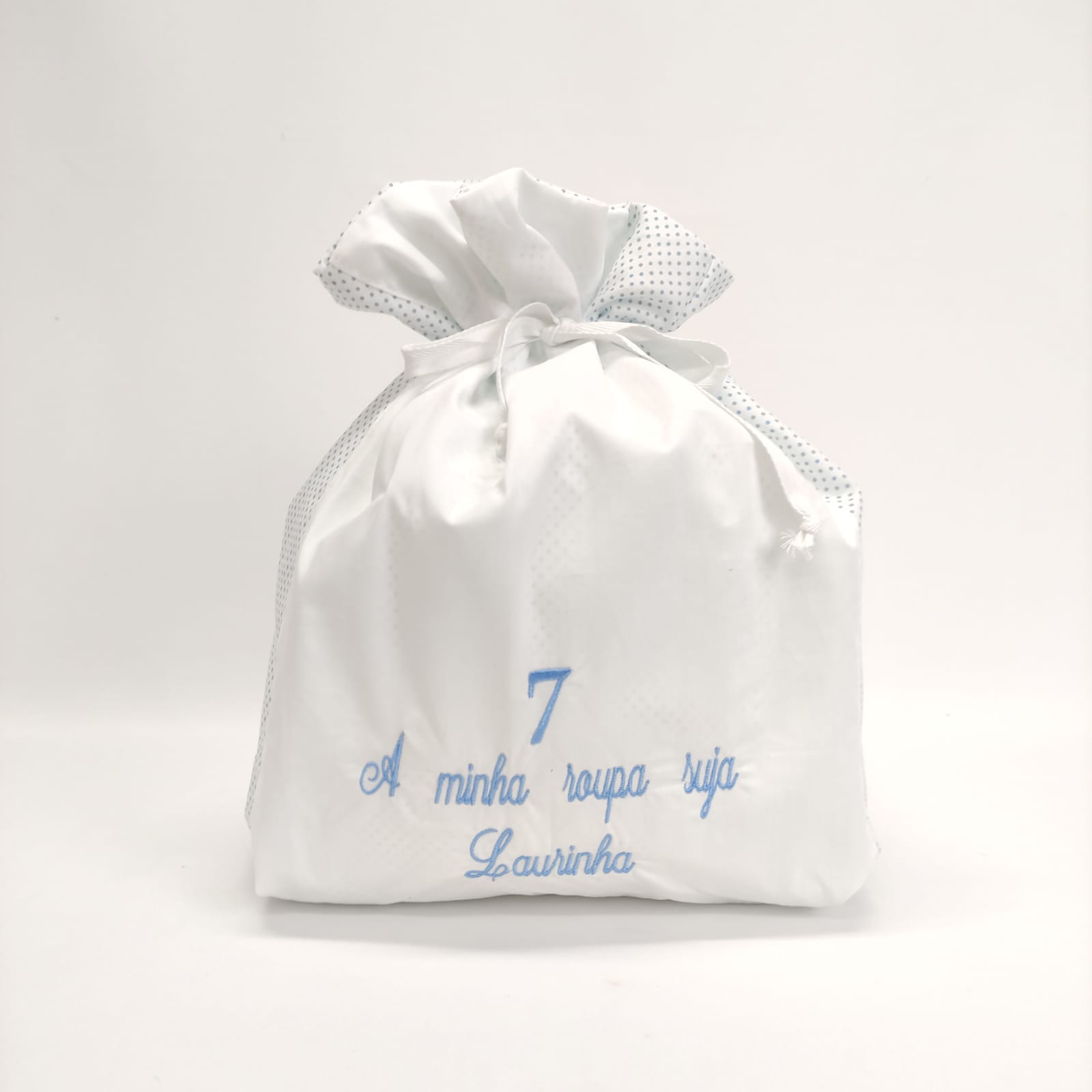Saco de bebé, em algodão branco e com padrão pintinhas azul. Acabamento com fita branca. Fabricado com tecido de qualidade para uma estabilidade e maior durabilidade, muito macio e de fácil lavagem e secagem.