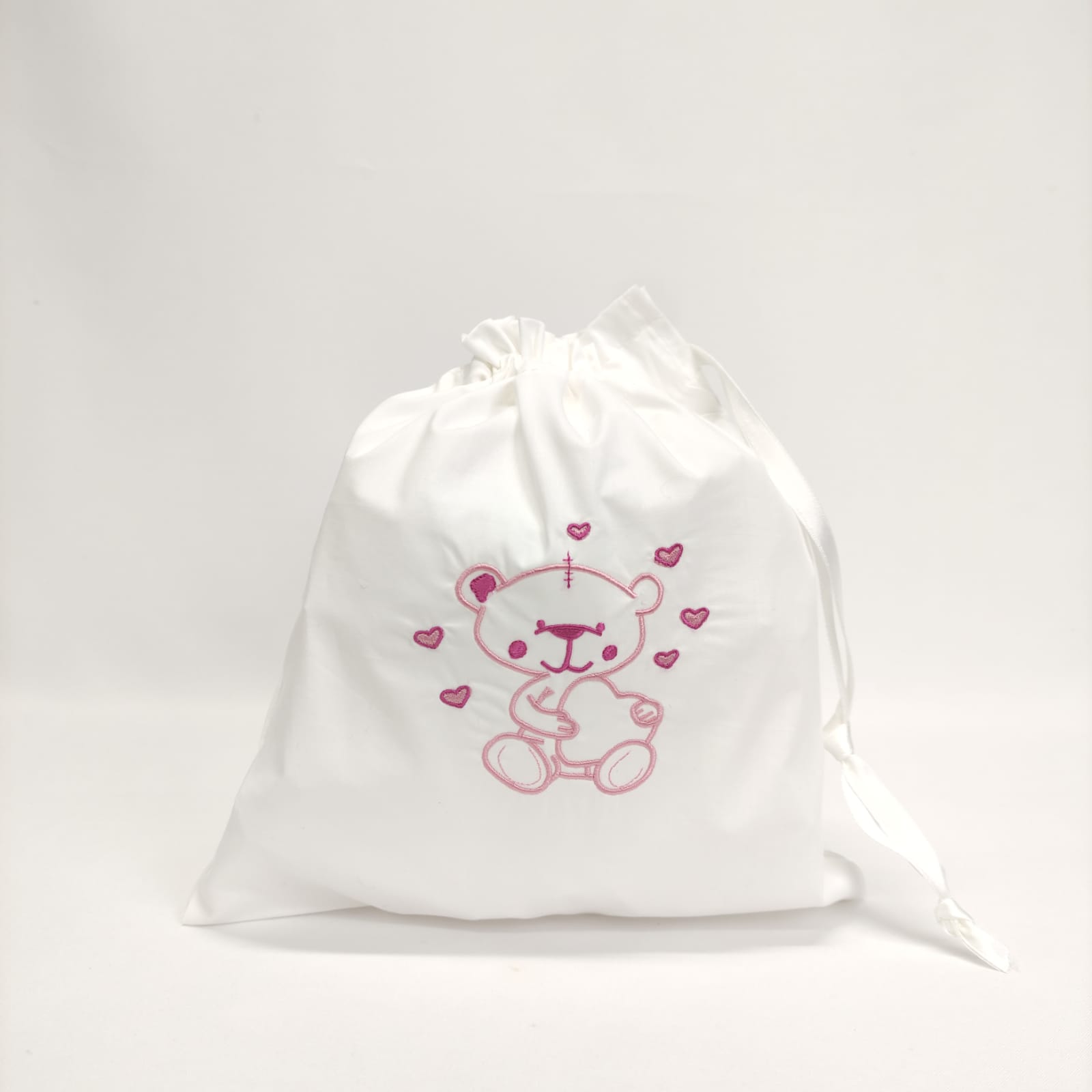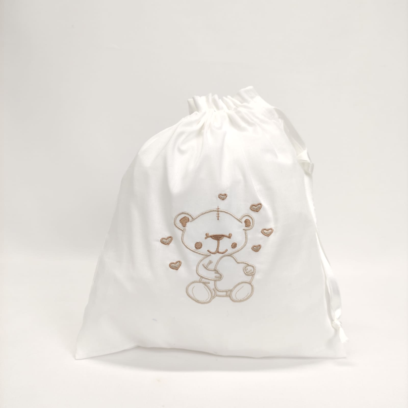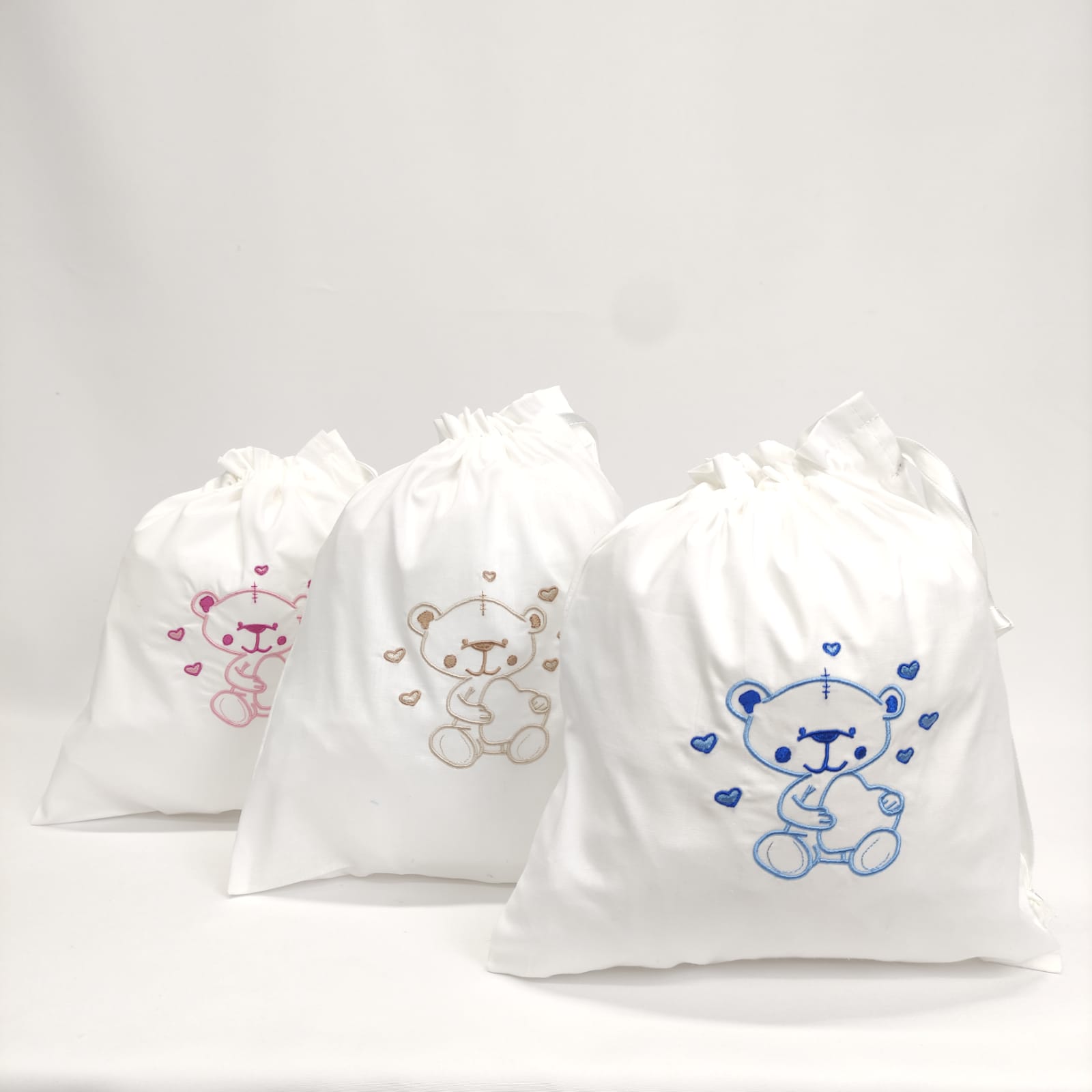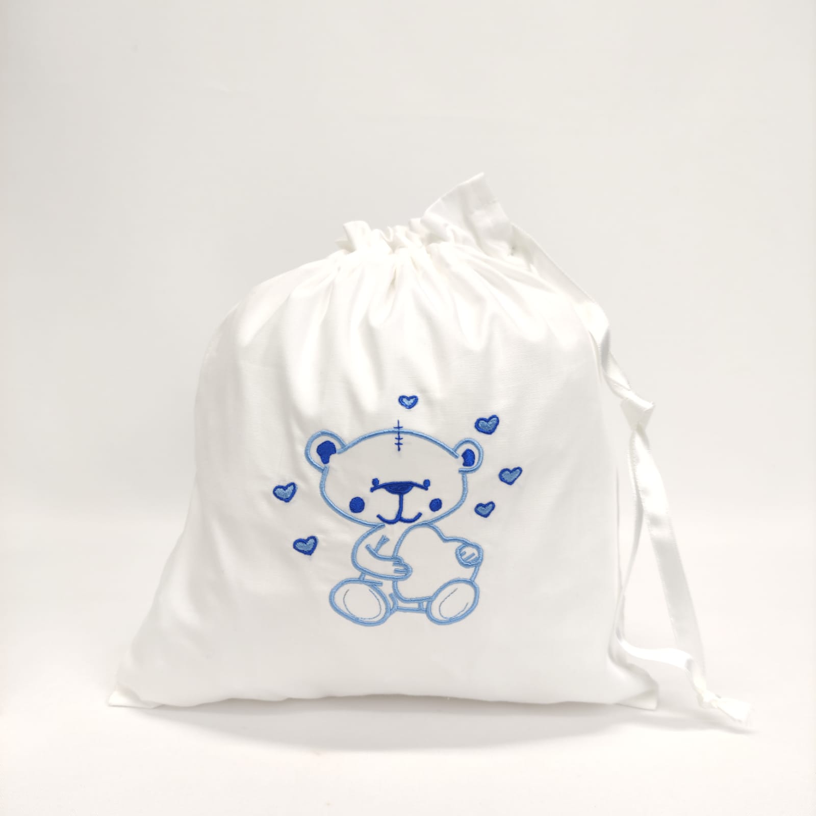 Saco em 100% algodão, com bordado infantil, ideal para transportar os bens pessoais do seu bebé. Bordado disponível na cor azul, bege e rosa.