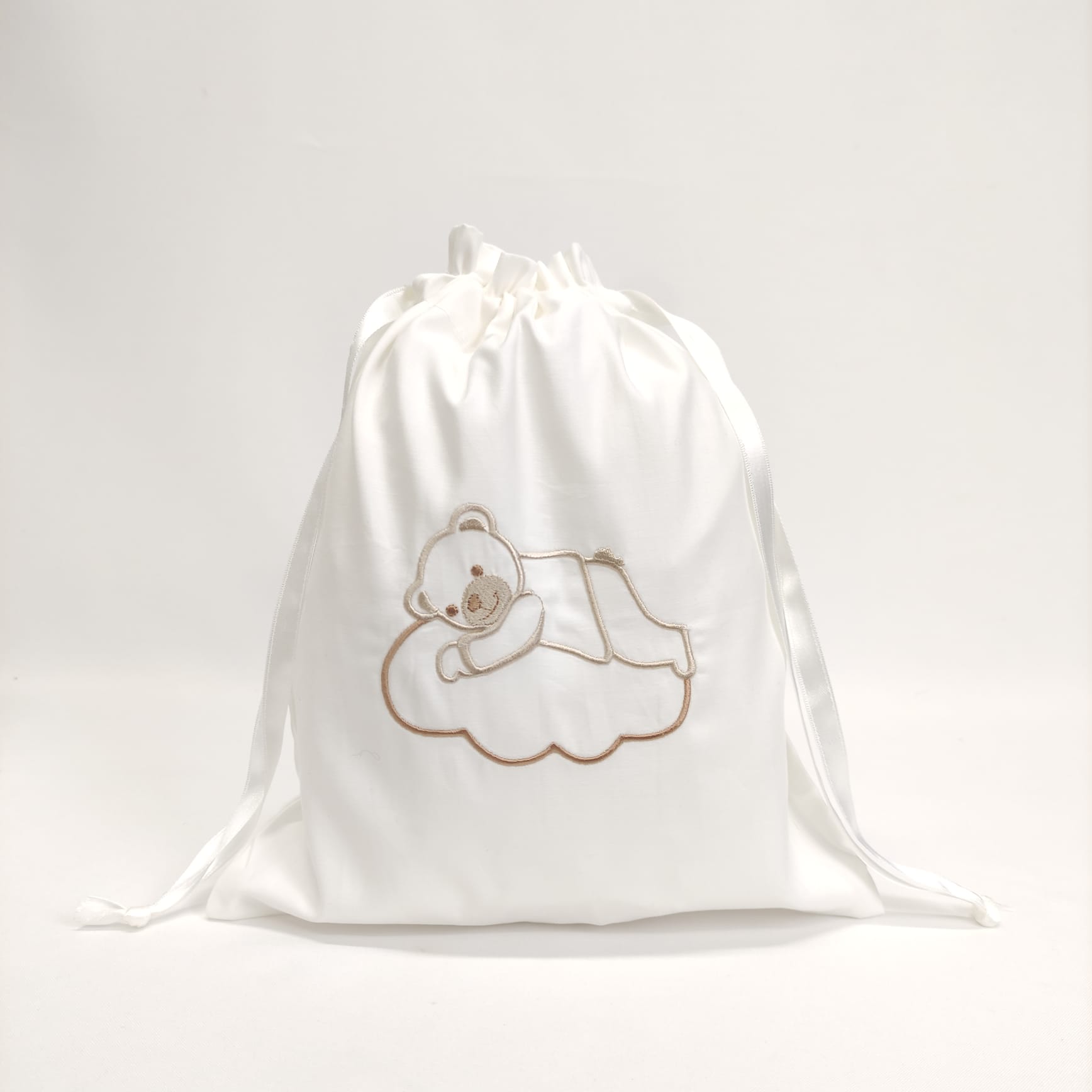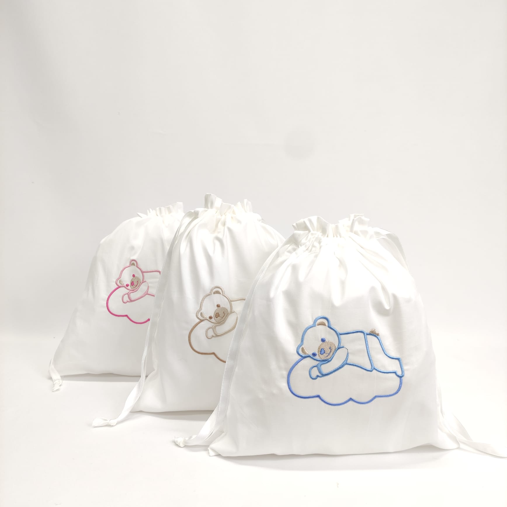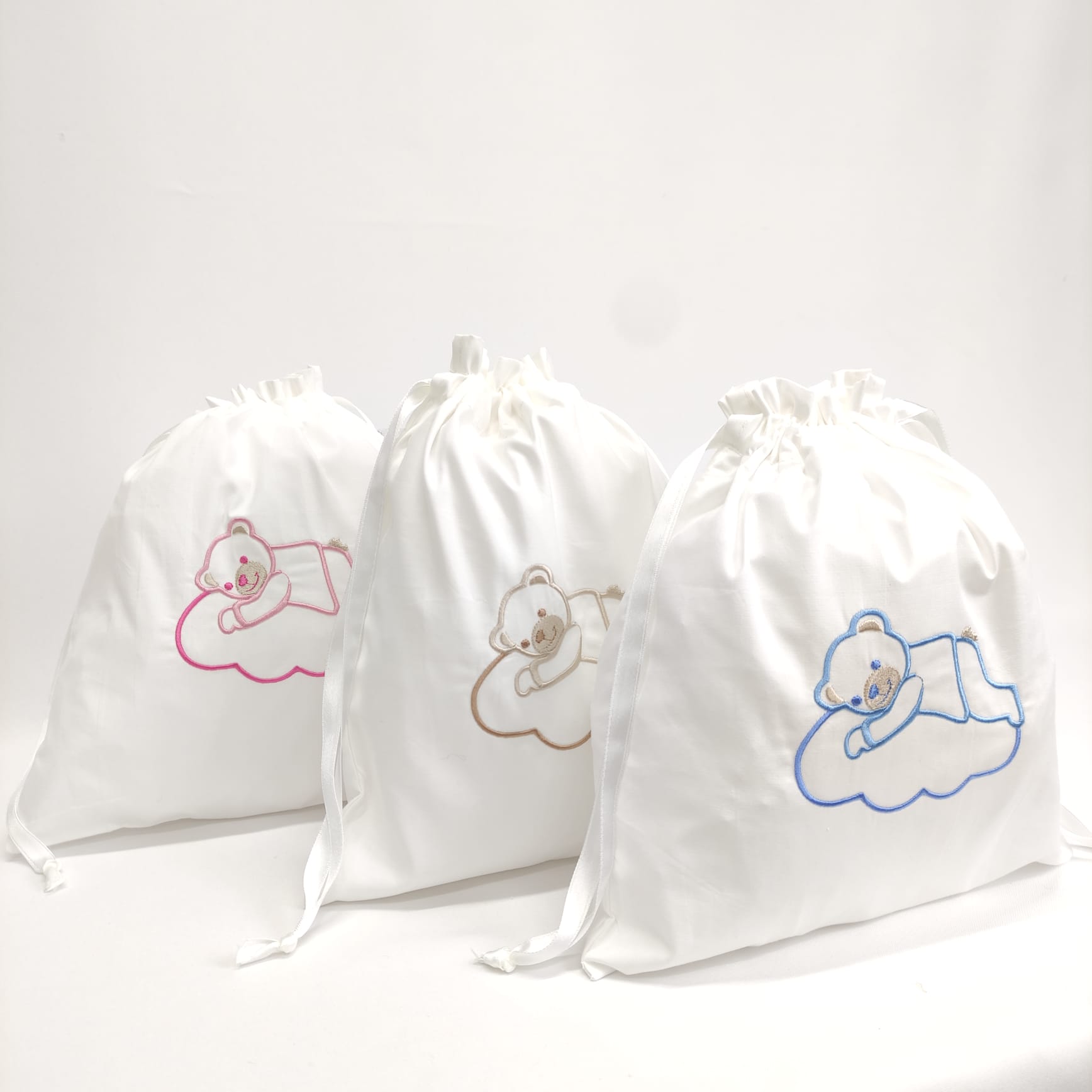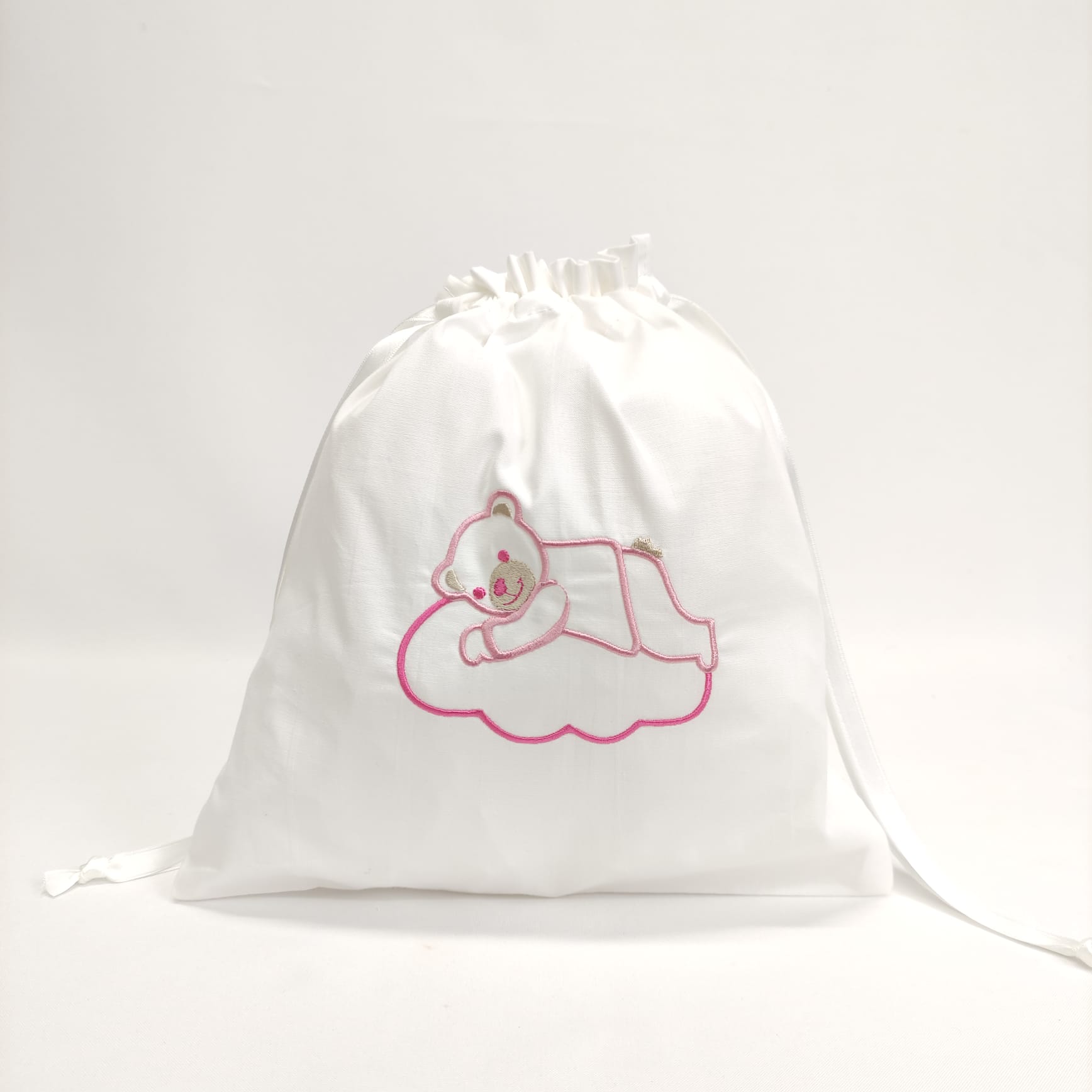 Saco em 100% algodão, com bordado infantil, ideal para transportar os bens pessoais do seu bebé. Bordado disponível na cor azul, bege e rosa.
