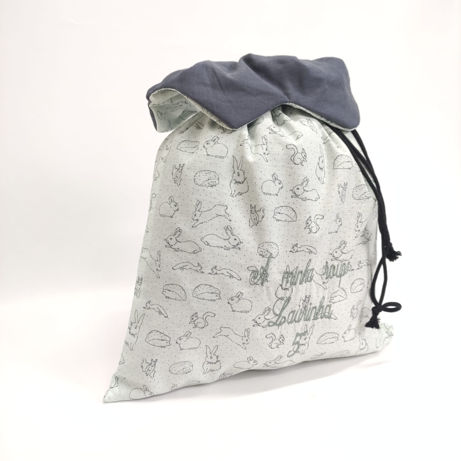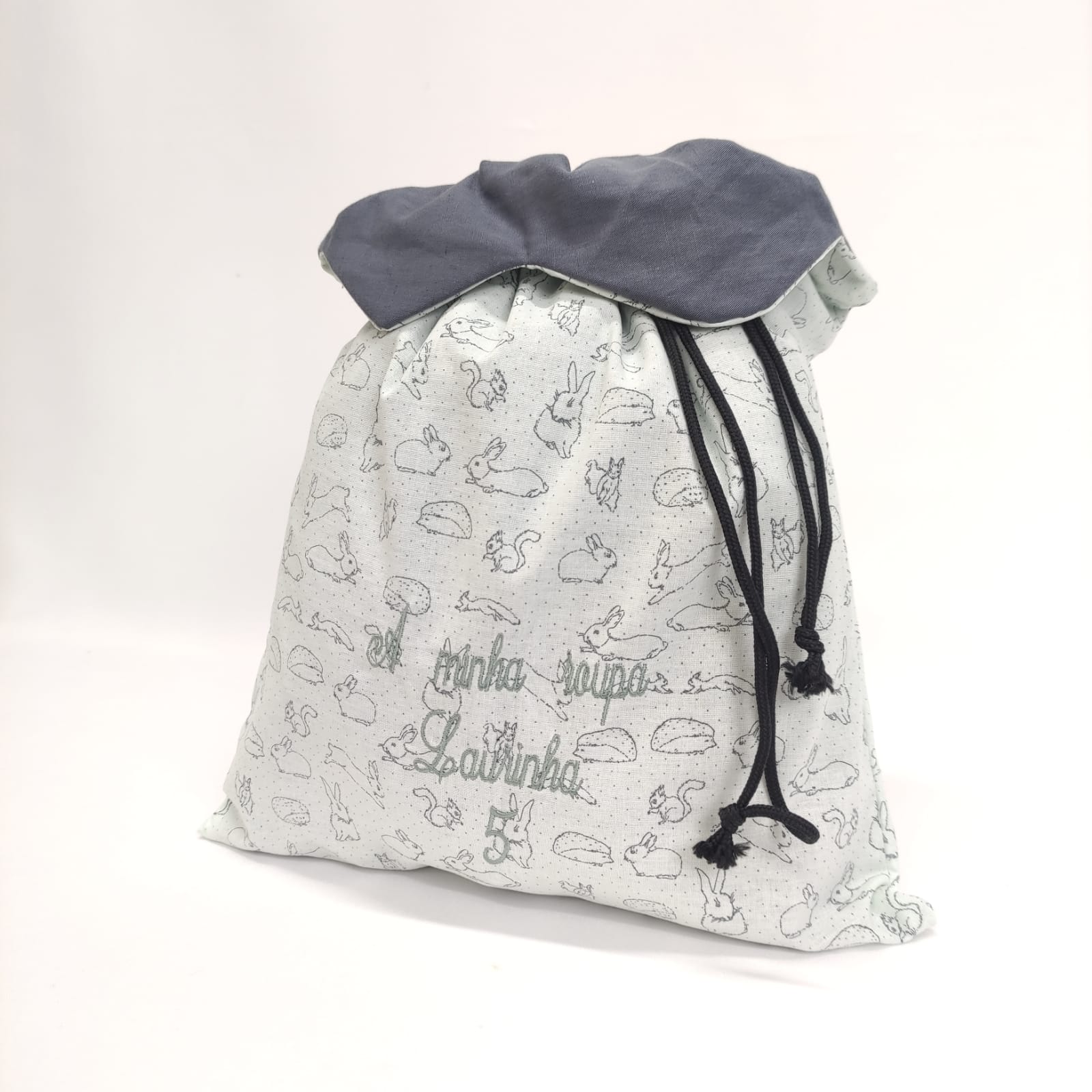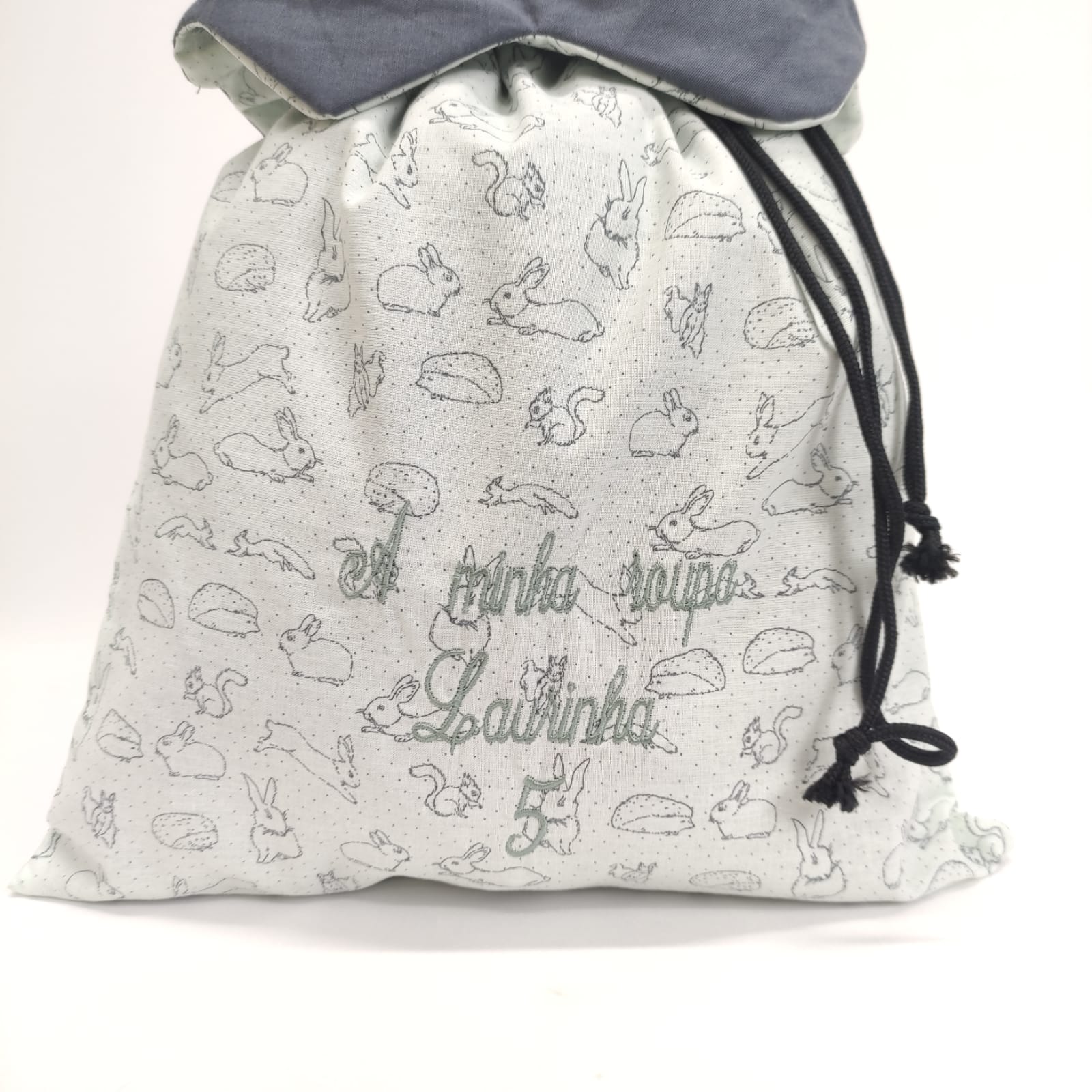 Saco em tecido de algodão forrado, com padrão coelhinhos. Com fecho fácil, cordão, e particularidade de gola em cinza escuro. Possibilidade de aplicação de bordado. Bordado de frase incluido, a minha roupa.