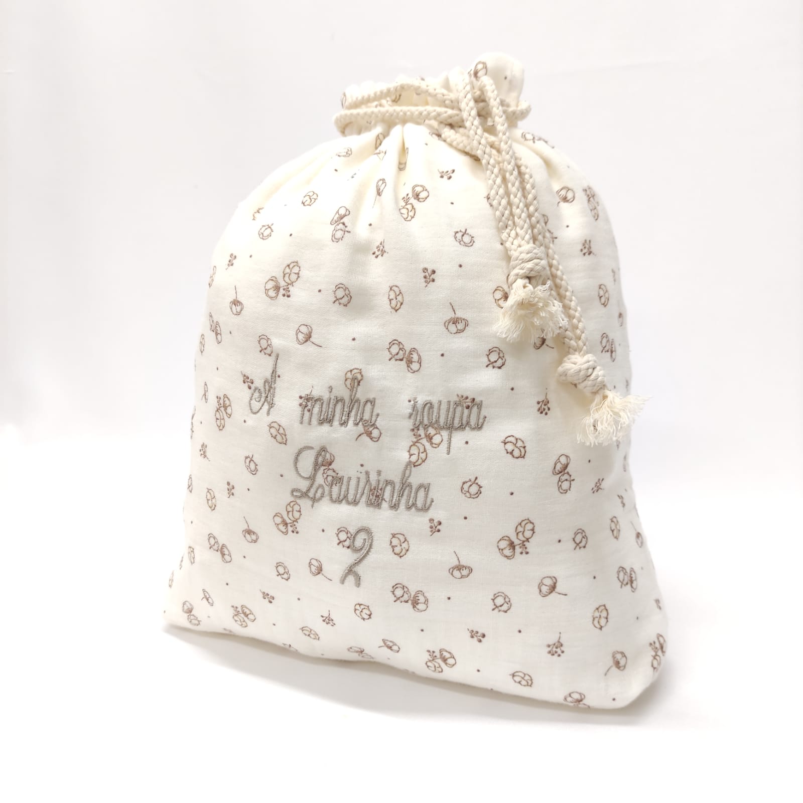 Saco em tecido musselina de algodão, com padrão em tons de bege. Bordado incluido, a minha roupa. Possibilidade de aplicação de bordar nome ou letras.