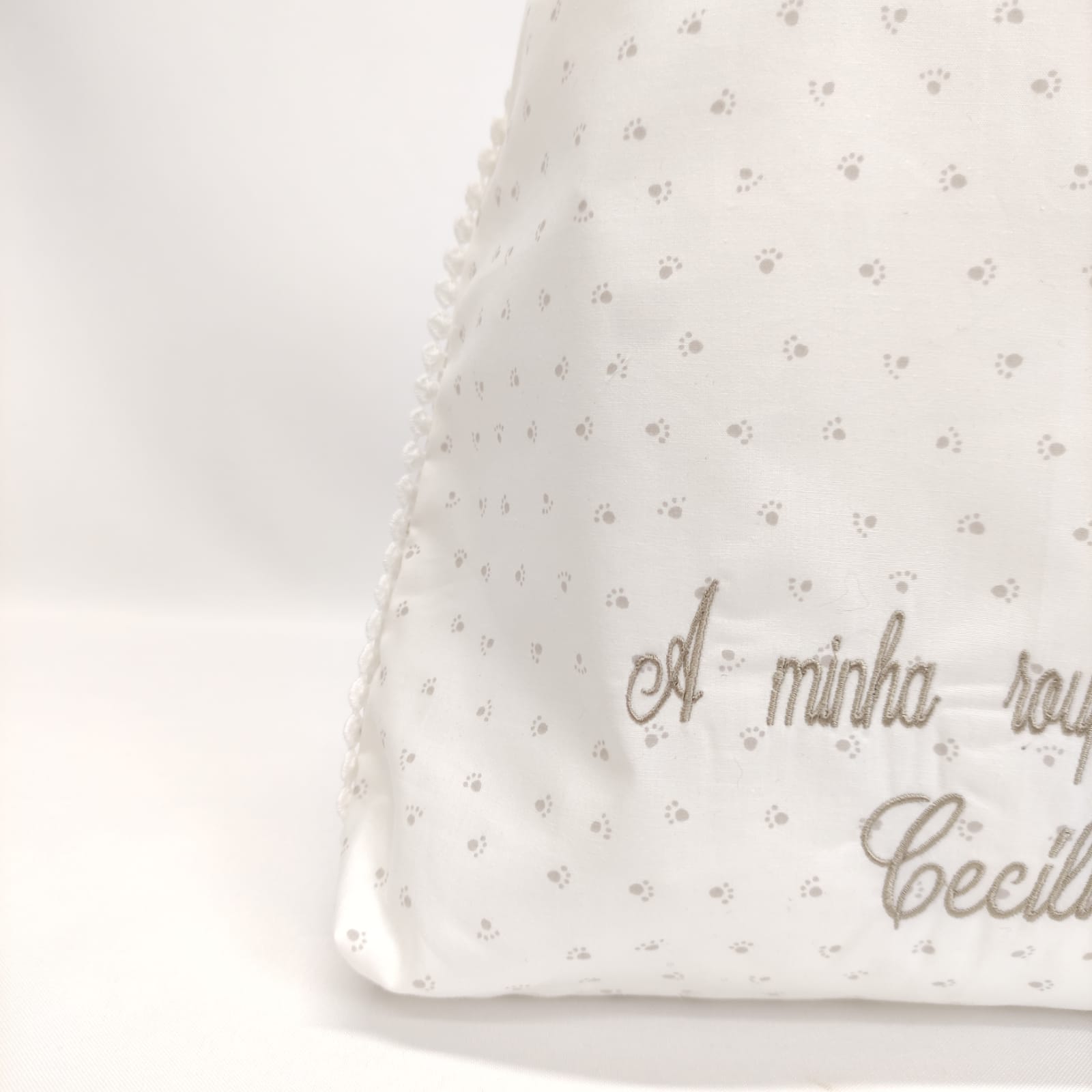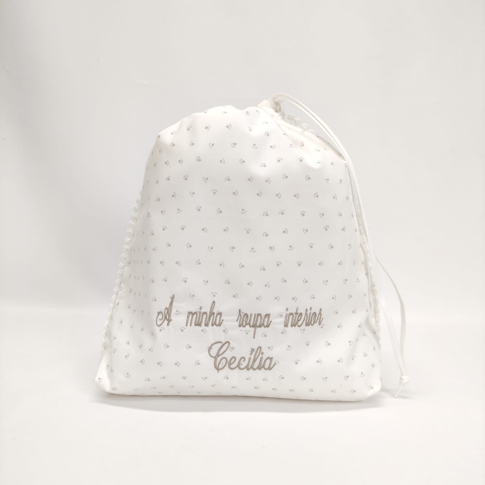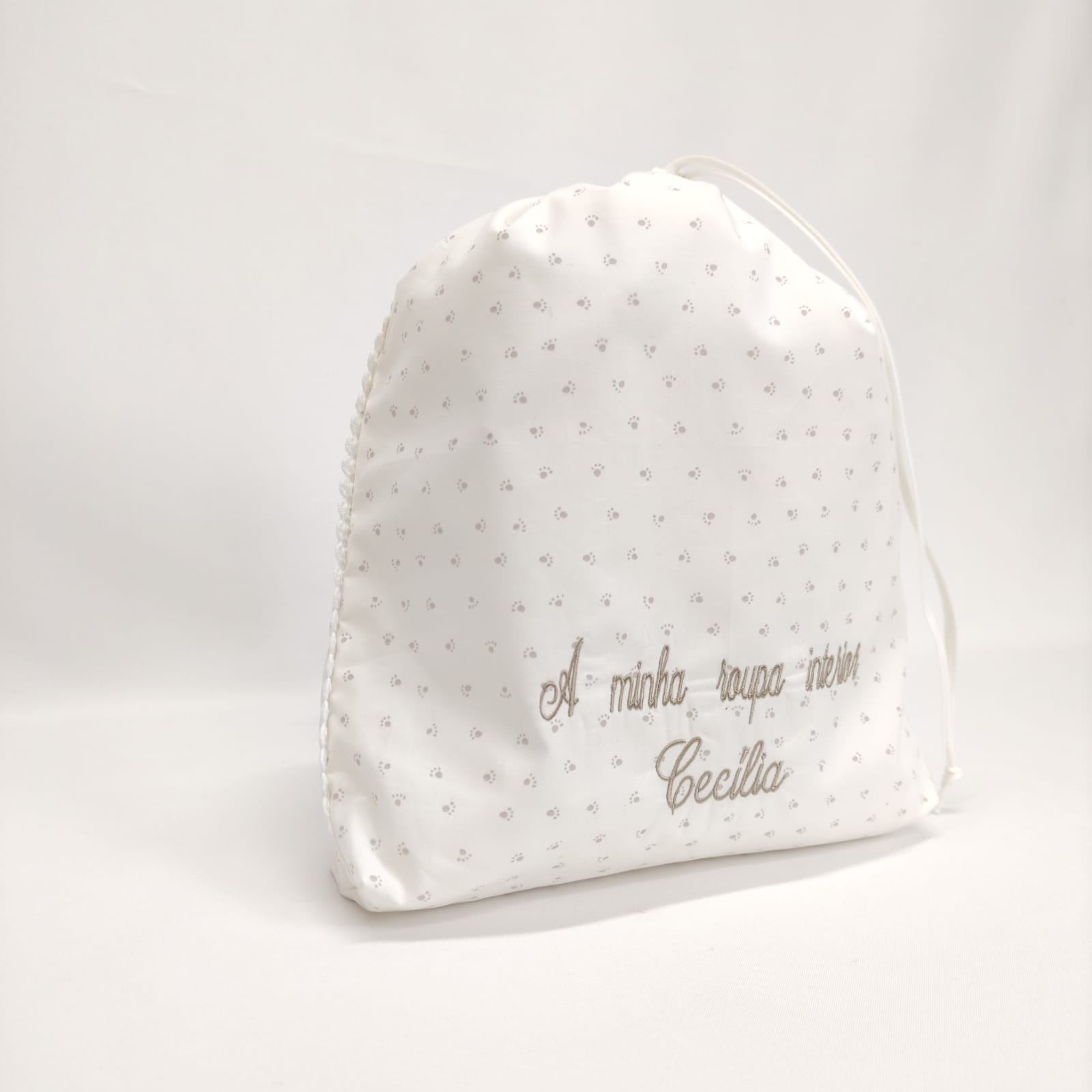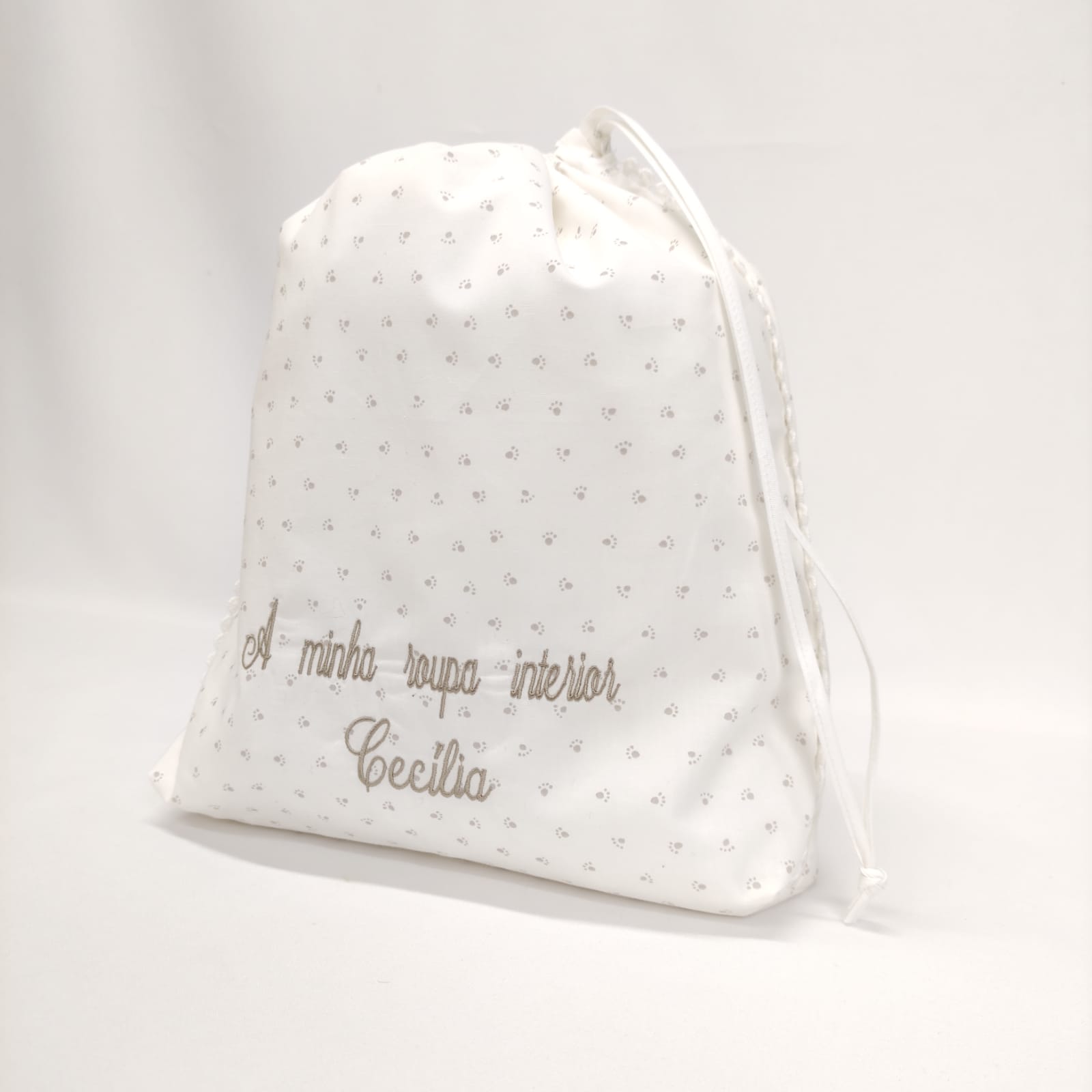 Saco em tecido de algodão padrão pegadas. Com fecho fácil em cordão, aplicação de renda pompom em branco nas laterais. Possibilidade de aplicação de bordado.