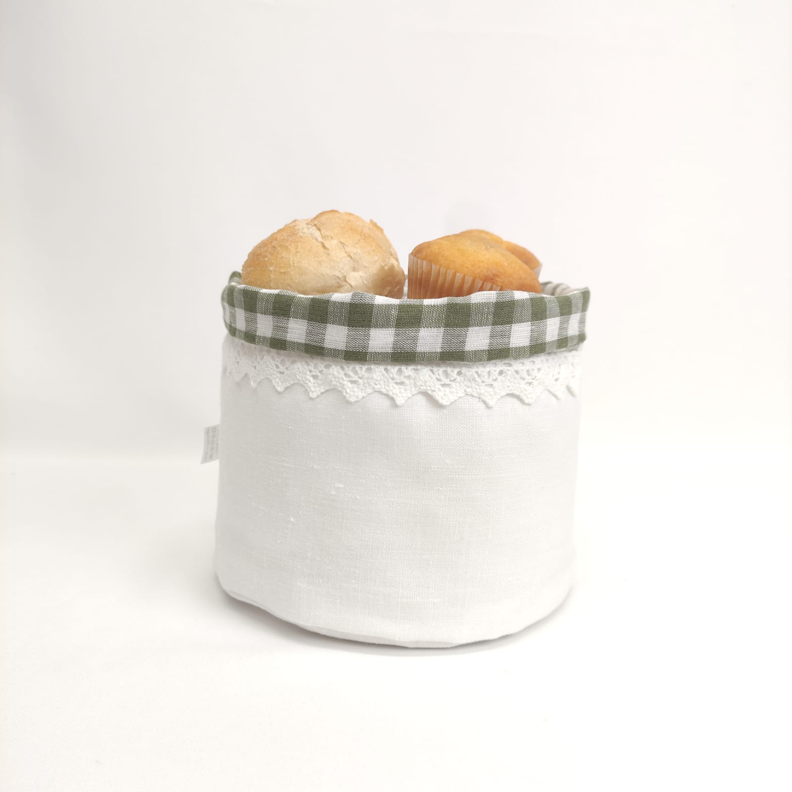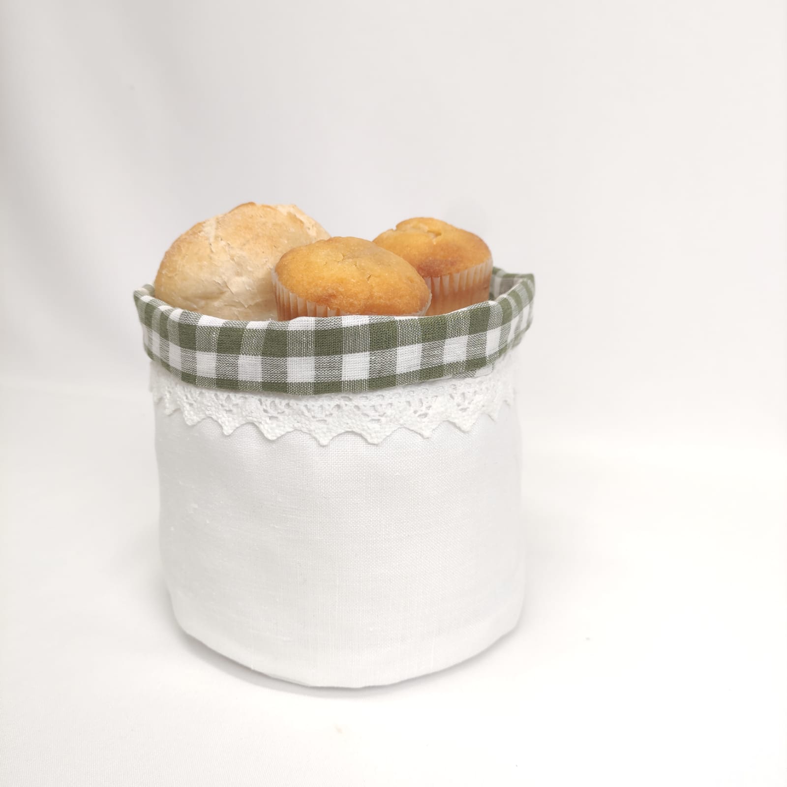 Coleção Vichy Verde: Saco de pão em linho branco e vichy verde, acabamento com aplicação de renda em branco.