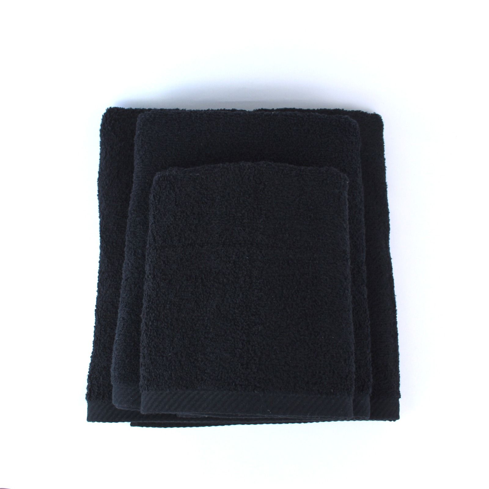Conjunto de três toalhas pretas empilhadas sobre fundo branco