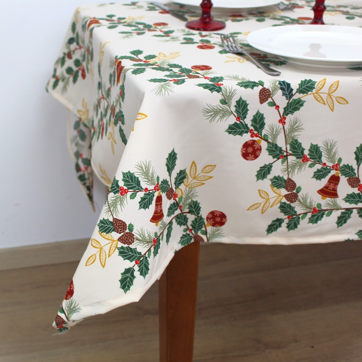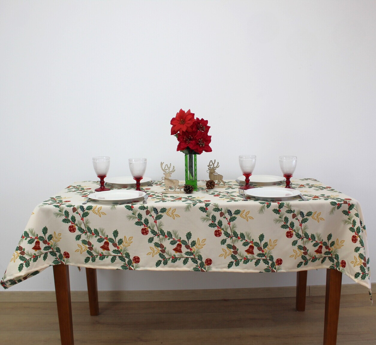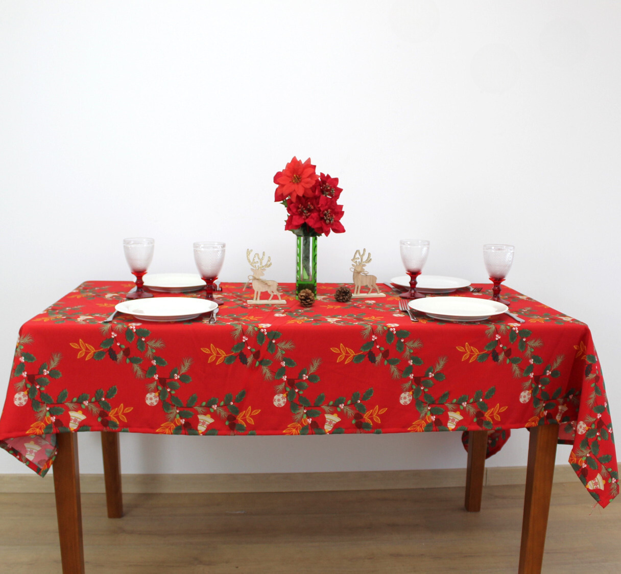 Toalha de mesa com padrões natalícios. Dísponivel na cor vermelha ou bege.
