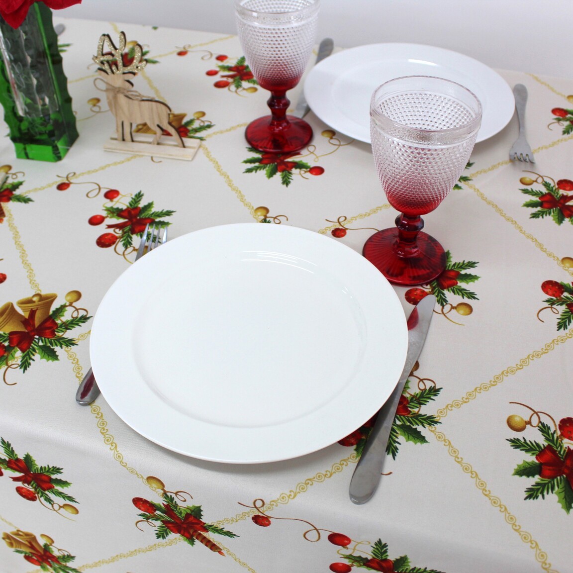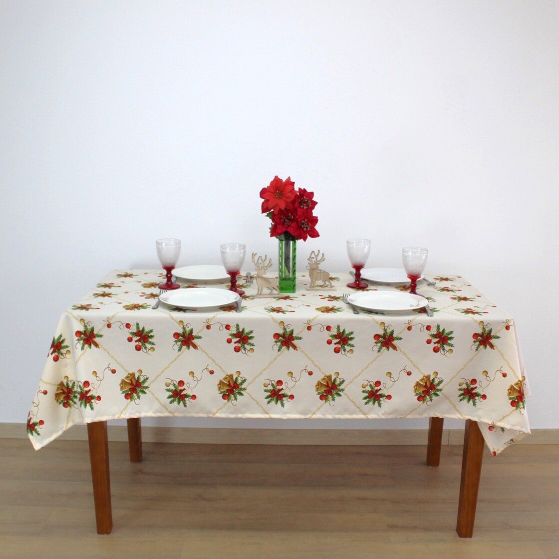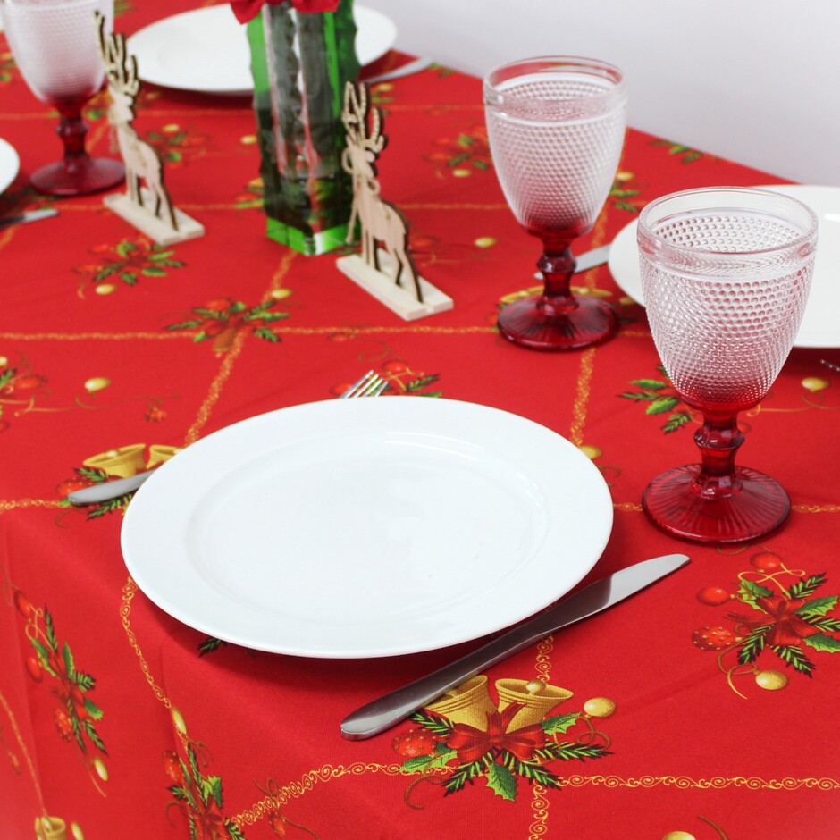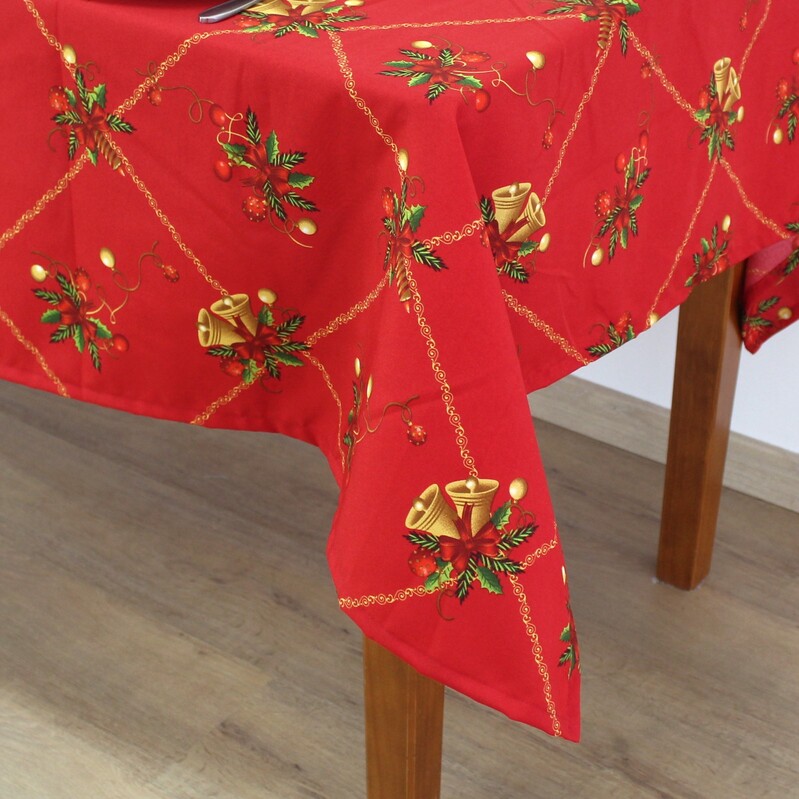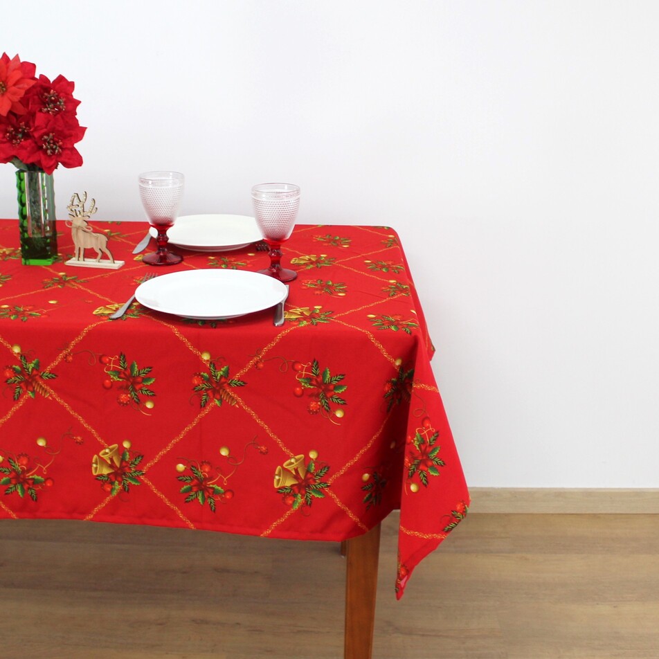 Toalha de mesa com padrões natalícios. Dísponivel na cor vermelha ou bege.