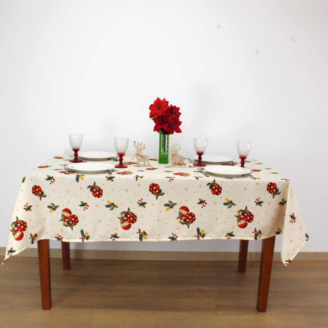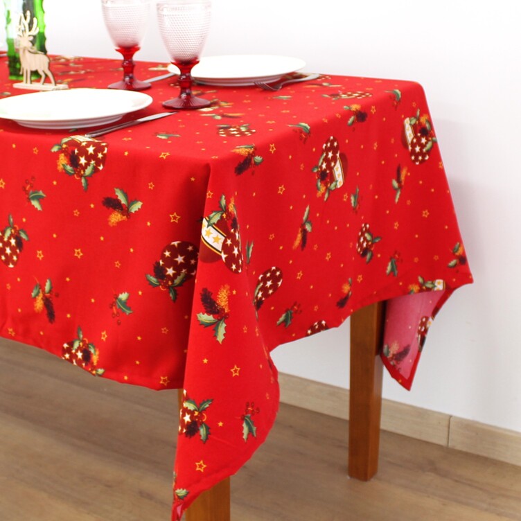 Toalha de mesa com padrões natalícios. Dísponivel na cor vermelha ou bege.