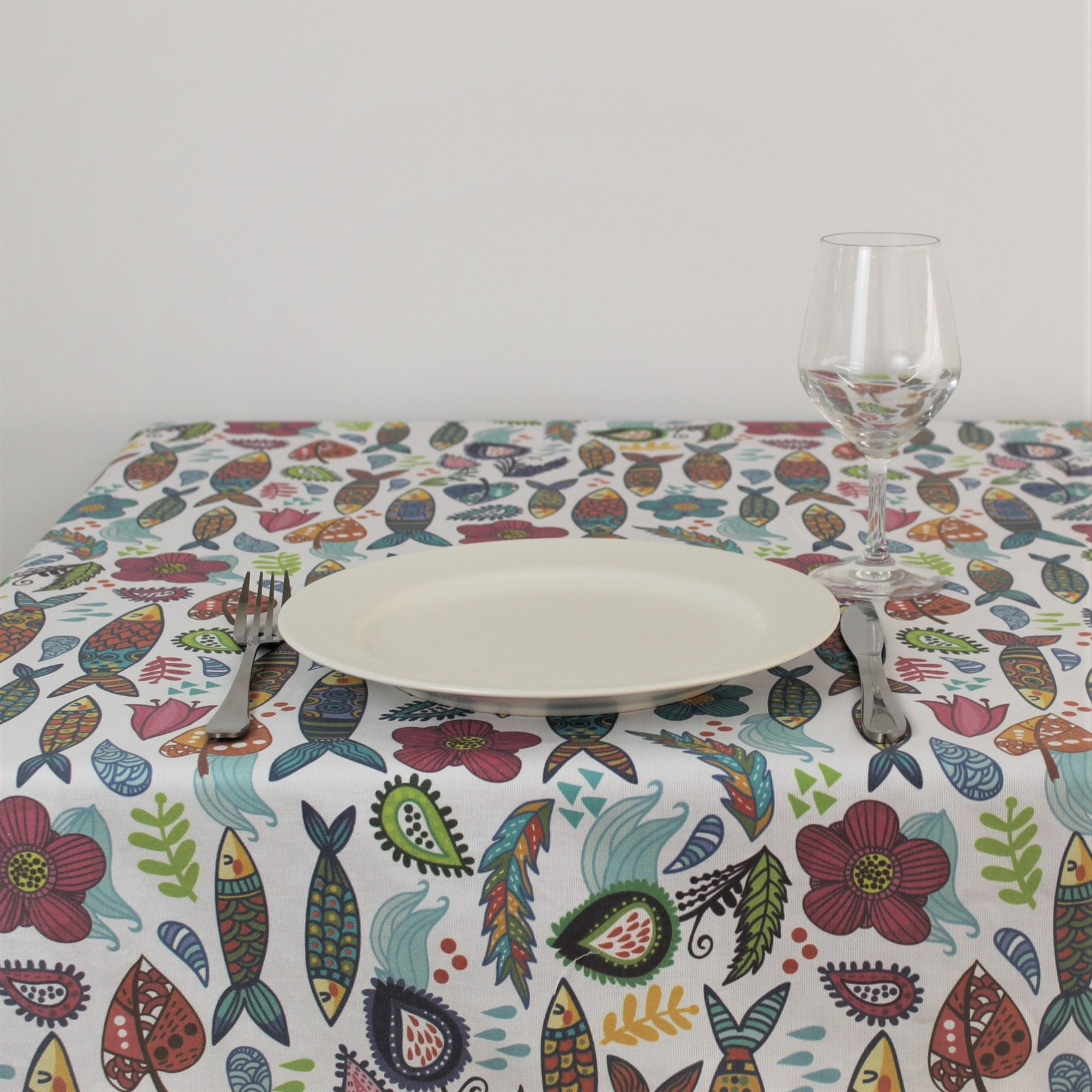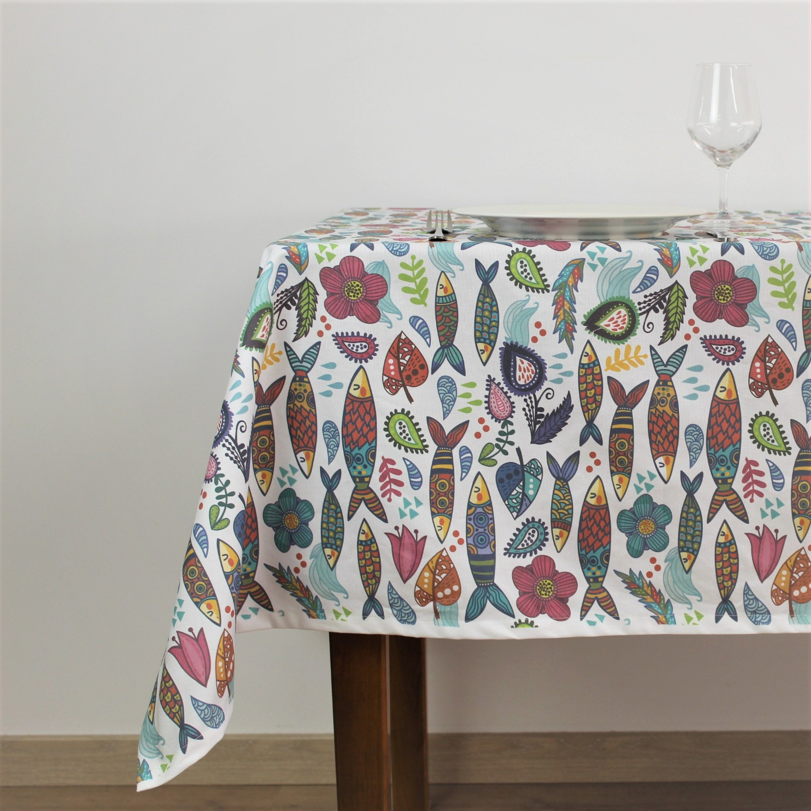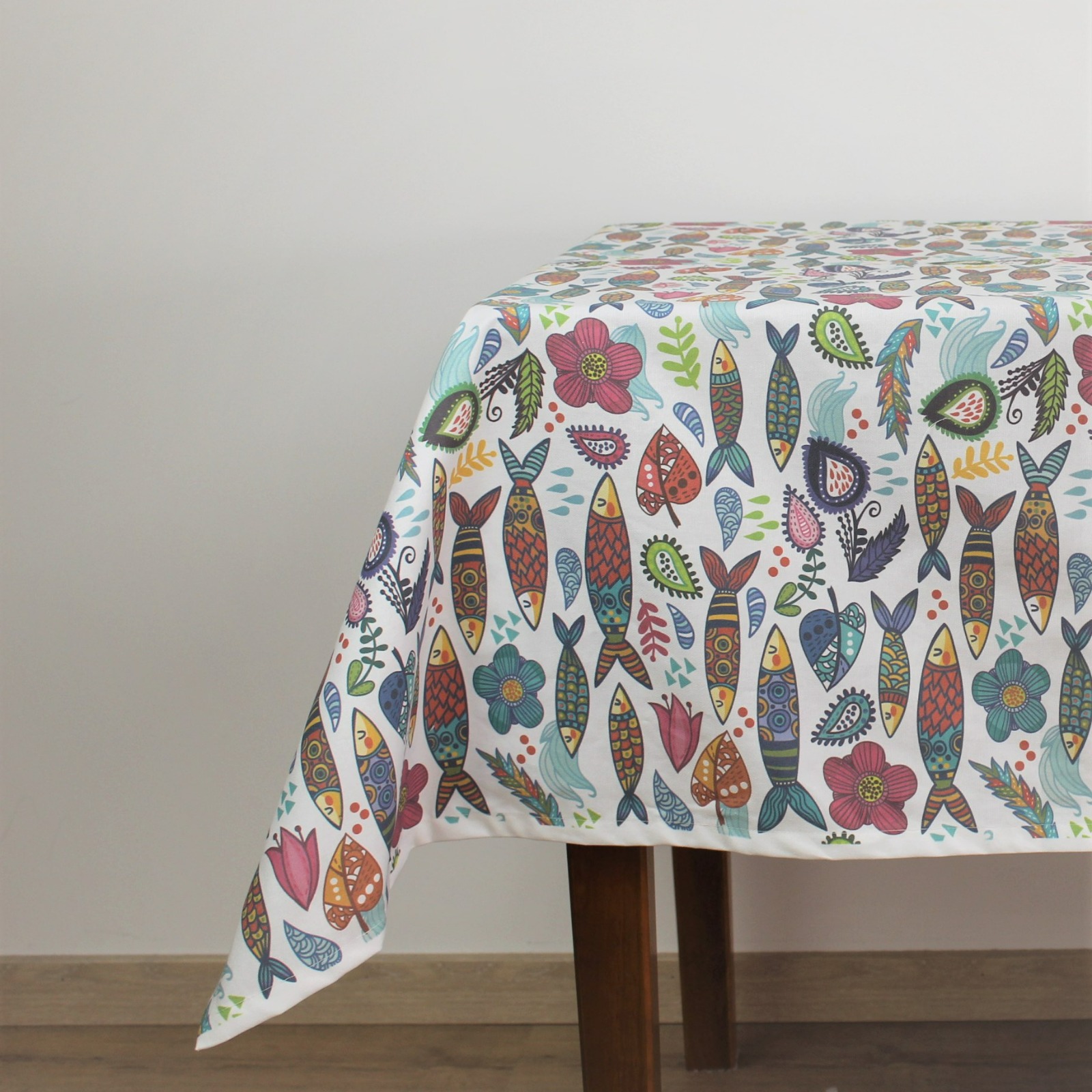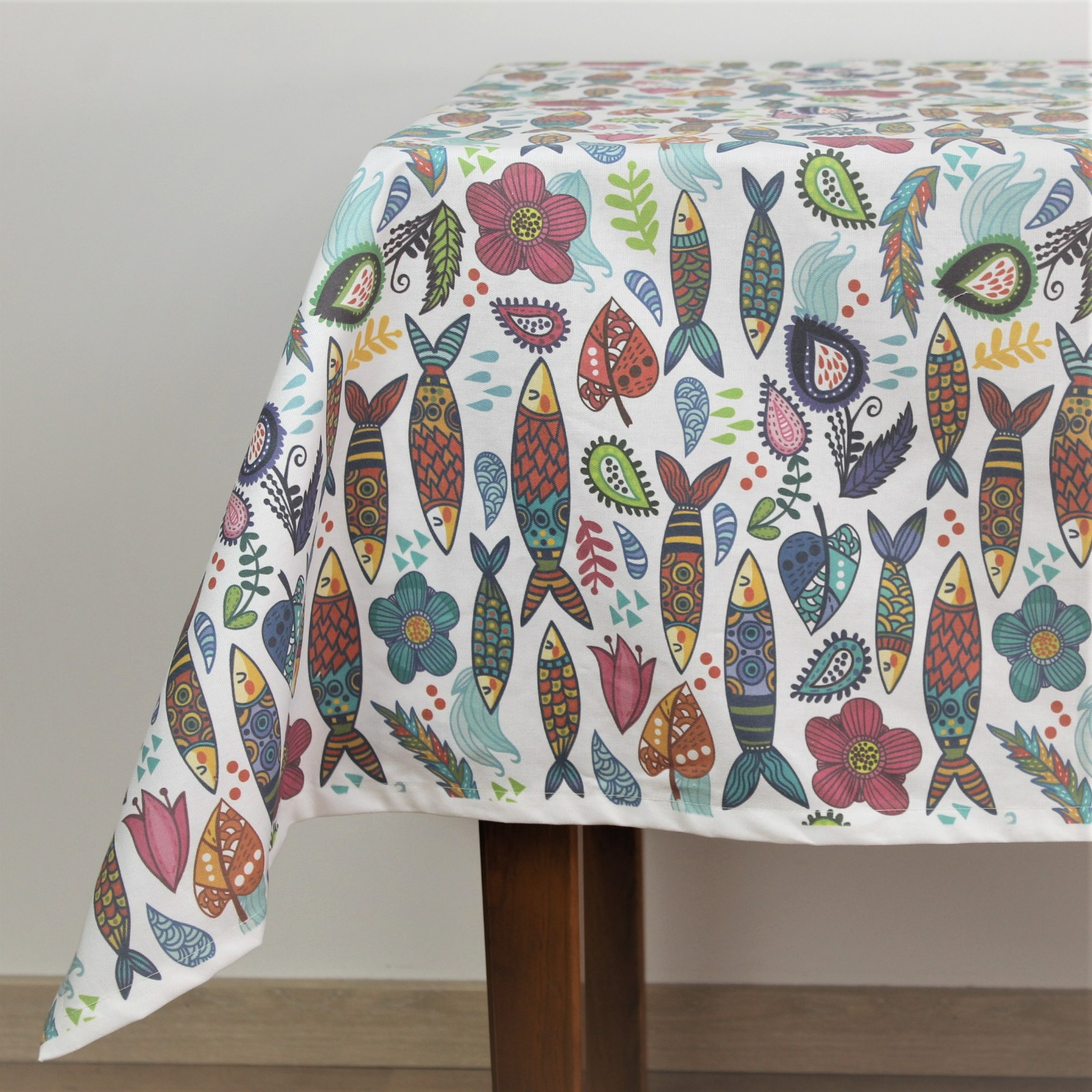 Toalha de mesa algodão com estampado digital colorido de sardinhas coloridas.