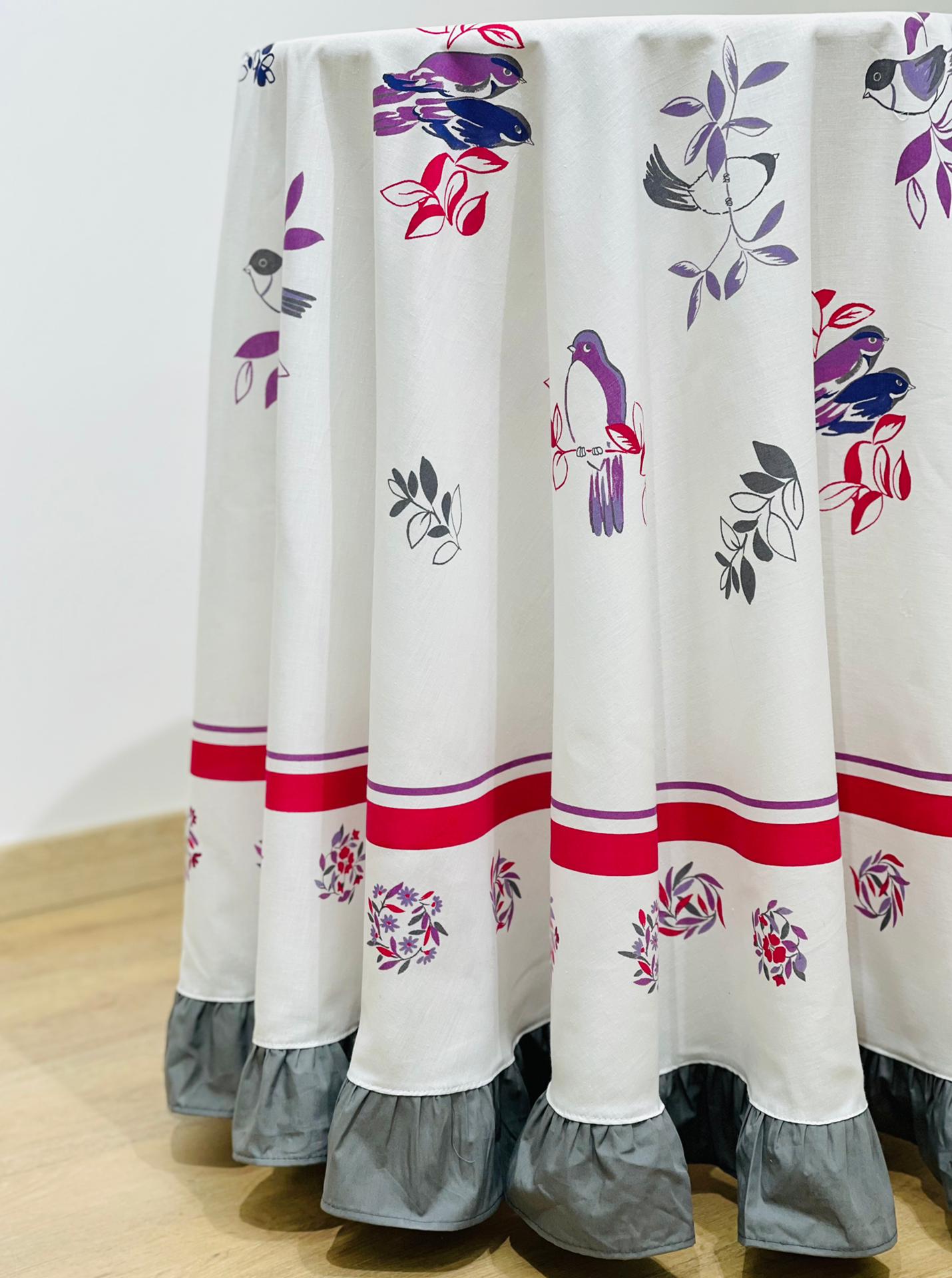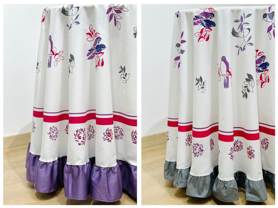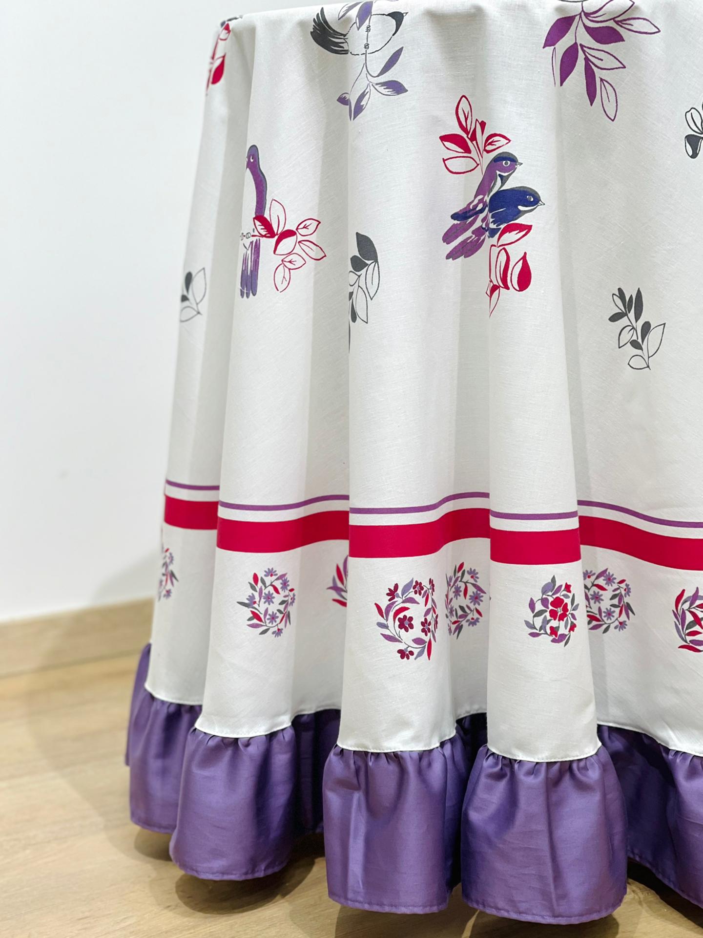Toalha de mesa redonda em algodão, com aplicação de folho opção cinza ou roxo.