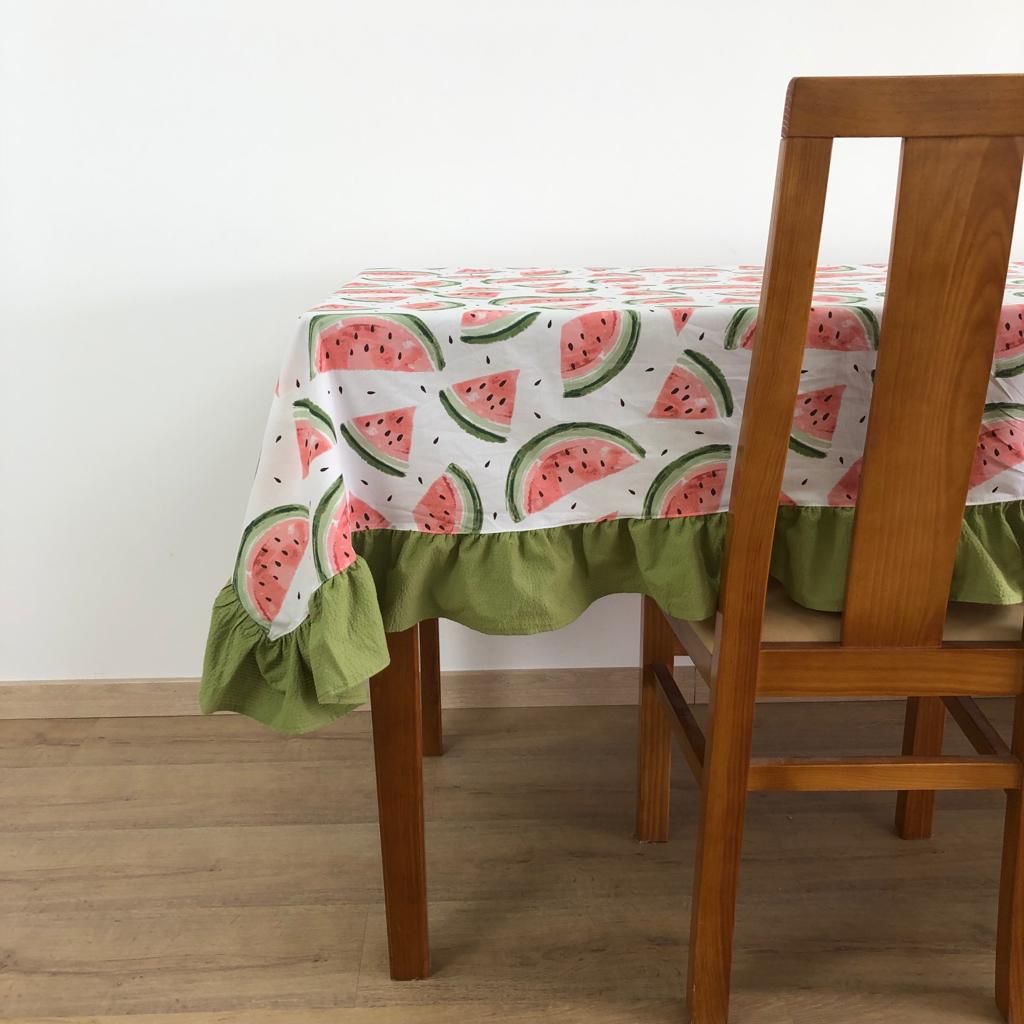 Toalha de Mesa em algodão com estampado de melancias e acabamento com folho verde.