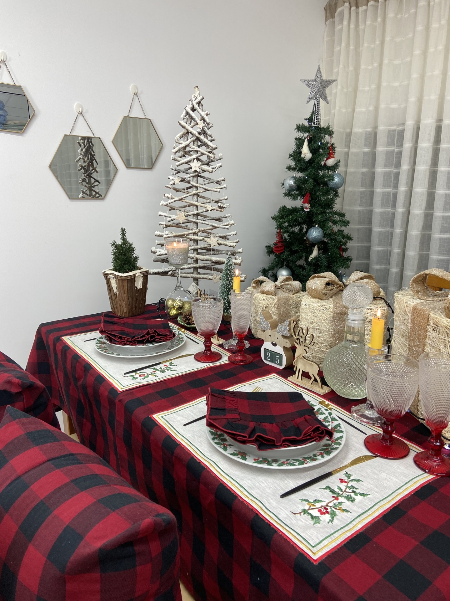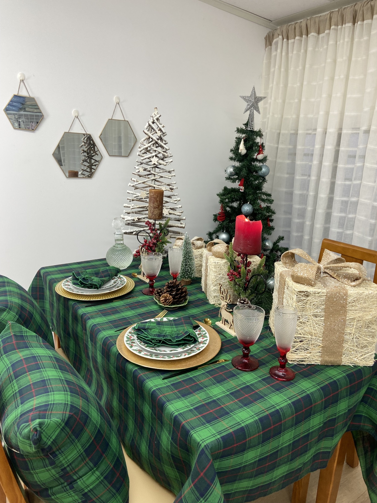 Toalha de mesa com padão natalício, ideal para a ceia de Natal. Disponível em vermelho, verde e azul.