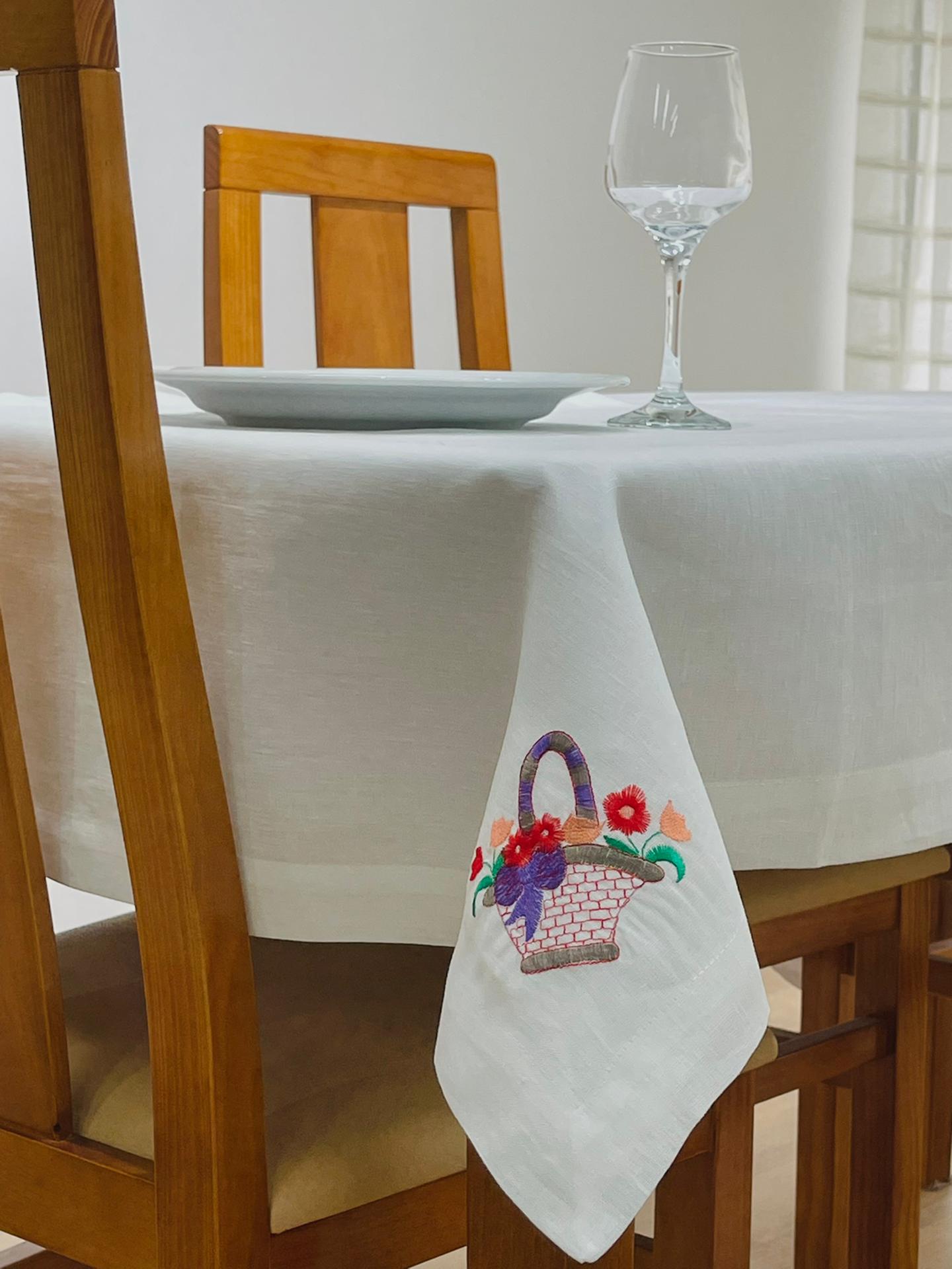 Toalha de Mesa em Linho com bordado de Cesta de Flores