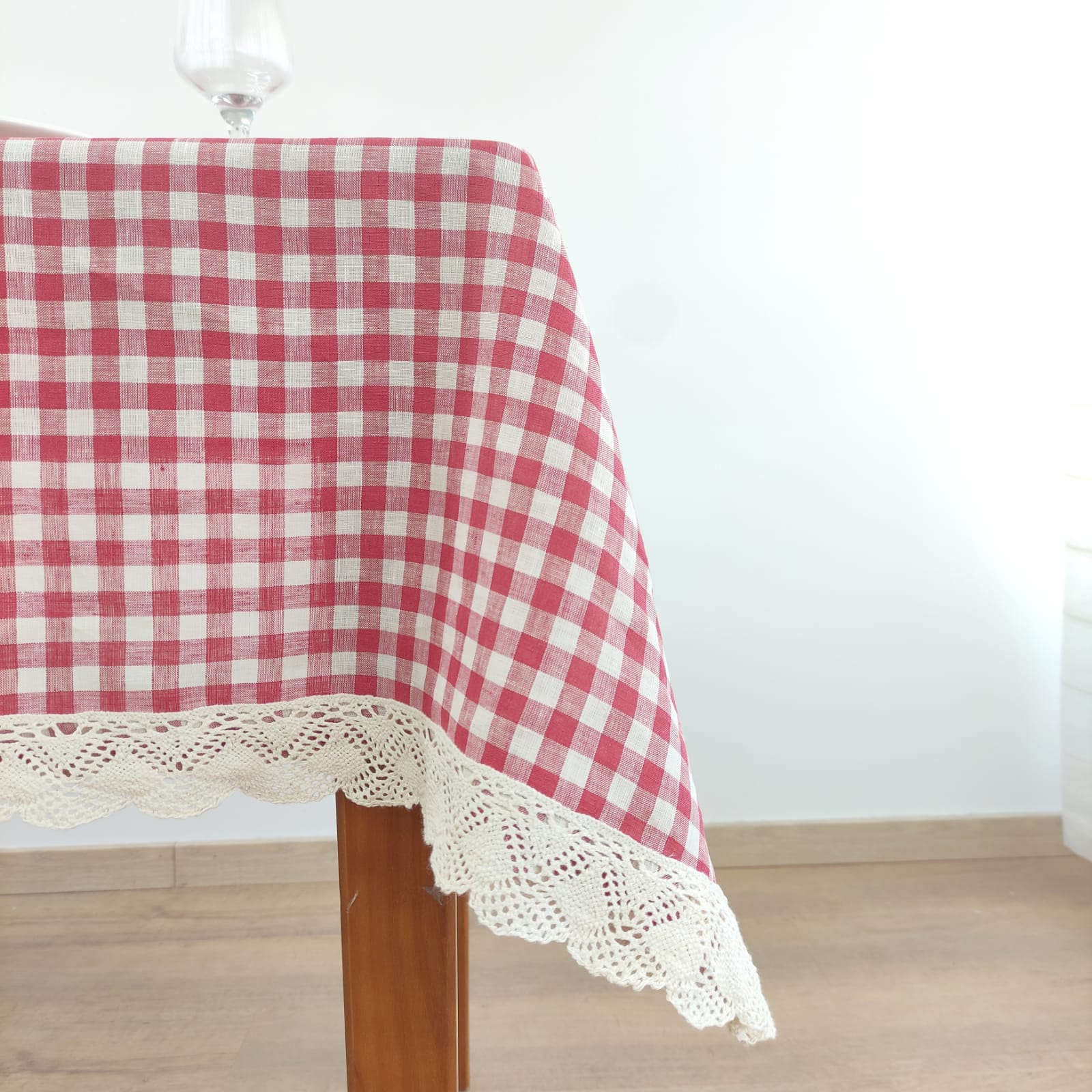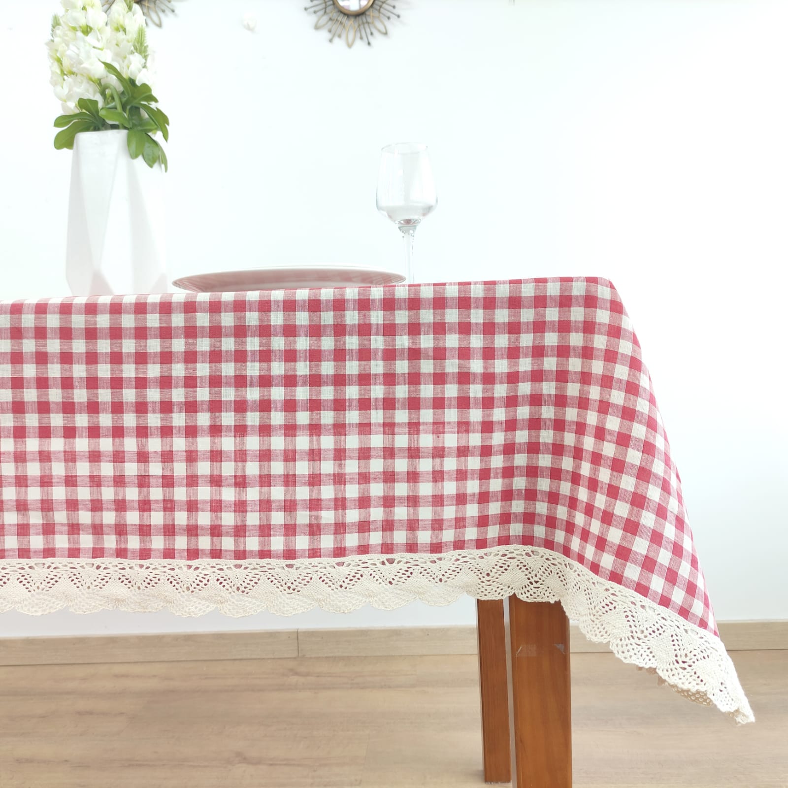 Toalha de mesa em linho com acabamento com aplicação de renda bege.