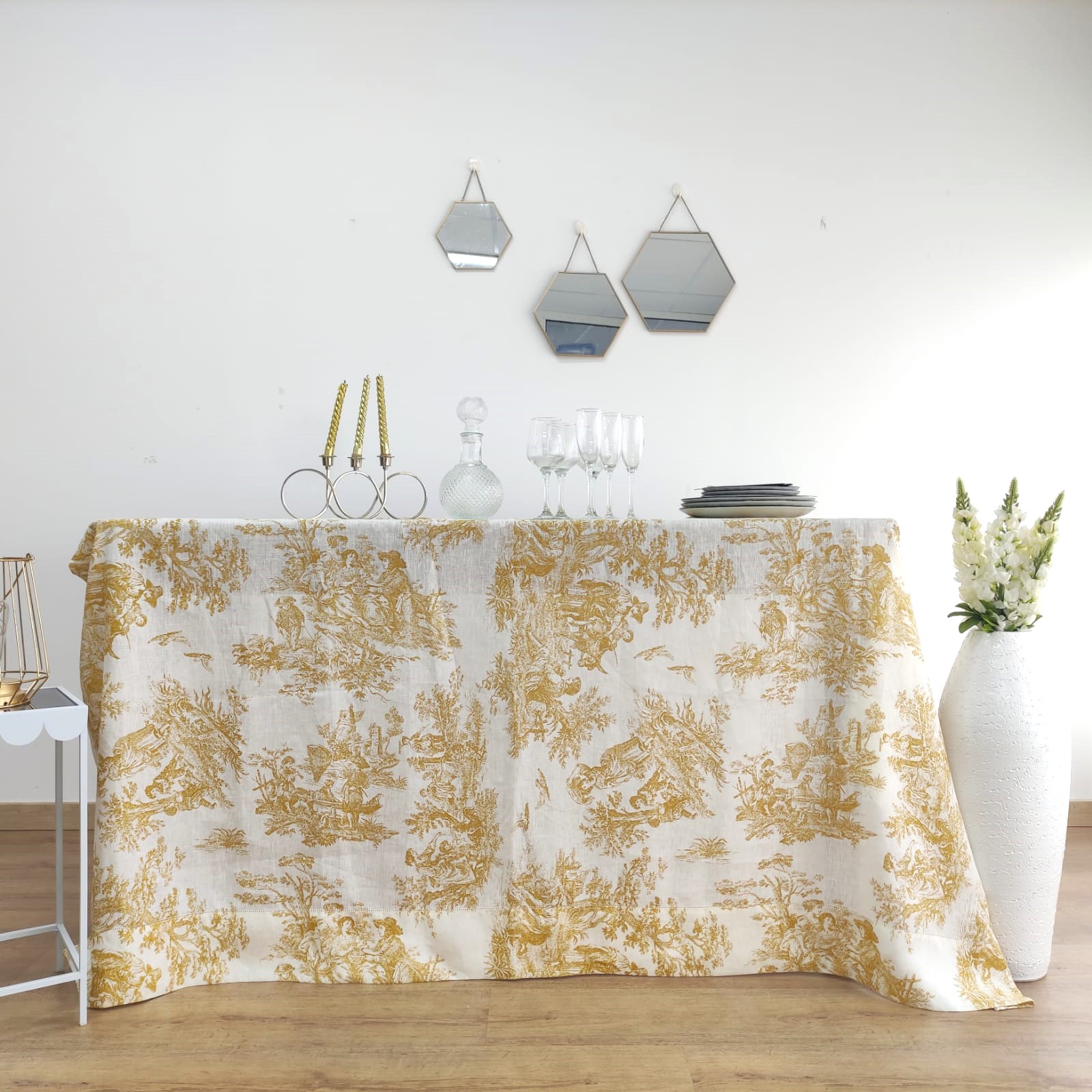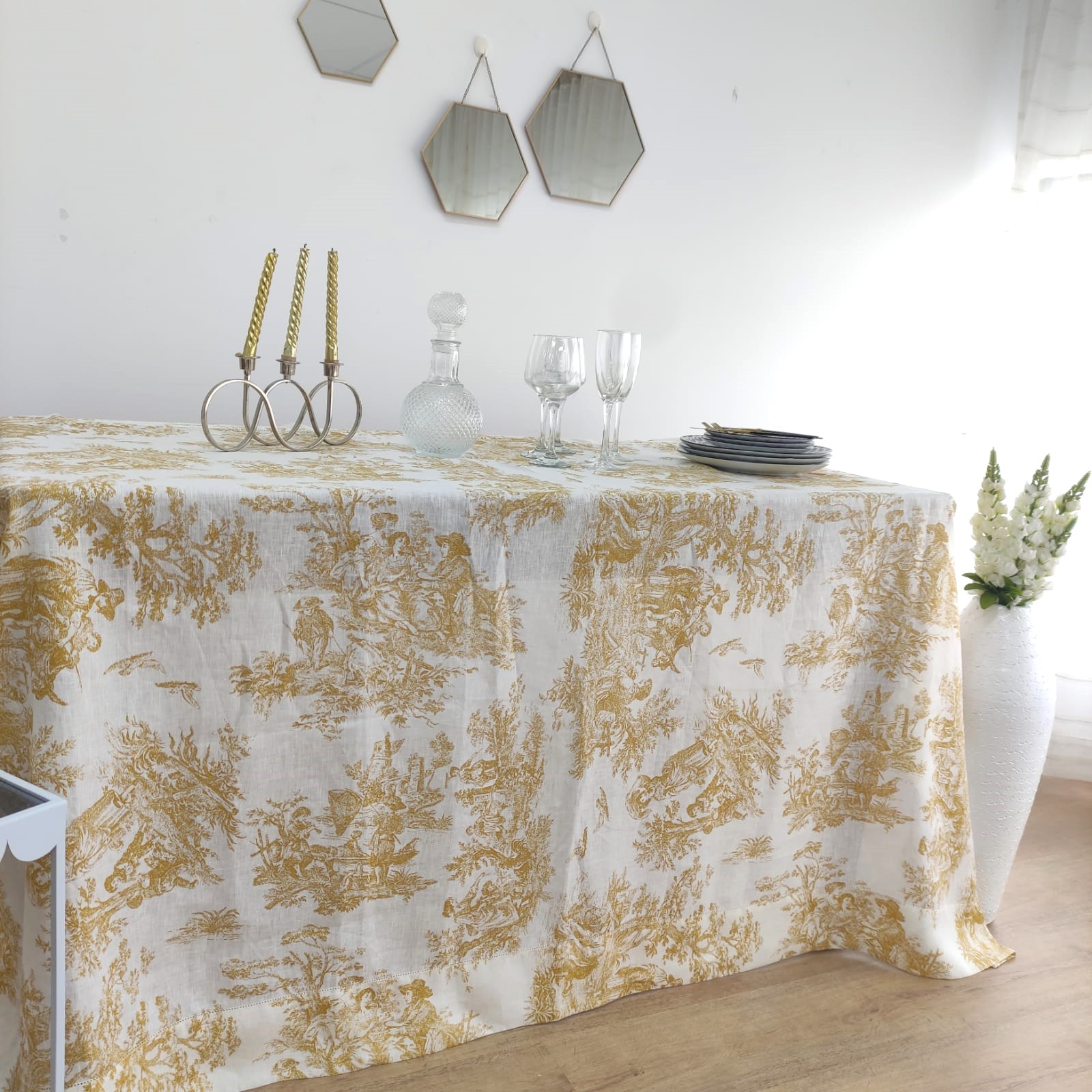 Toalha de mesa em linho toile de jouy: a elegância de diferentes cores, medidas especiais e acabamentos exclussivos, uma opção perfeita para adicionar um toque de charme ao seu evento.