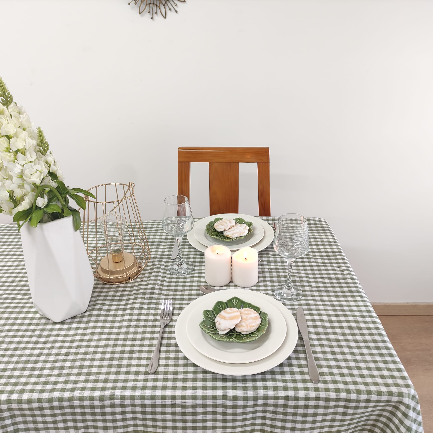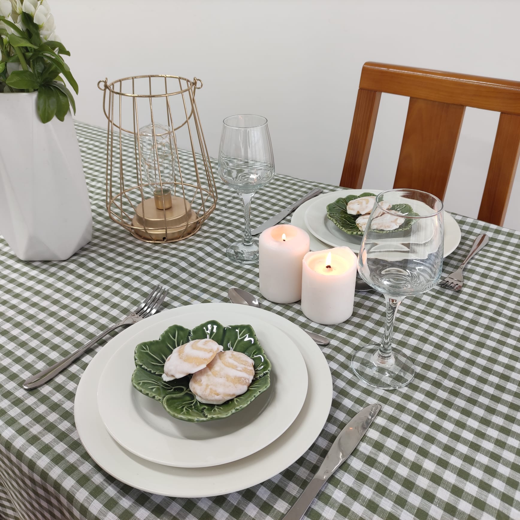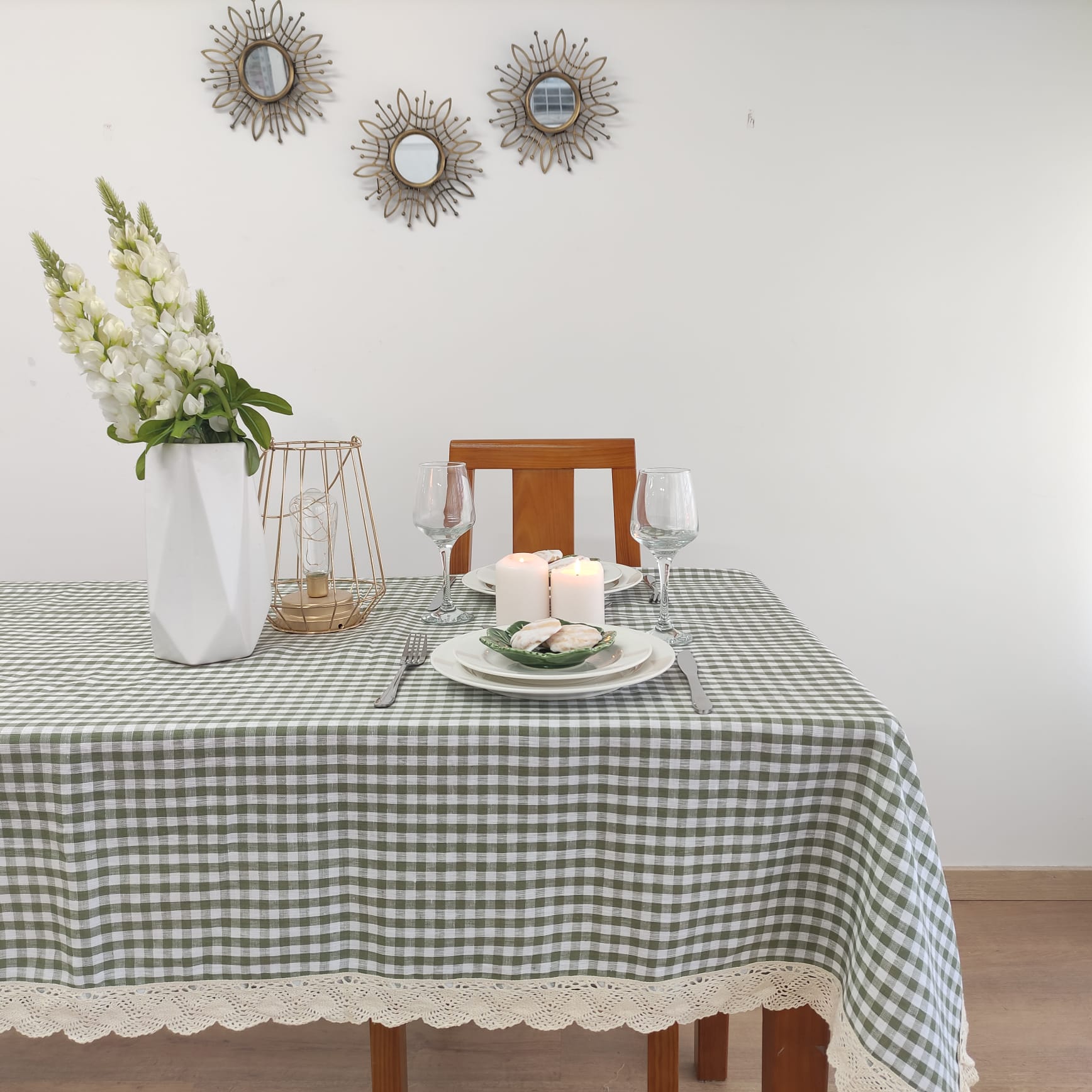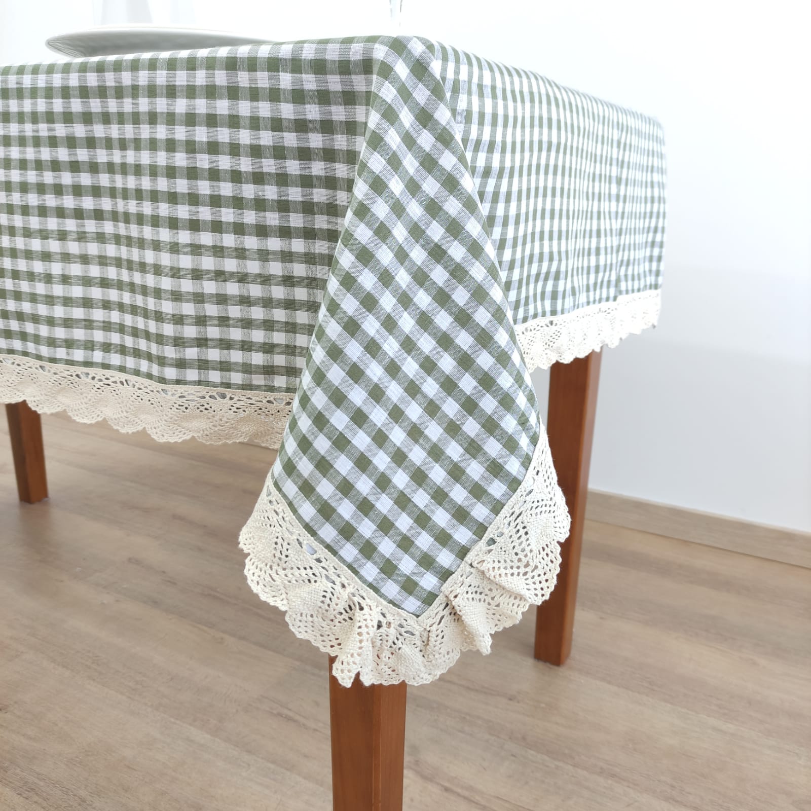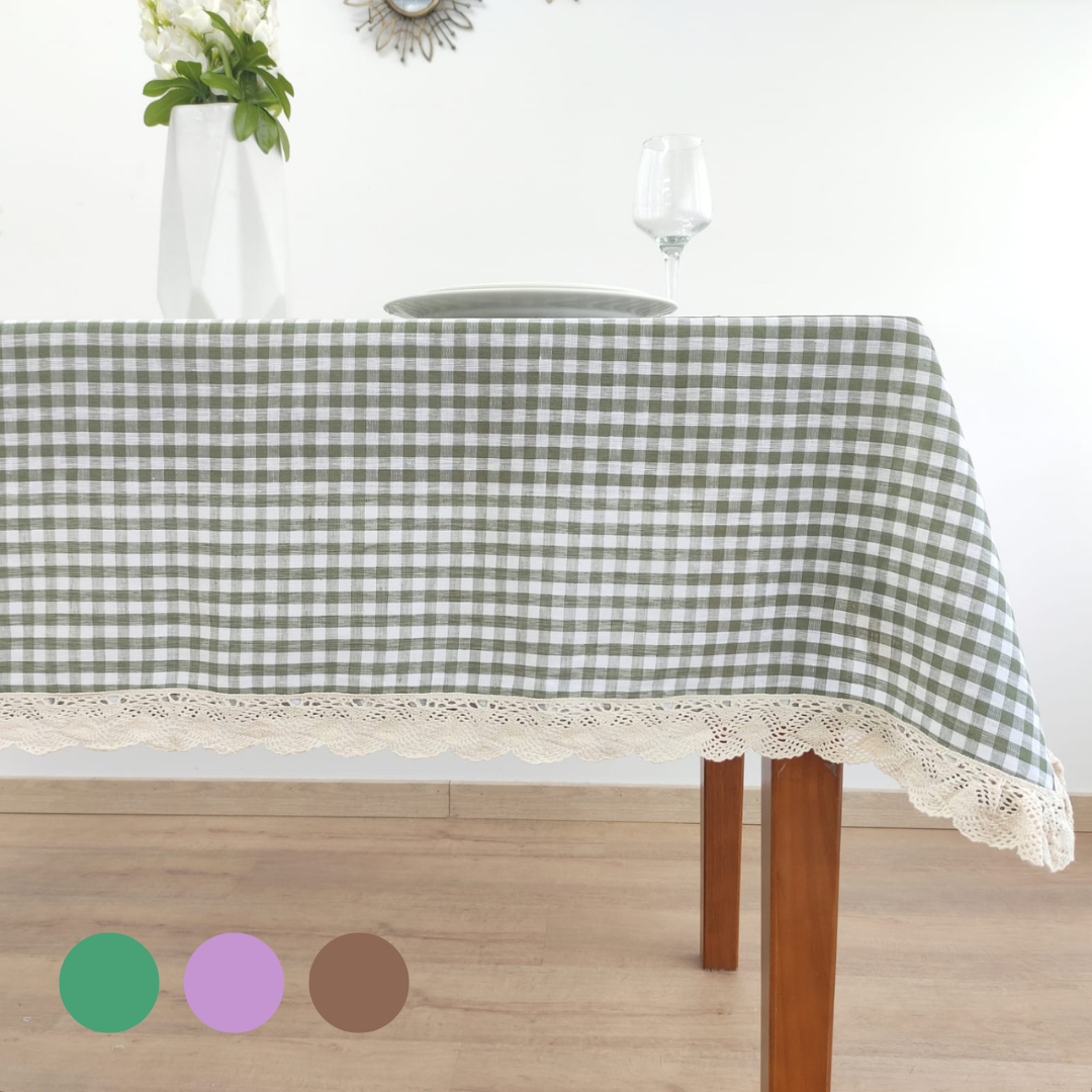 Toalha de mesa em linho com acabamento com aplicação de renda bege. Disponível nas cores verde e lilás e castanho.