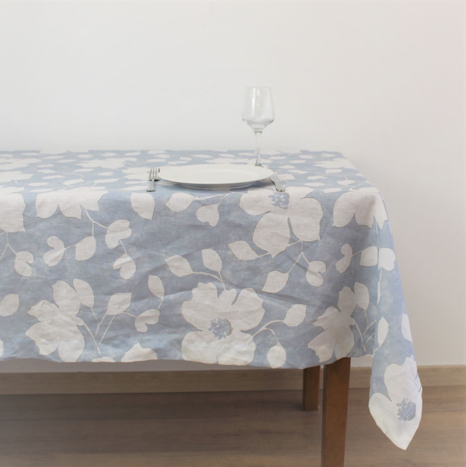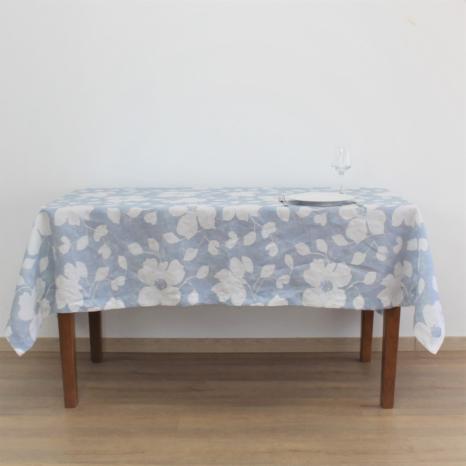 Toalha de mesa em linho azul com flores.