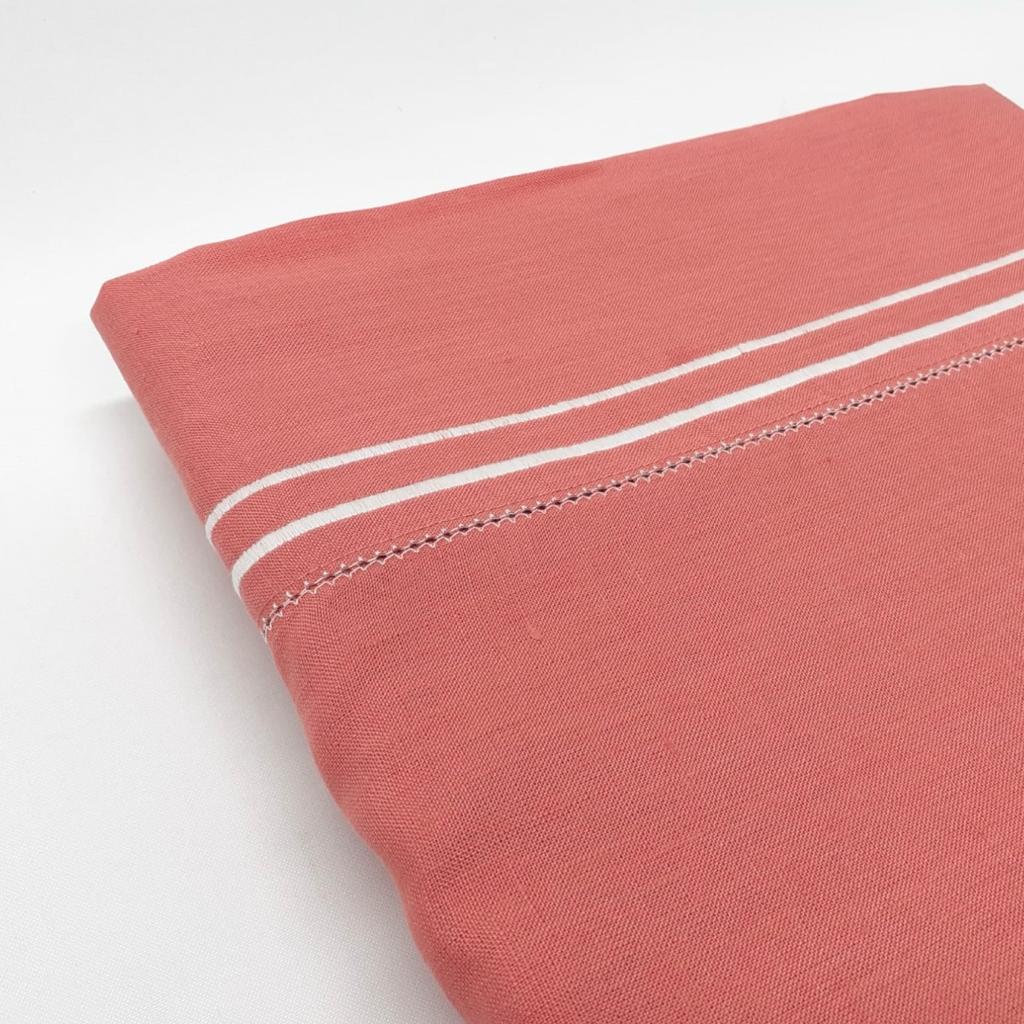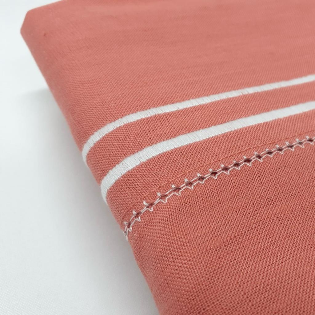 Toalha de mesa em linho com acabamento de ponto aberto e dois rolinhos em linha branca.