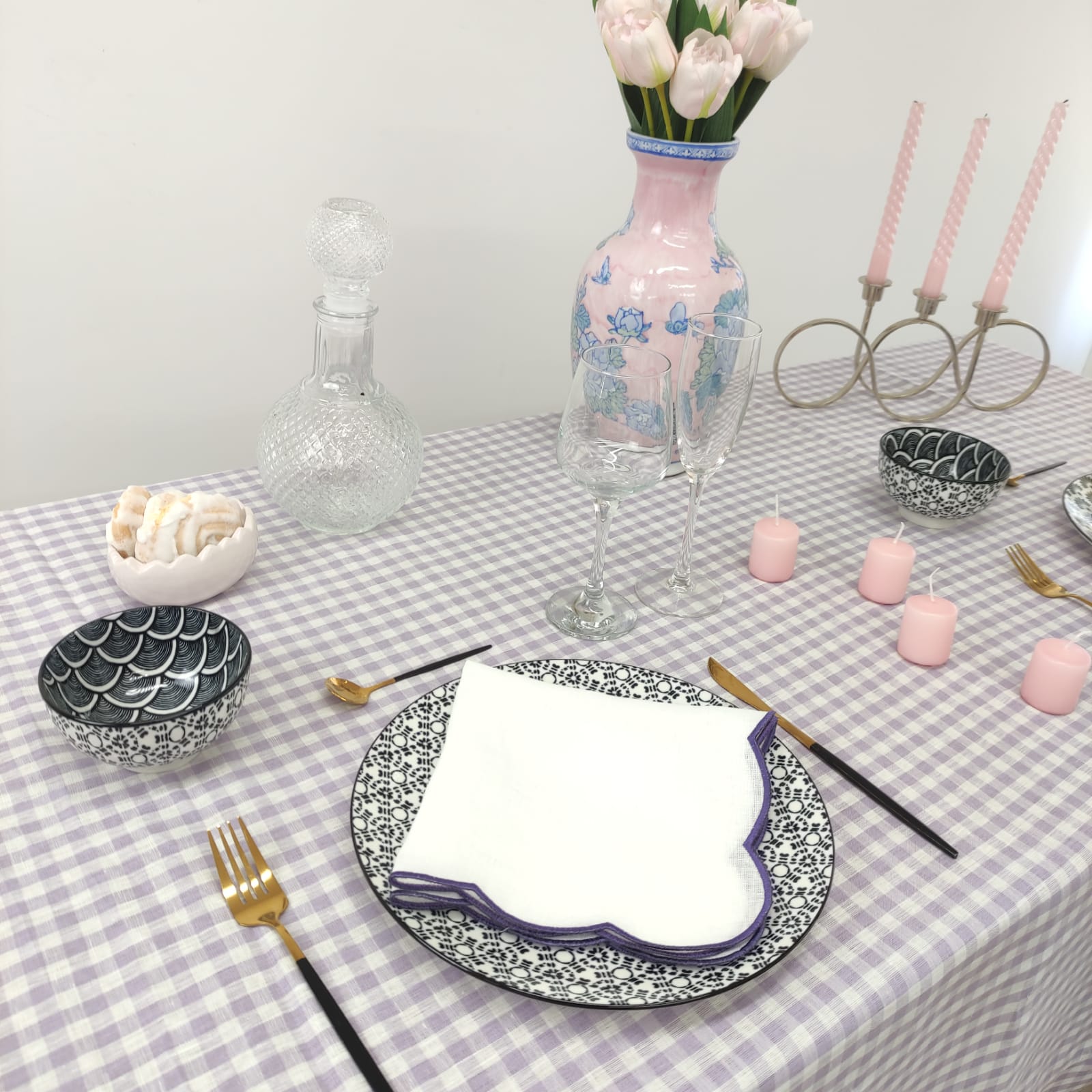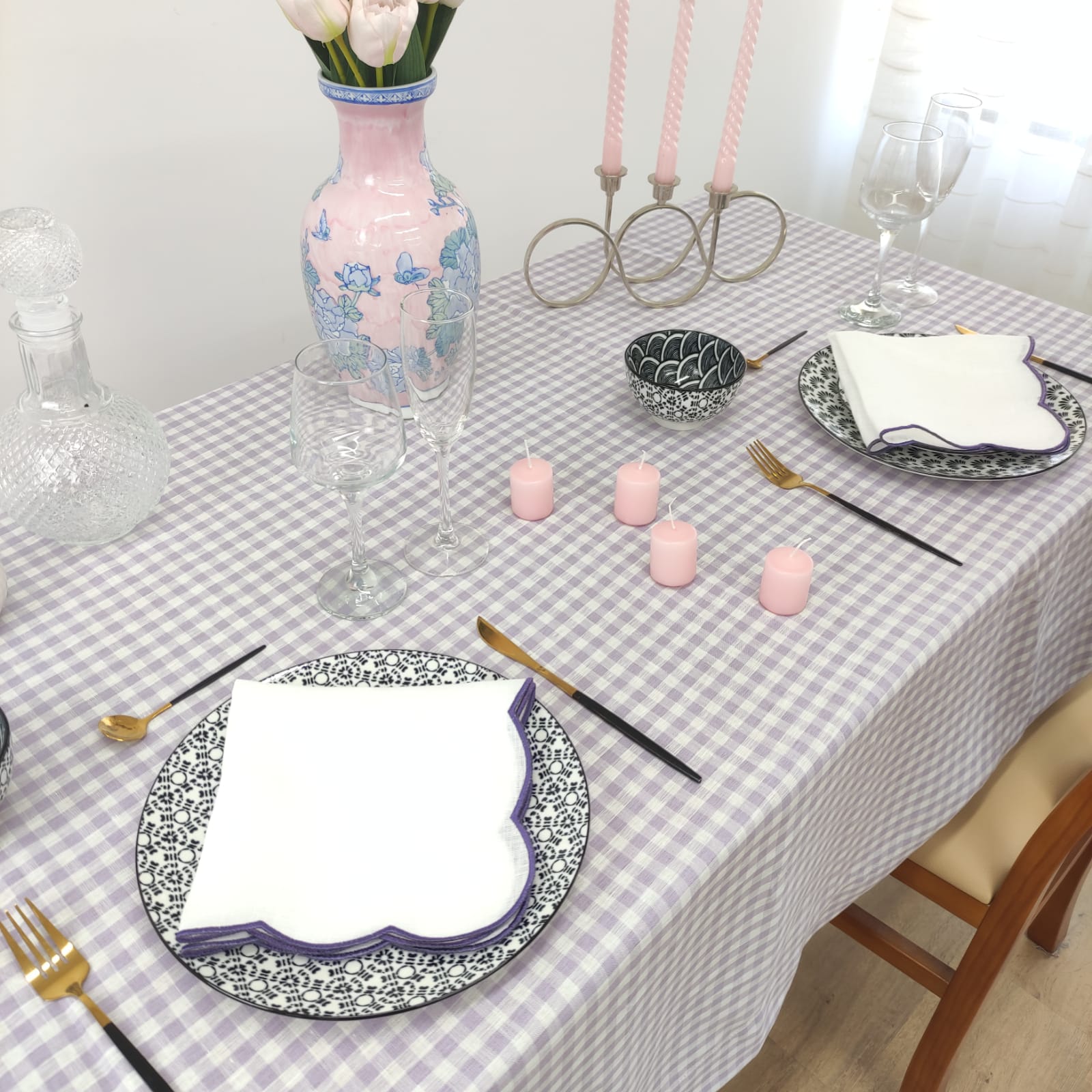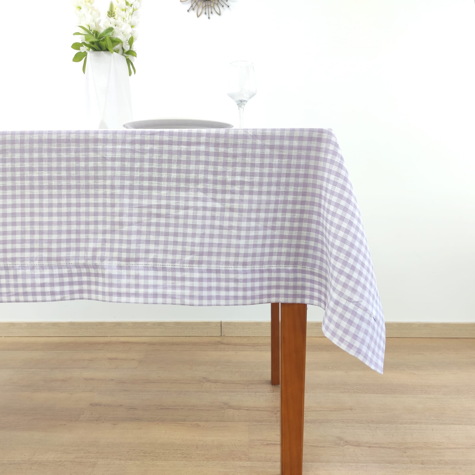 Toalha de mesa em linho com acabamento em ponto-aberto.
