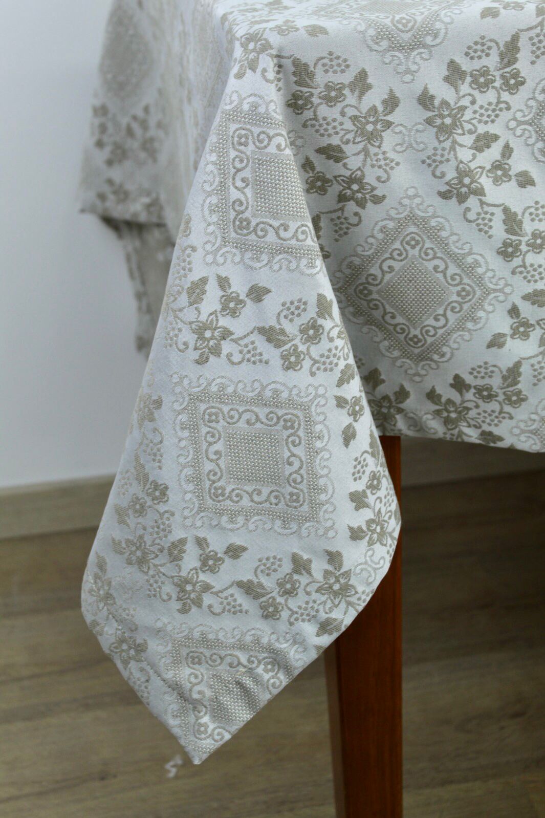 Toalha de mesa com padrão floral e losangos em tons de bege e branco.