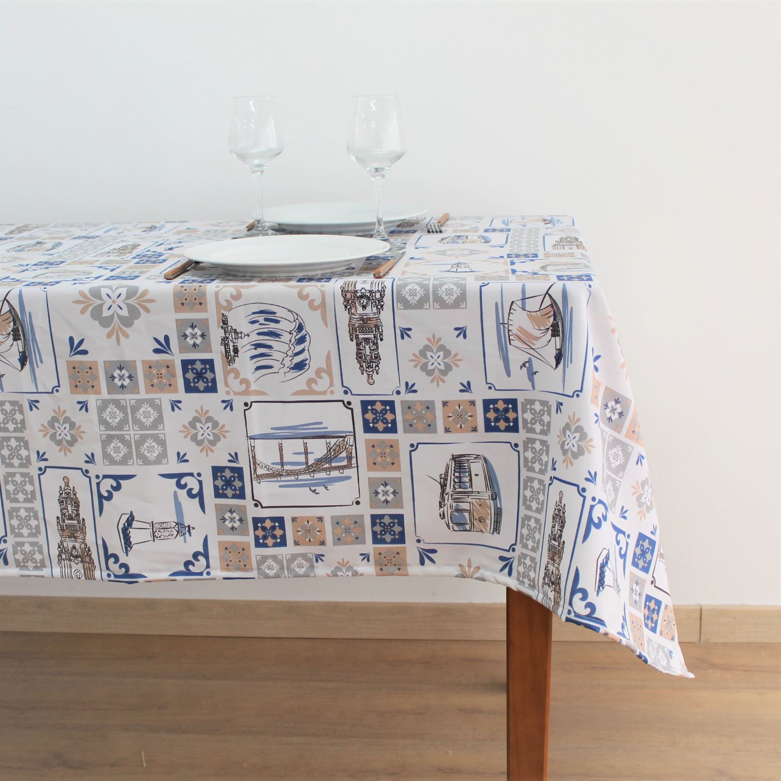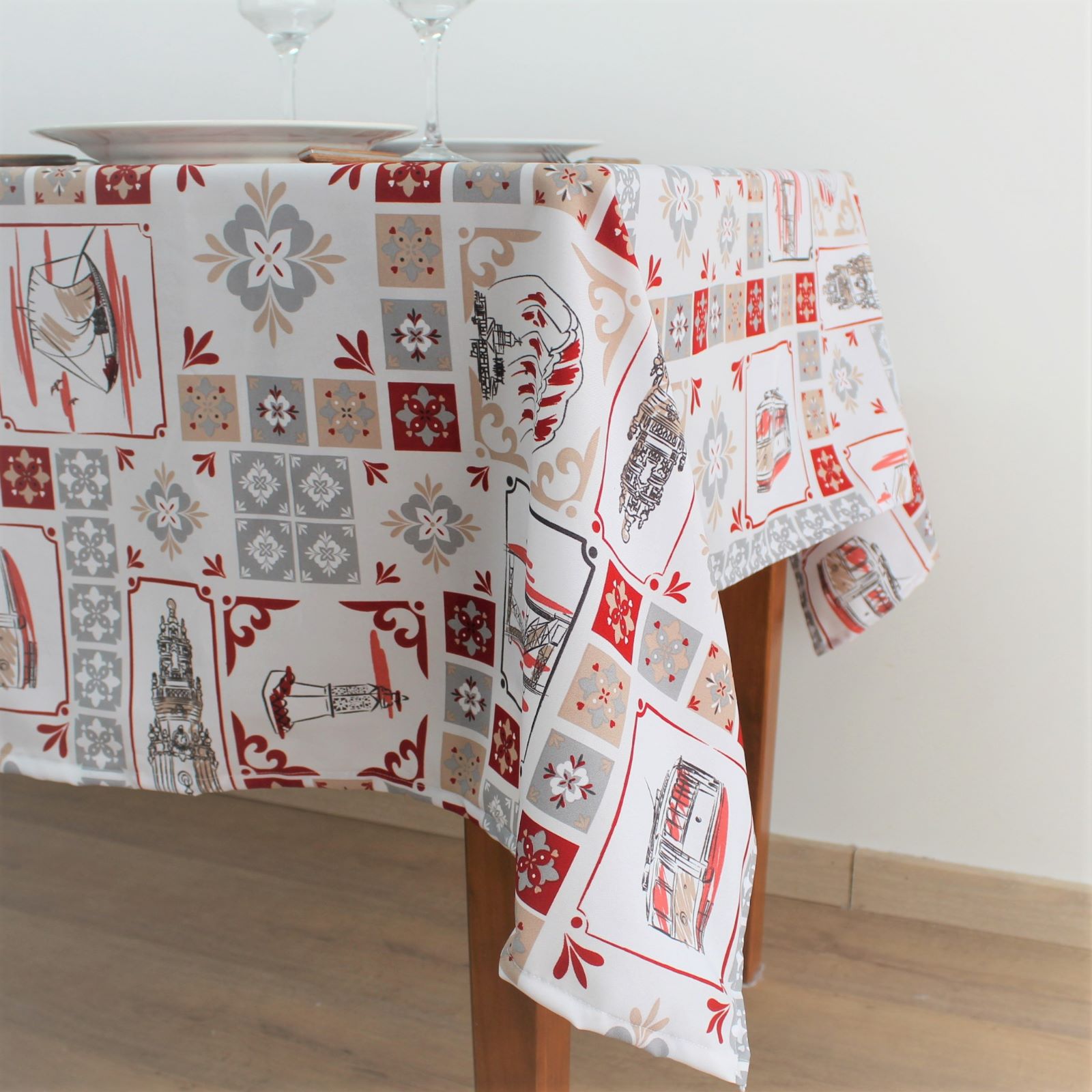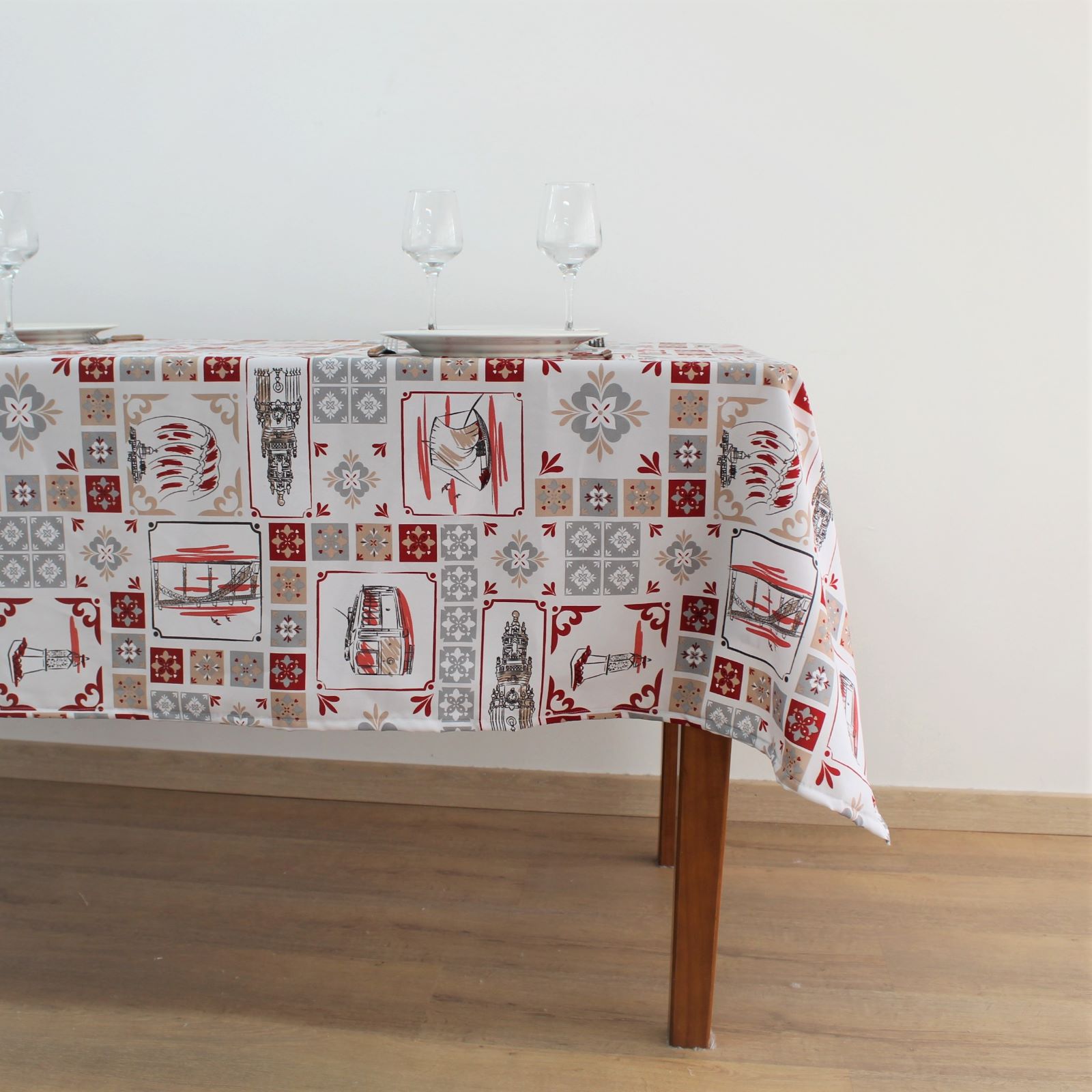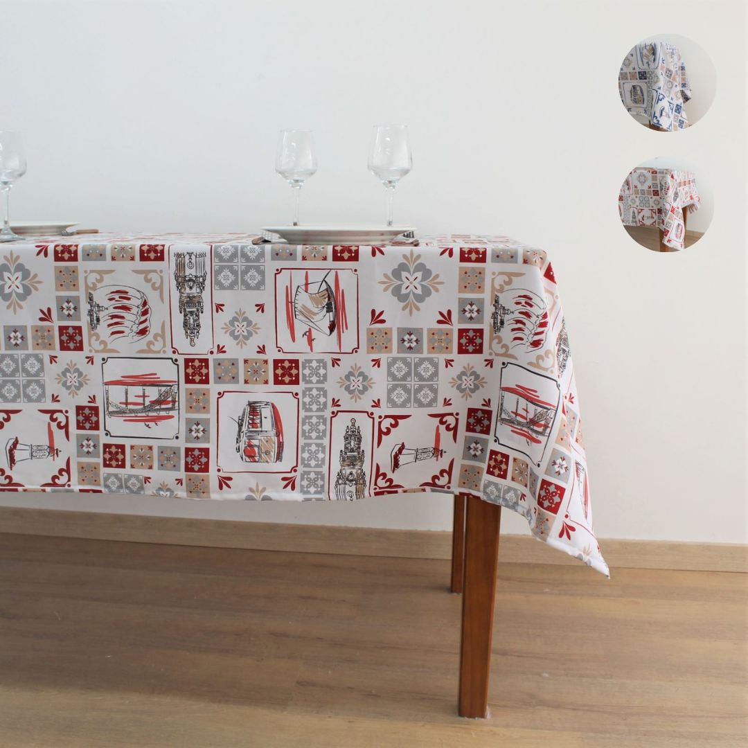 Toalha de mesa em poliéster. Padrão monumentos disponível em azul e vermelho.