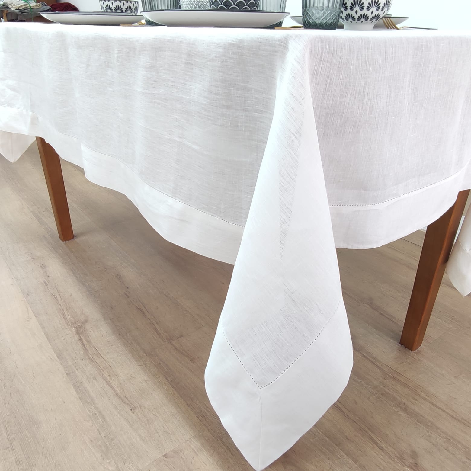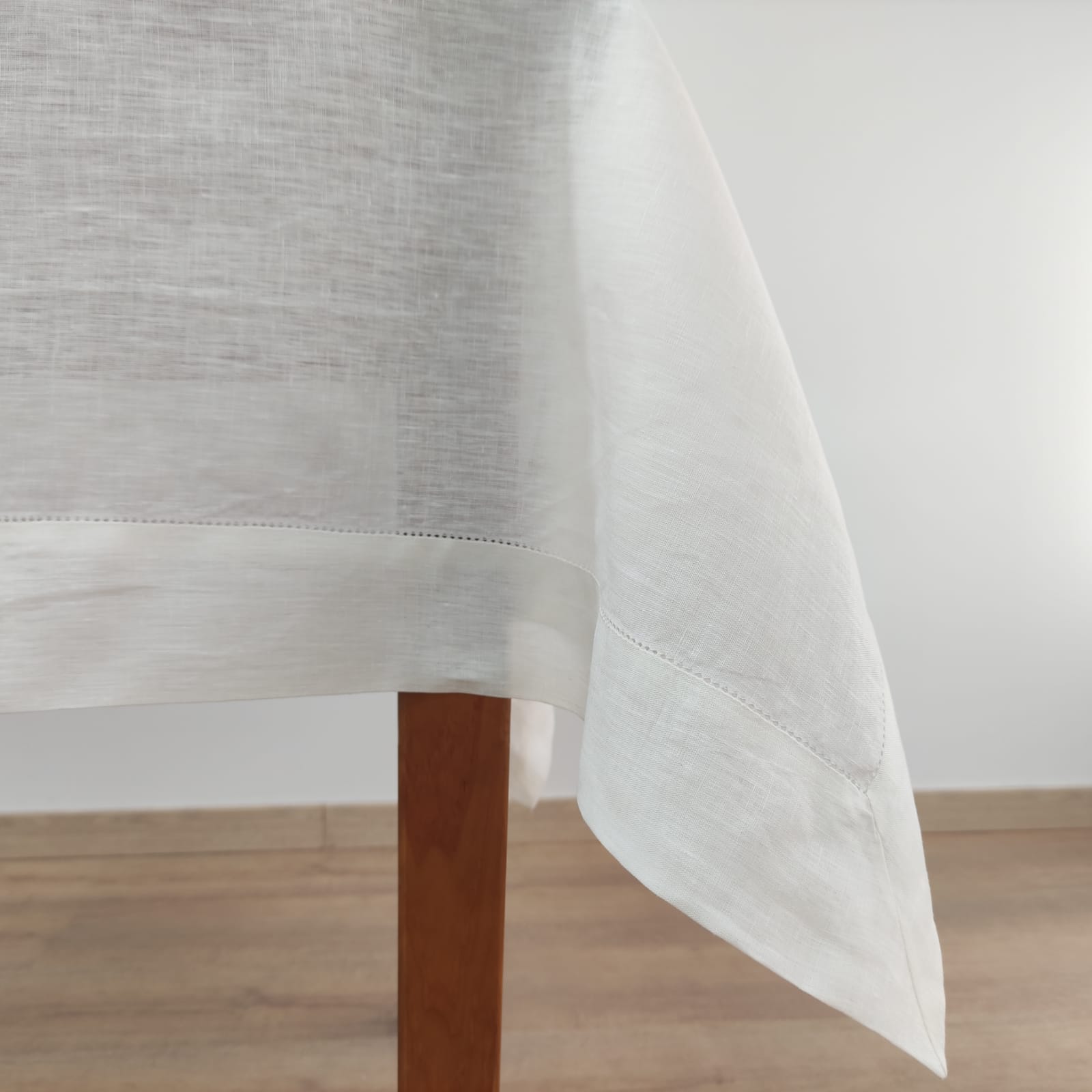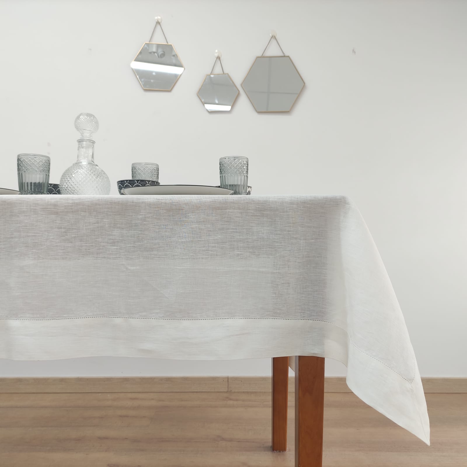 Toalha de mesa em linho com acabamento em ponto aberto. Disponível nas cores pérola e bege.