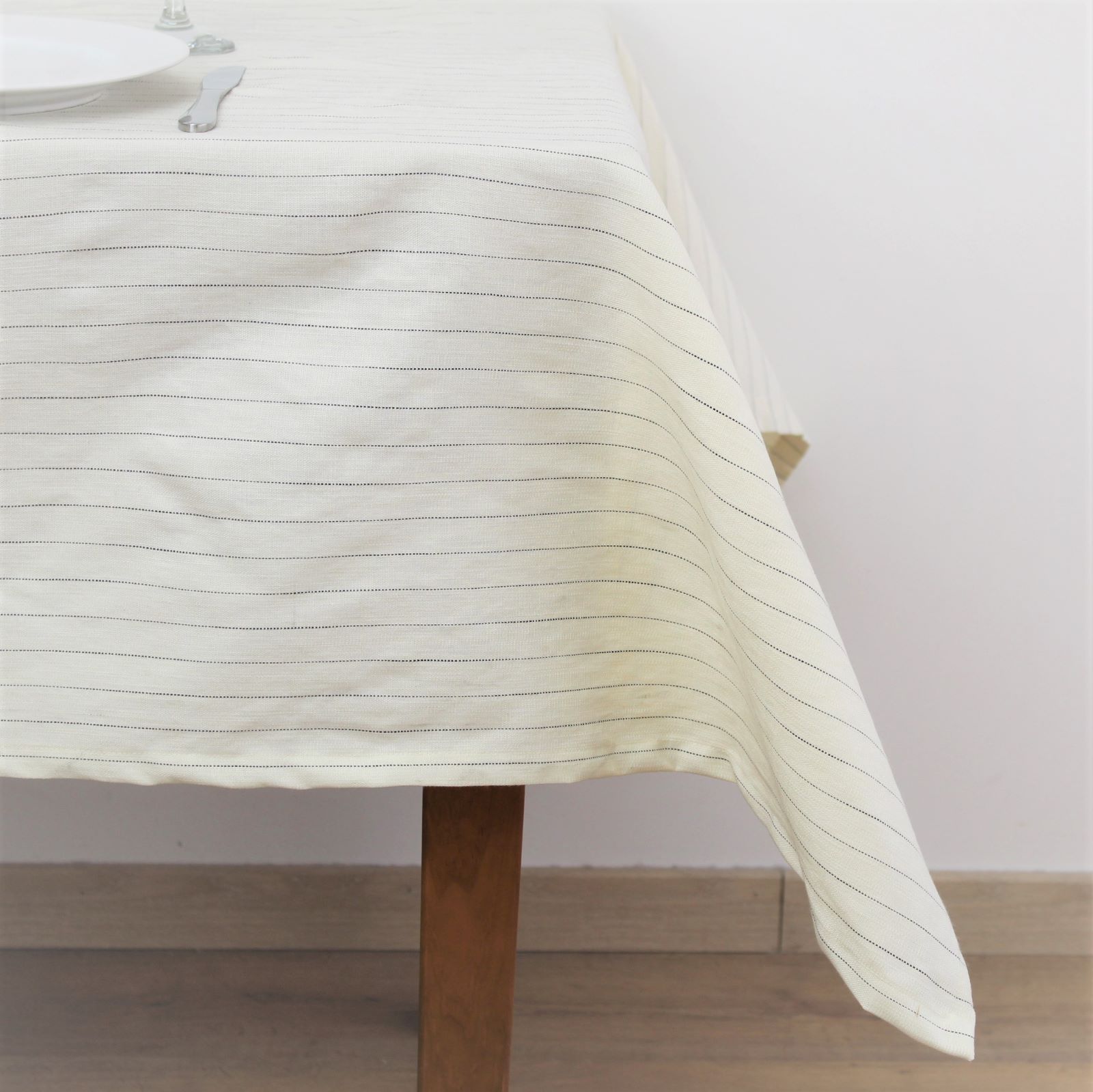 Toalha de mesa em linho bege com riscasdo cinzento.