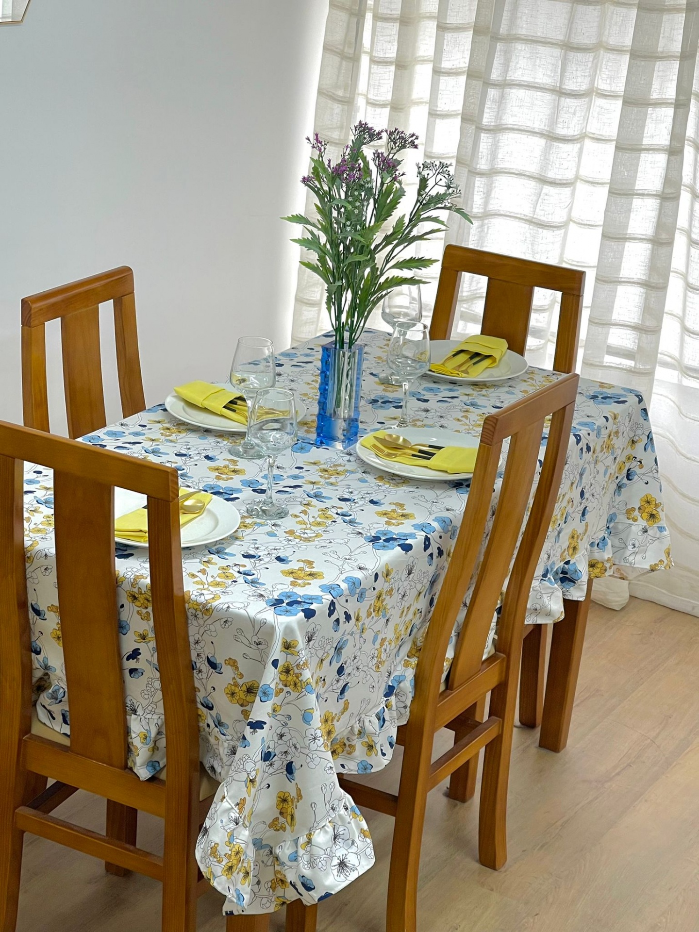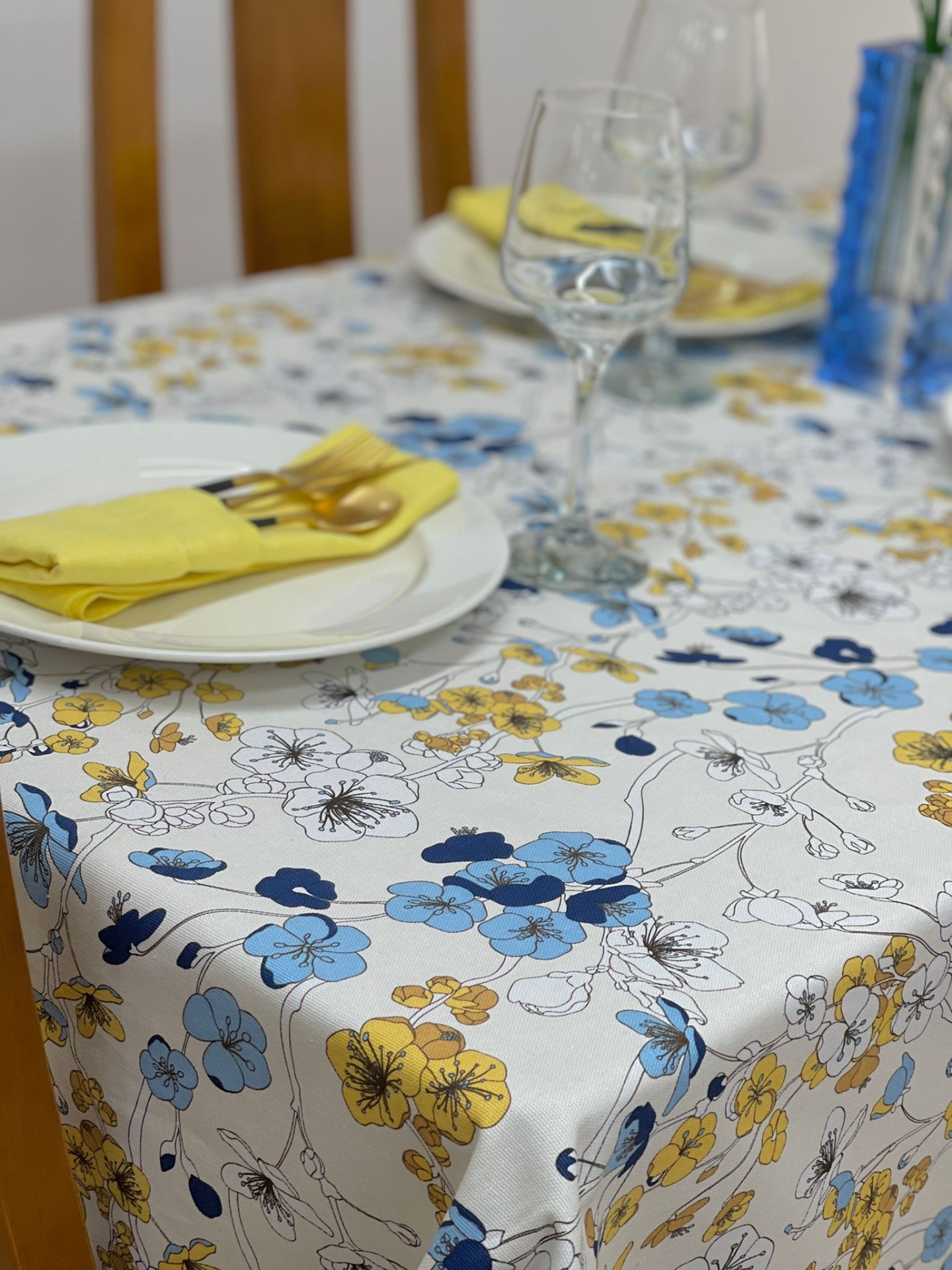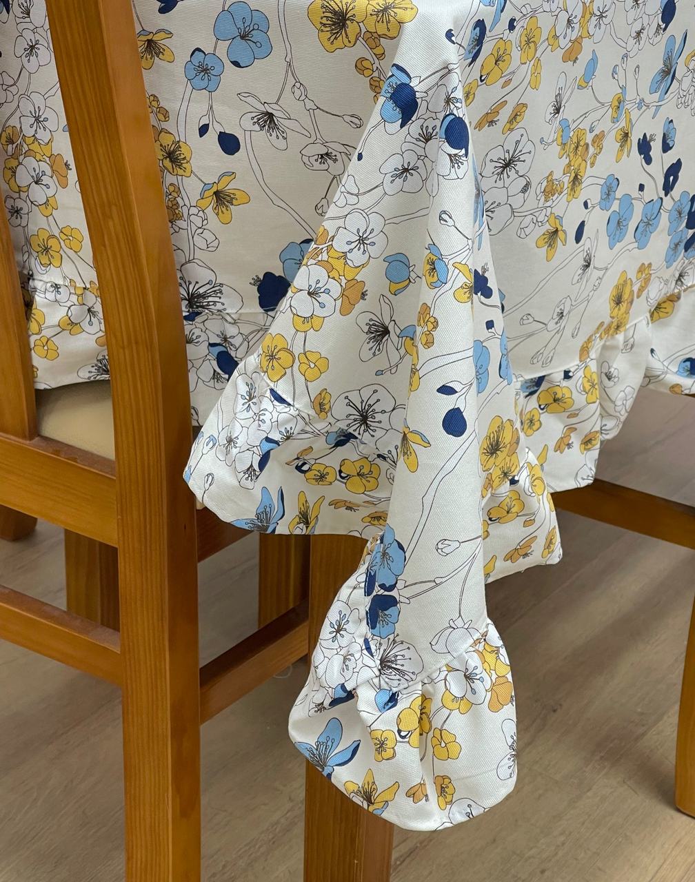 Toalha de mesa algodão com estampado de flores.