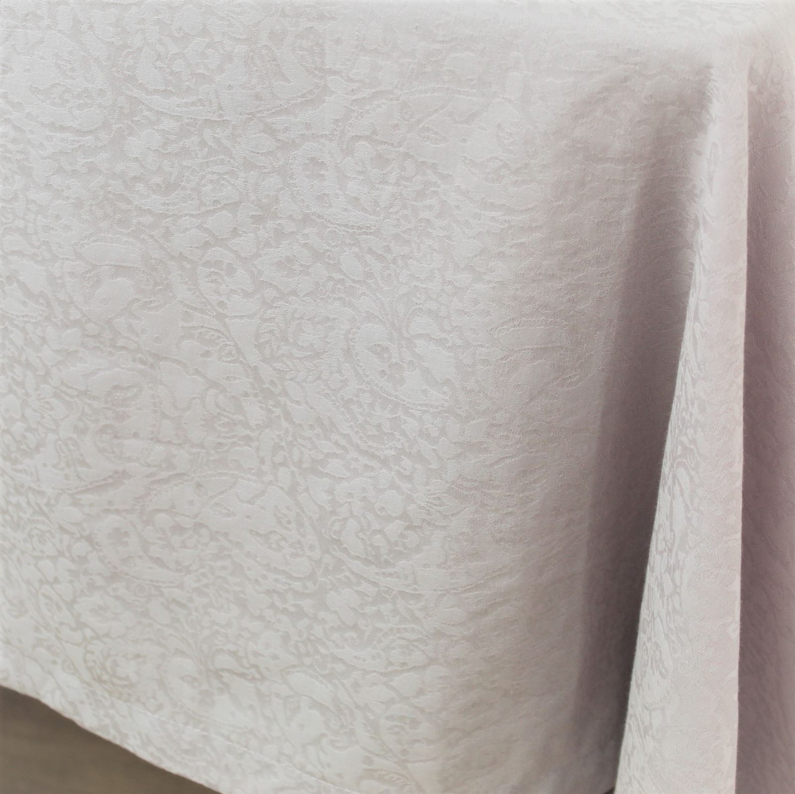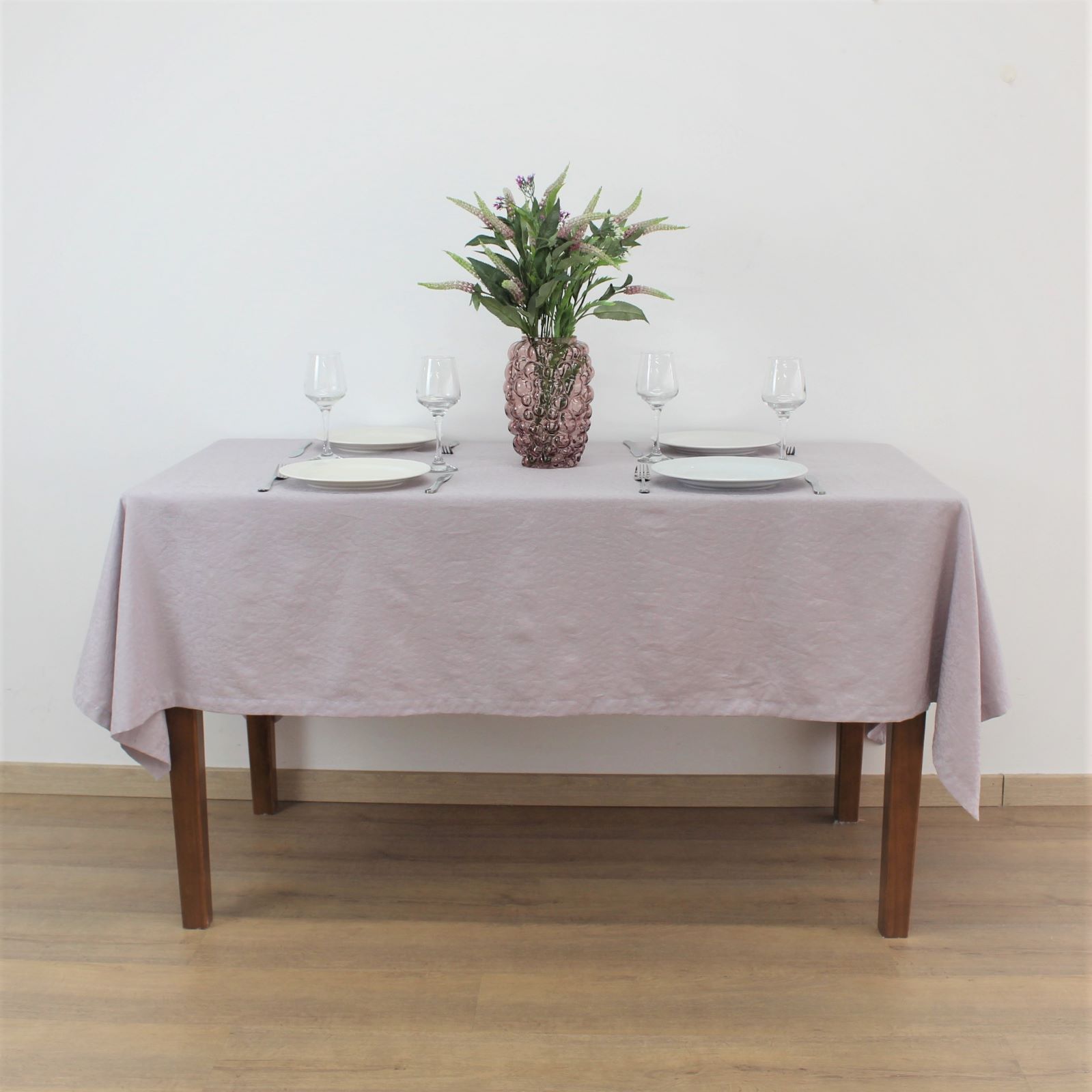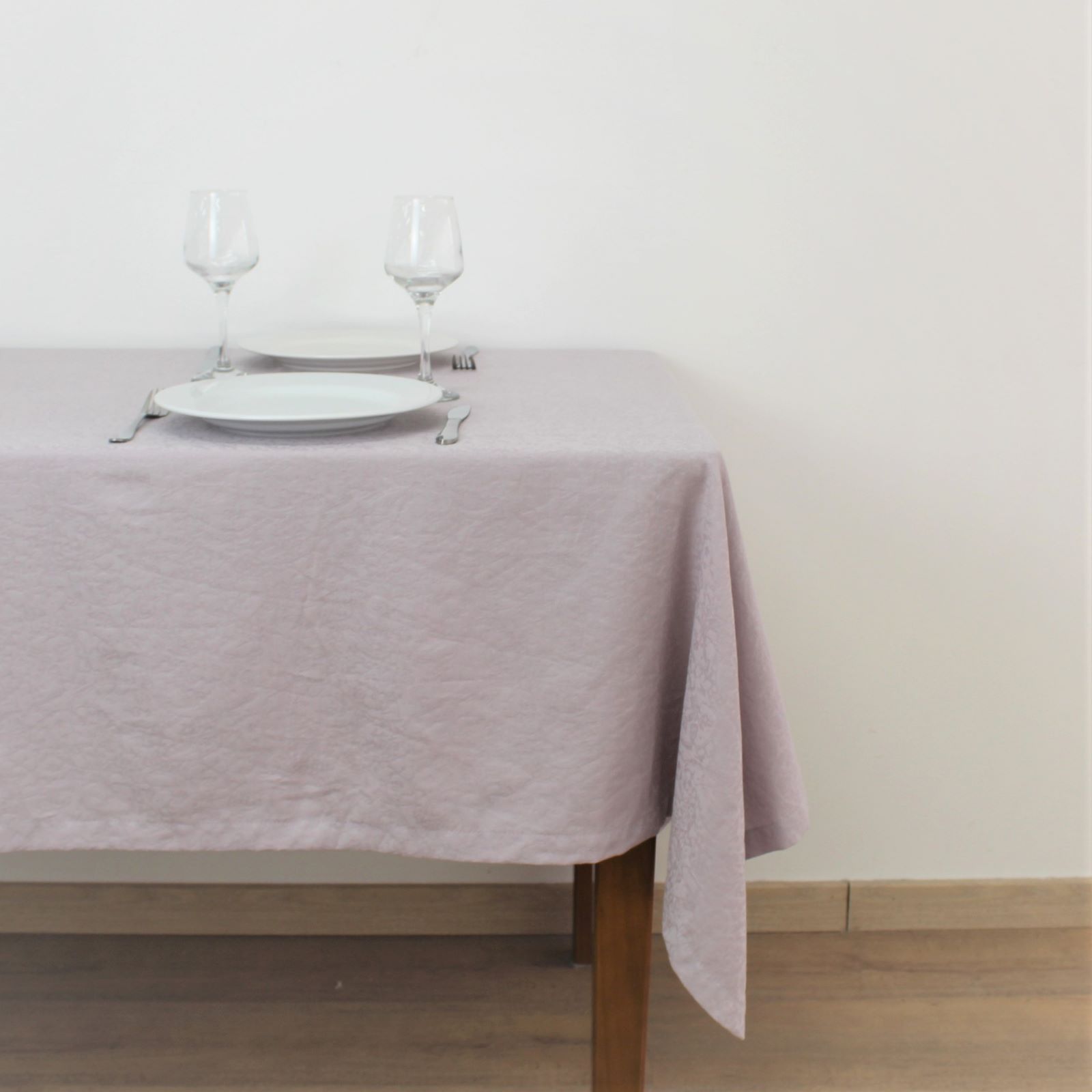 Toalha de mesa em algodão lilás, com padrão em ramos.