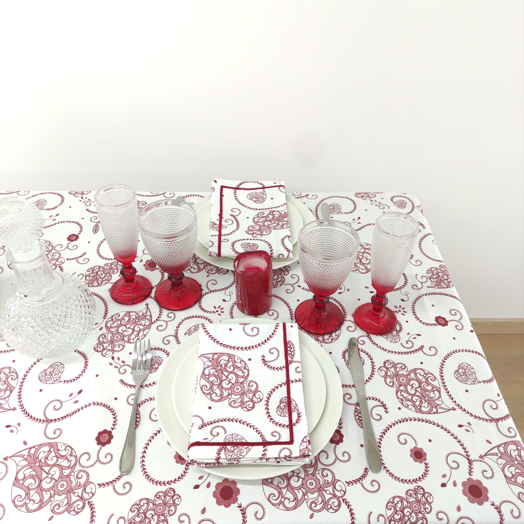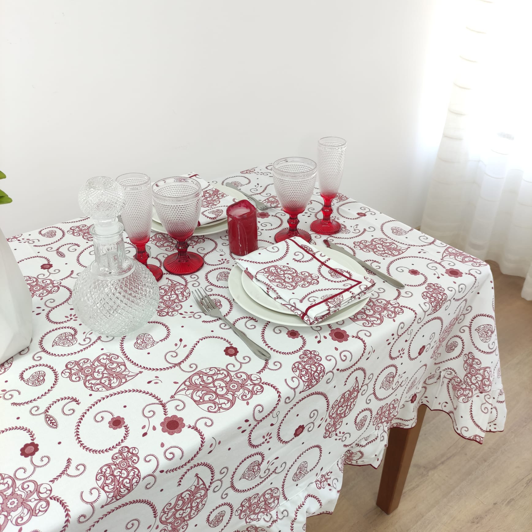 Toalha de mesa algodão com estampado do Coração de Viana, detalhe de aplicação de folho com rolinho.