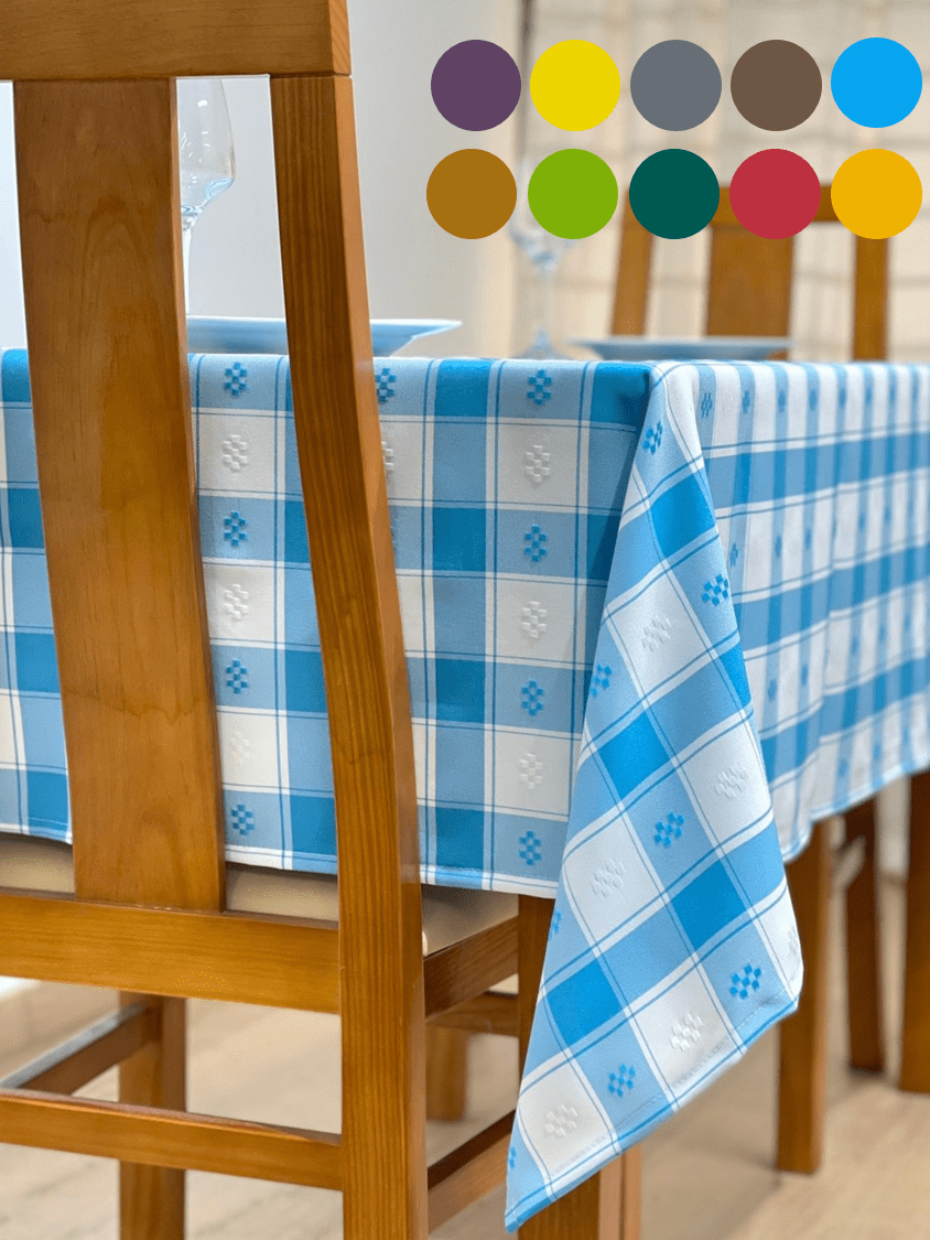 Toalha de mesa em poliéster.  Anti-nodoas, padrão xadrez disponível em várias cores.