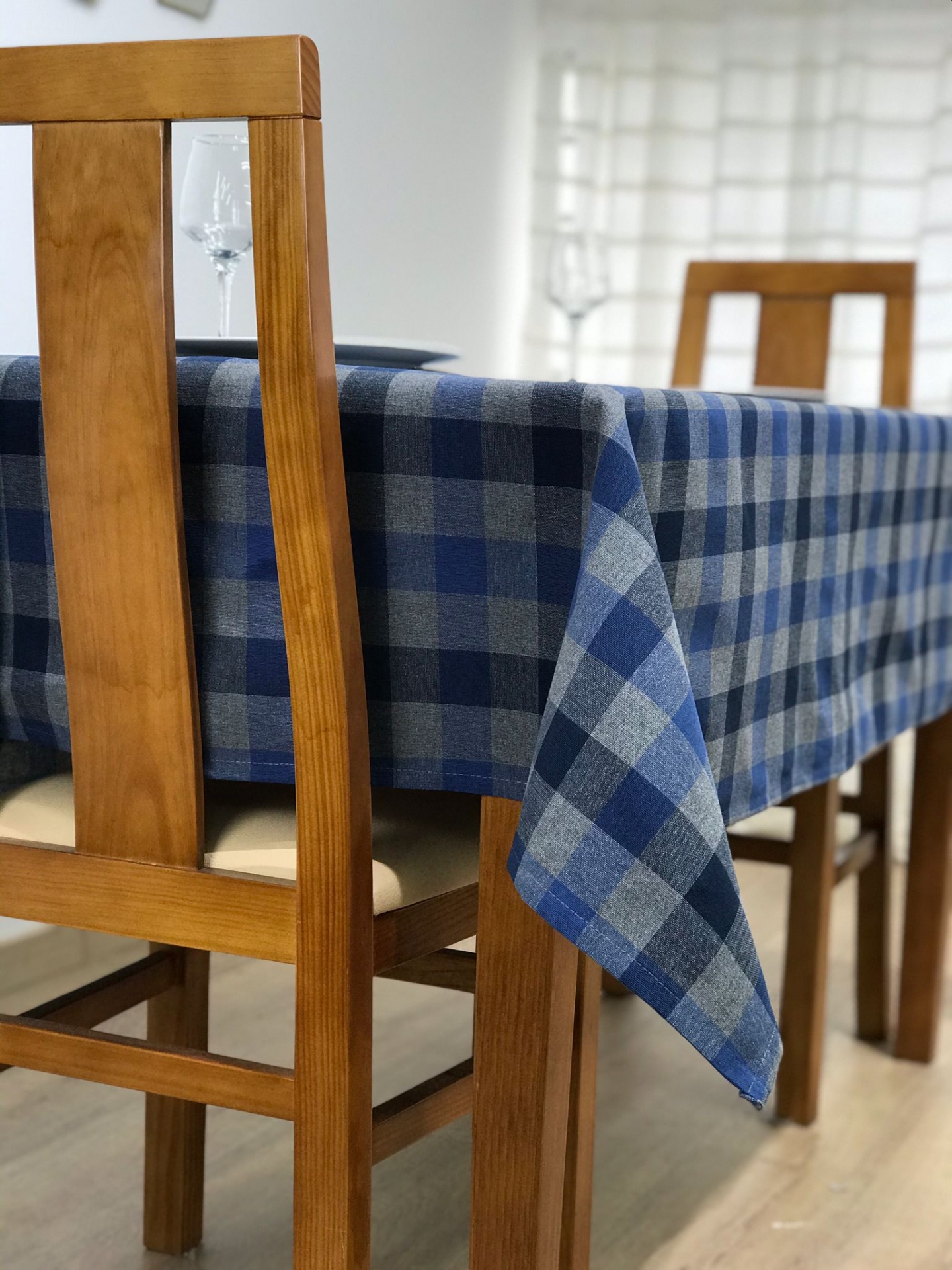 Toalha de mesa com padrão xadrez em tons de azul e cinza.