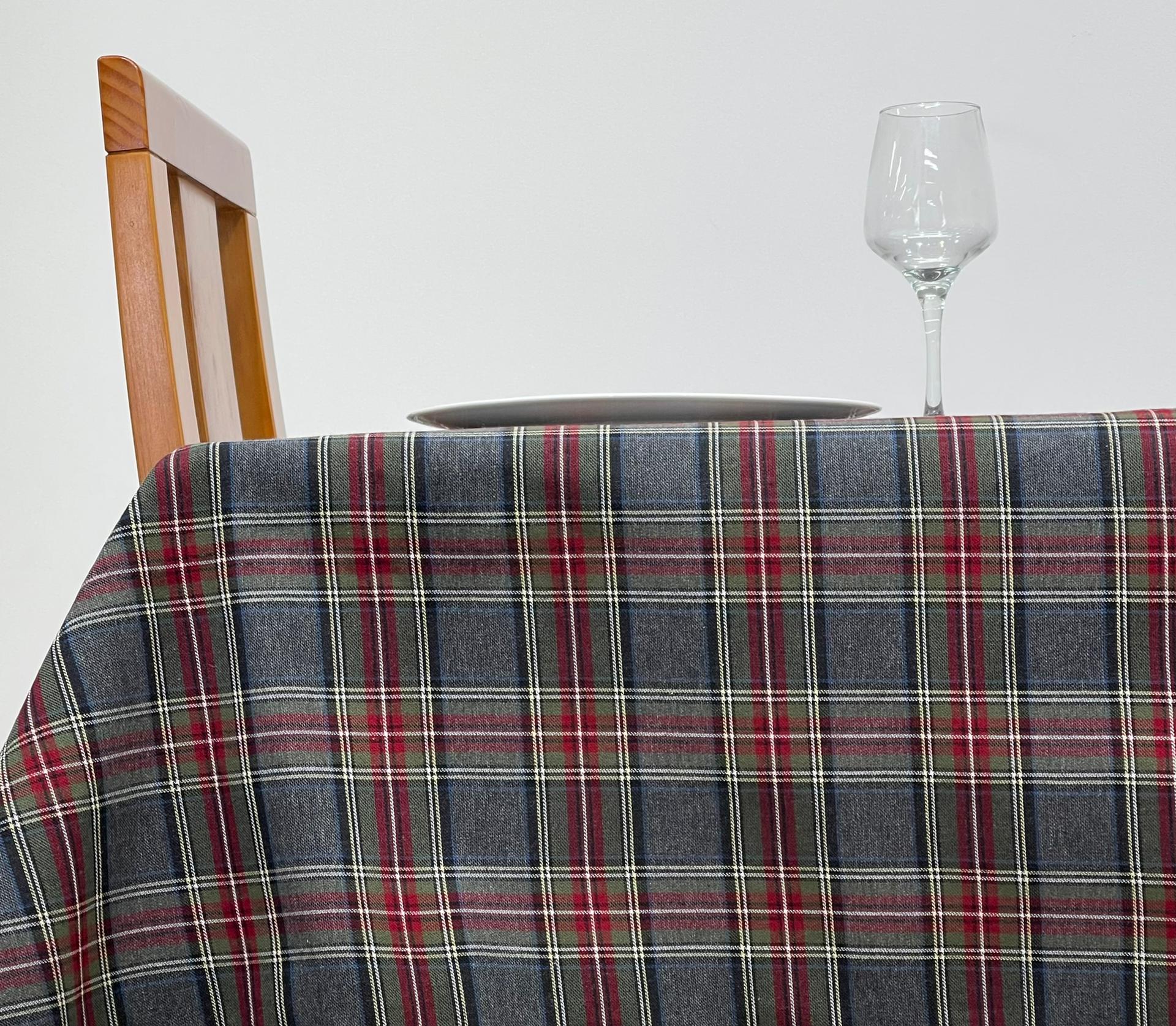 Toalha de mesa com estampado xadrez em tons de cinza.