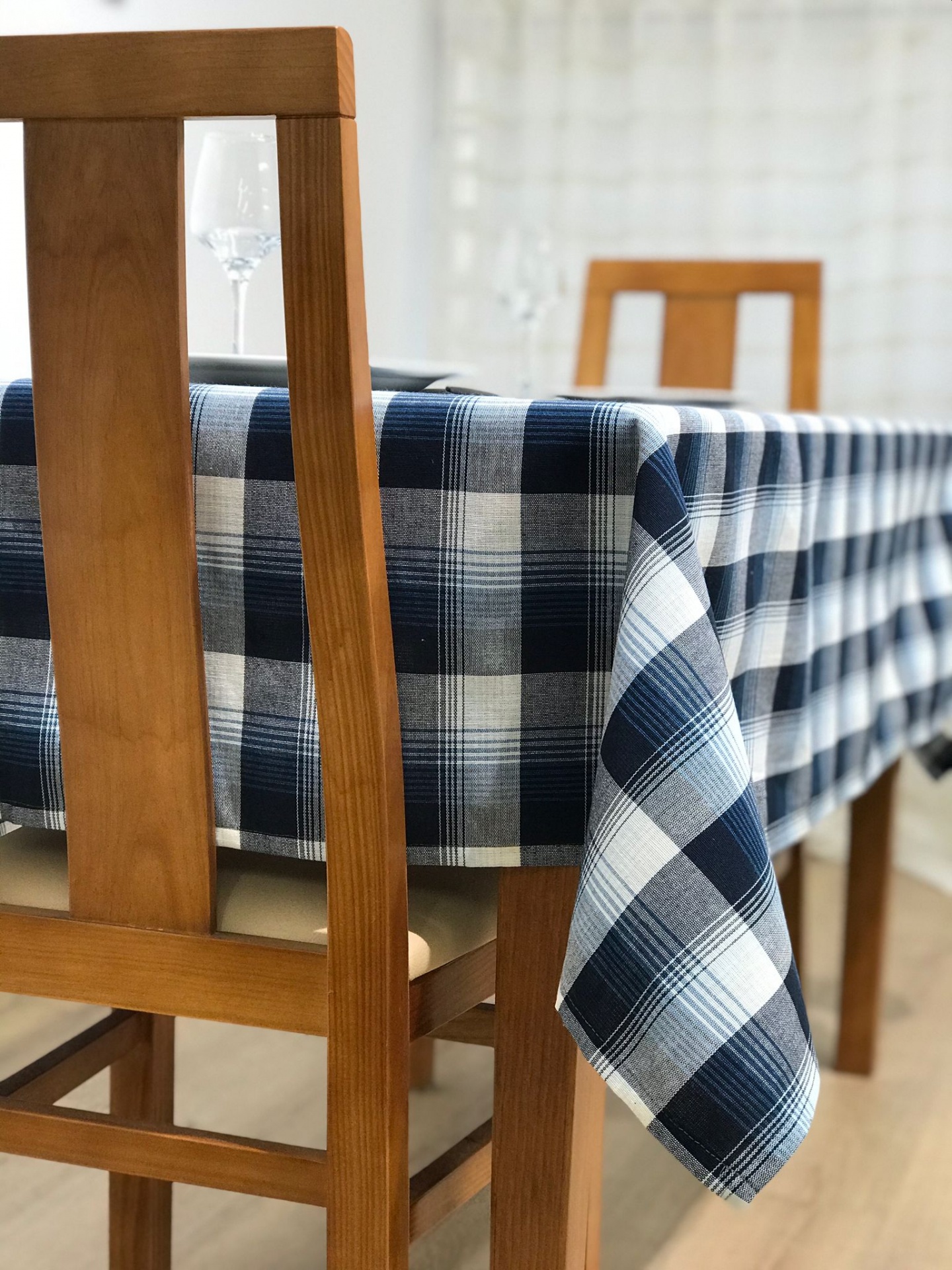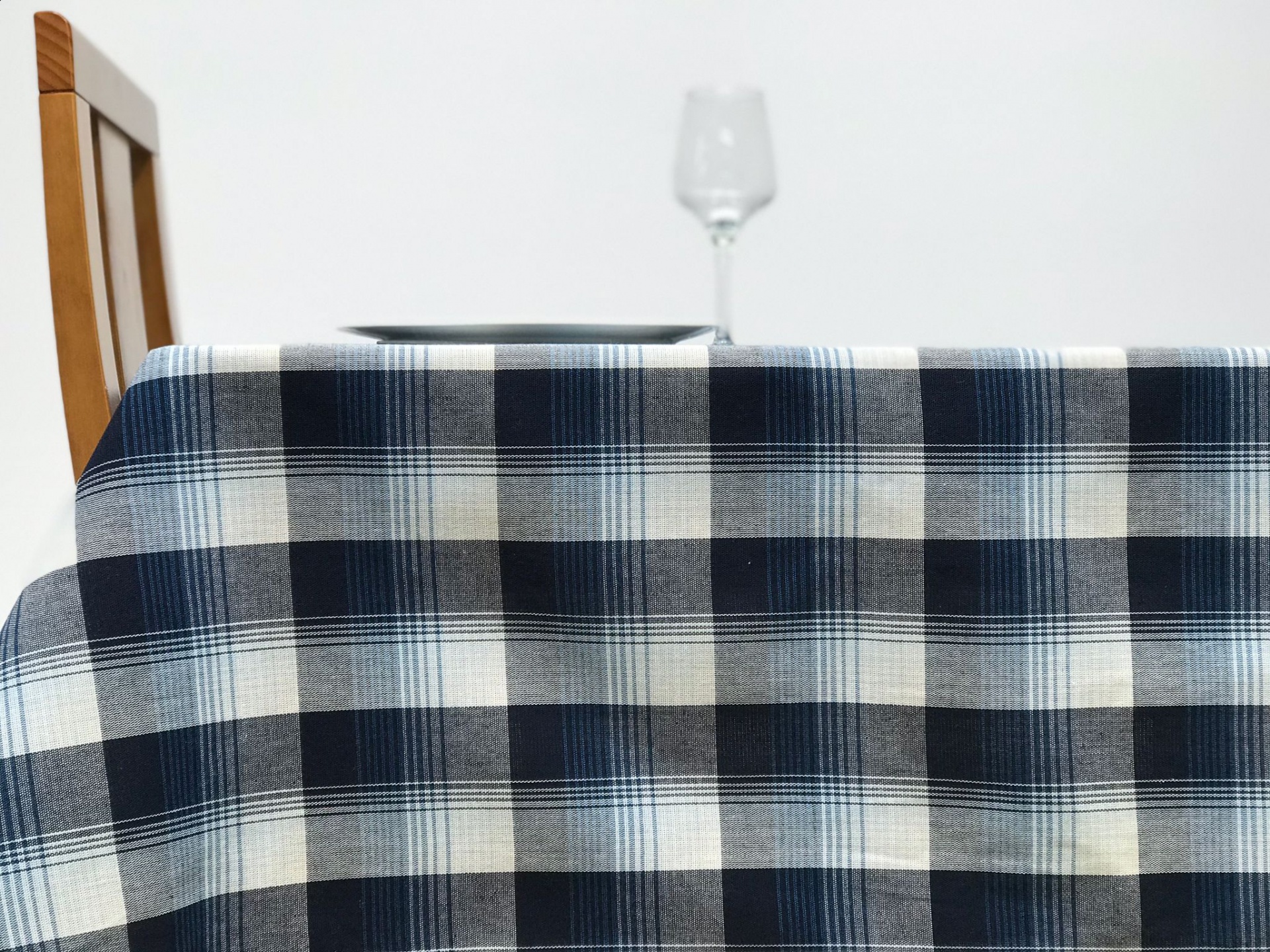 Toalha de mesa com padrão xadrez em tons de azul.