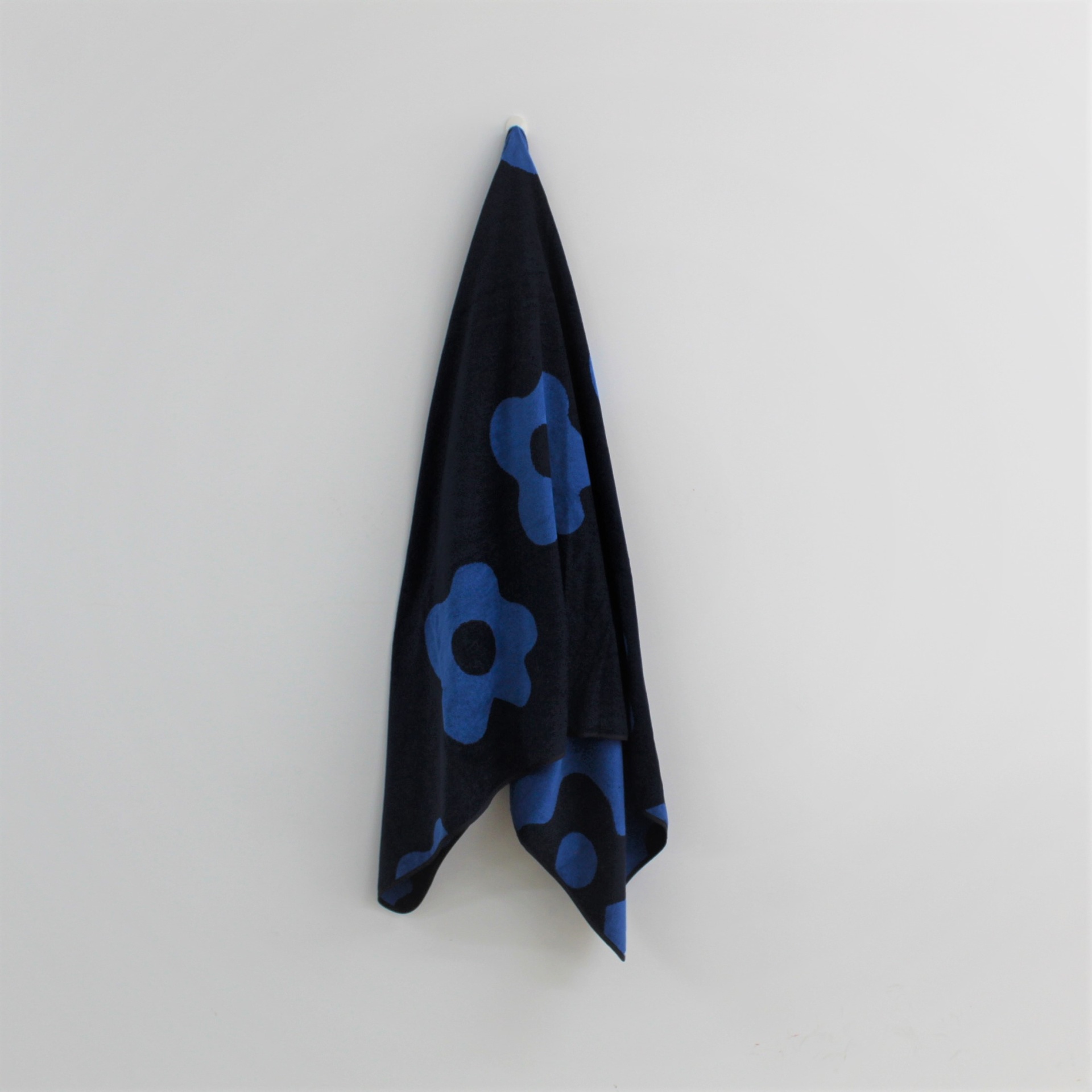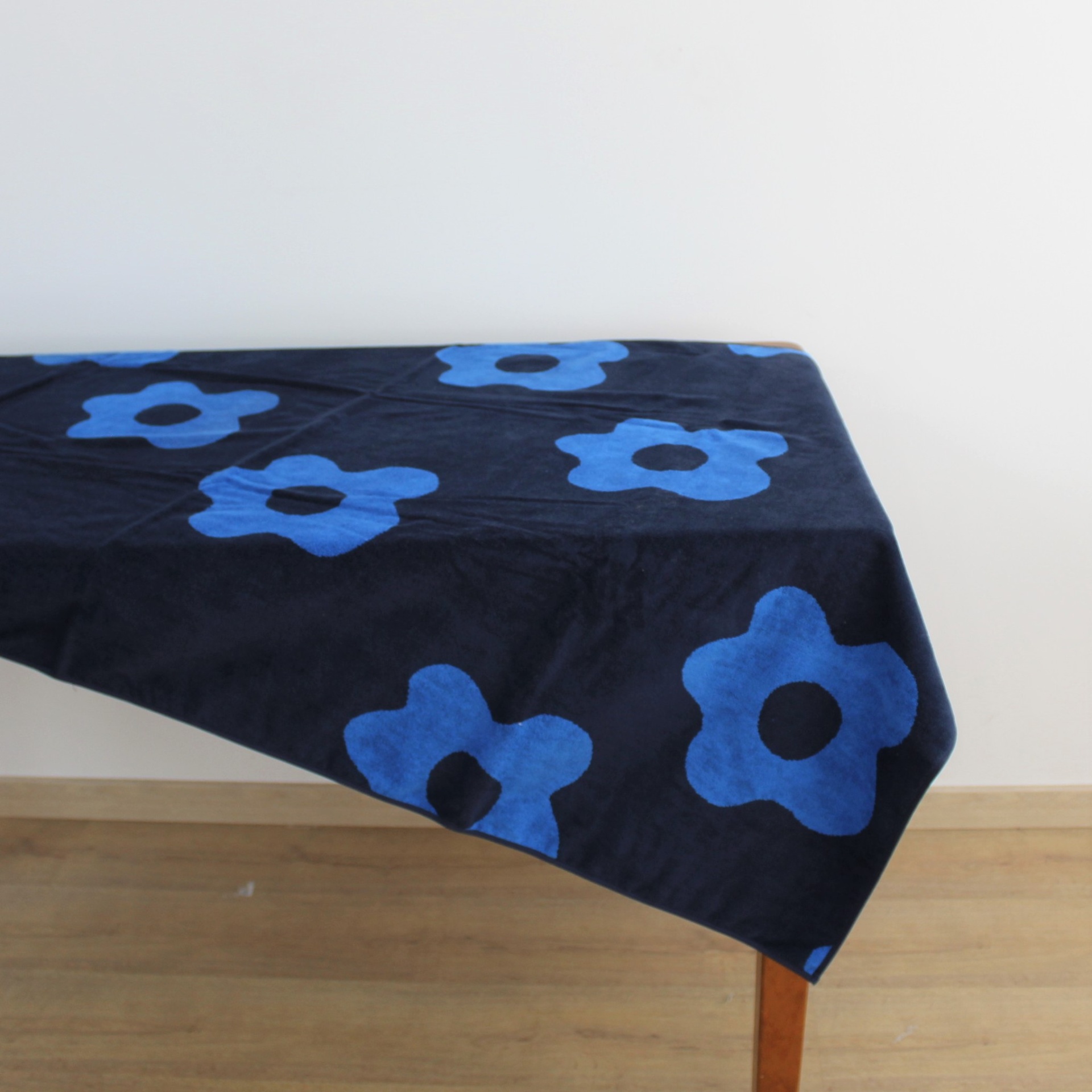 Toalha de praia com estampa de preto e azul com detalhe em flor.
