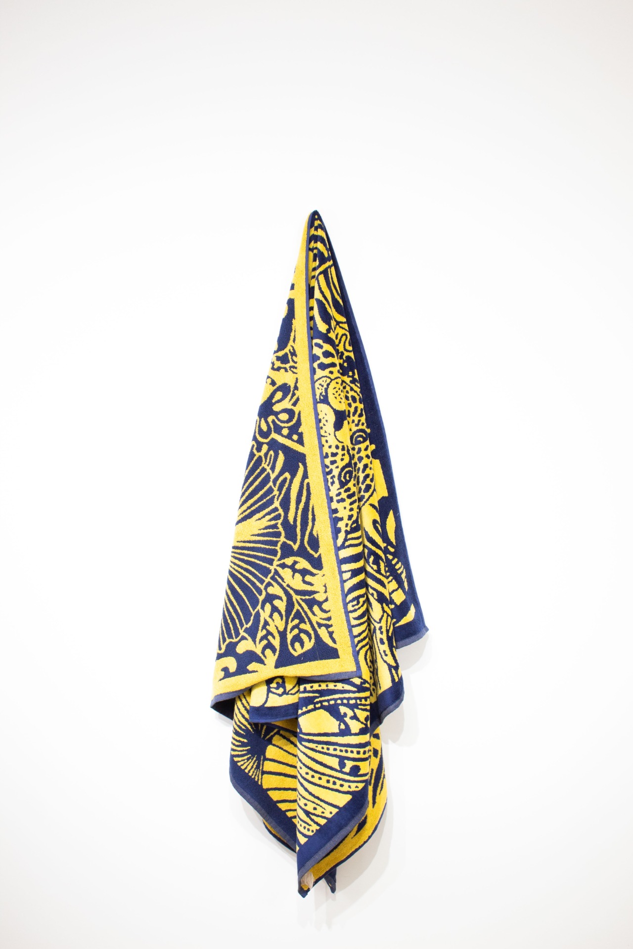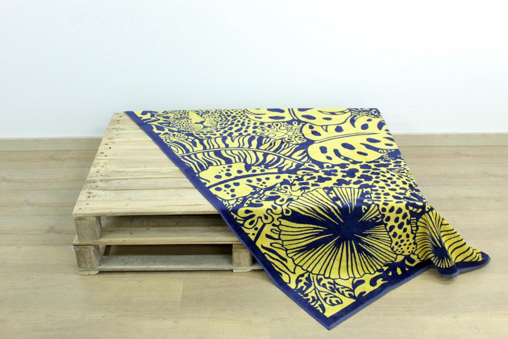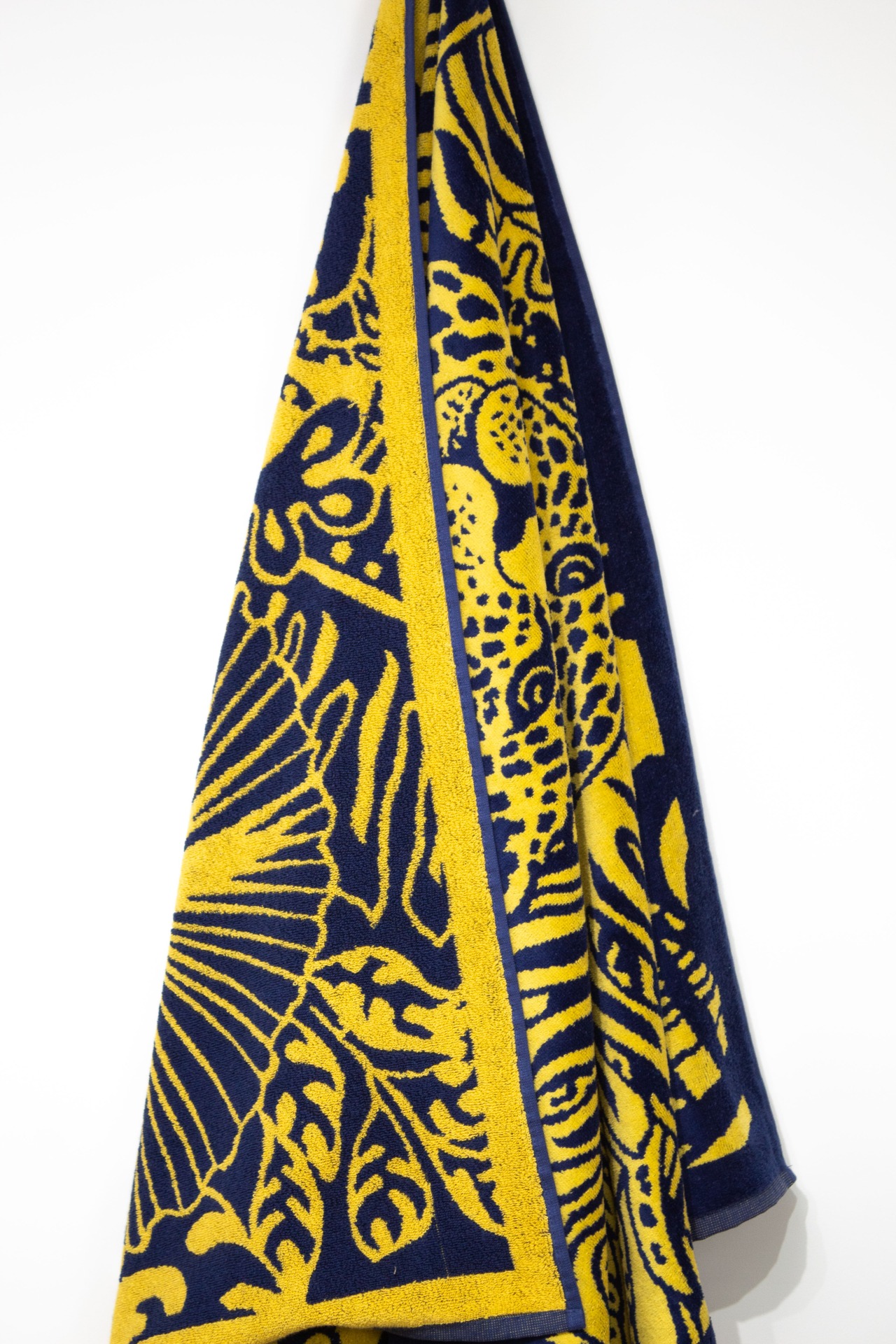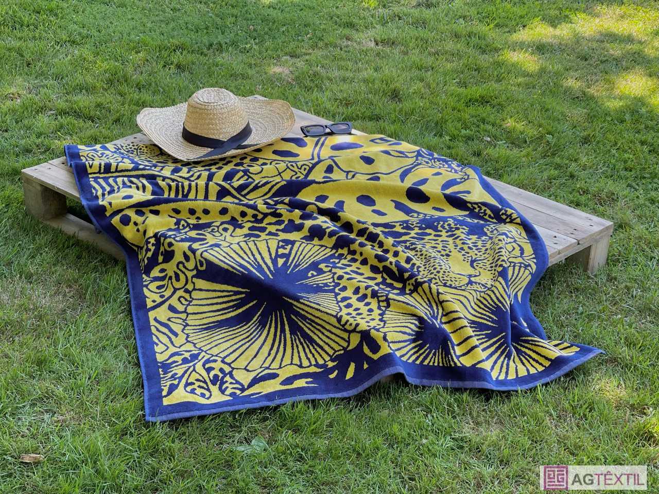 Toalha de praia, 100% algodão com padrão leopardo em tons de azul e amarelo.