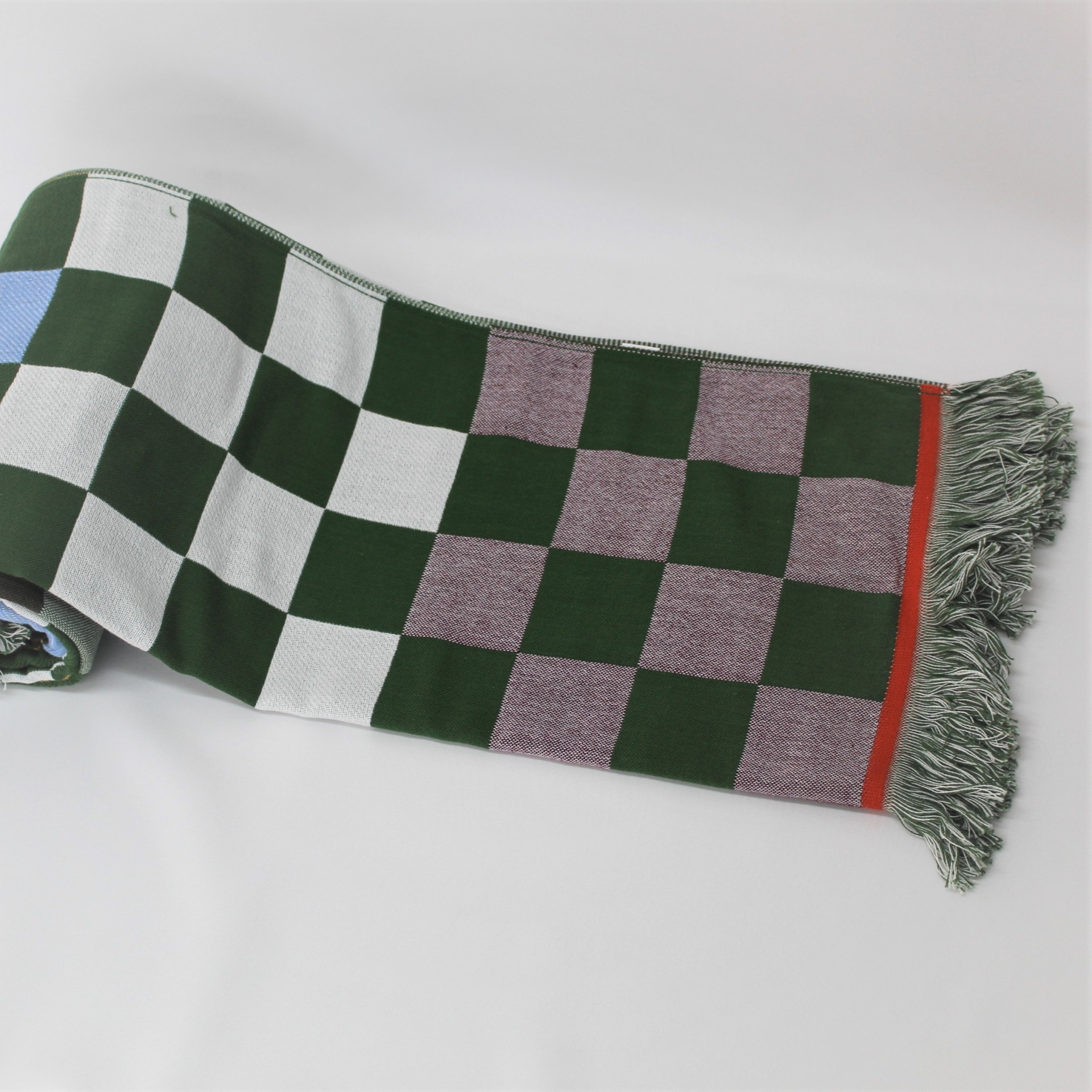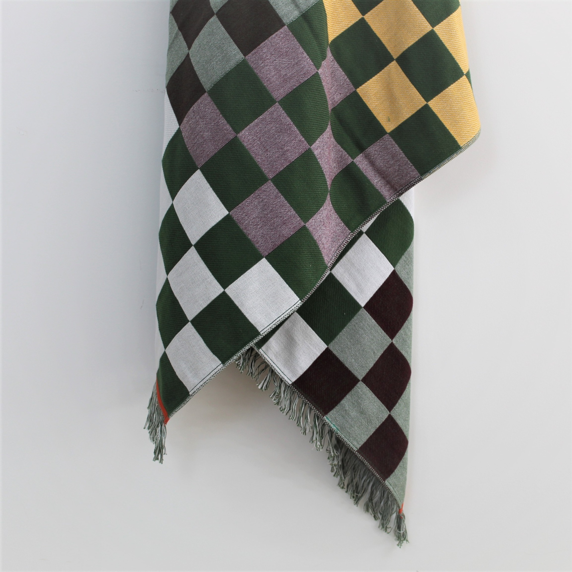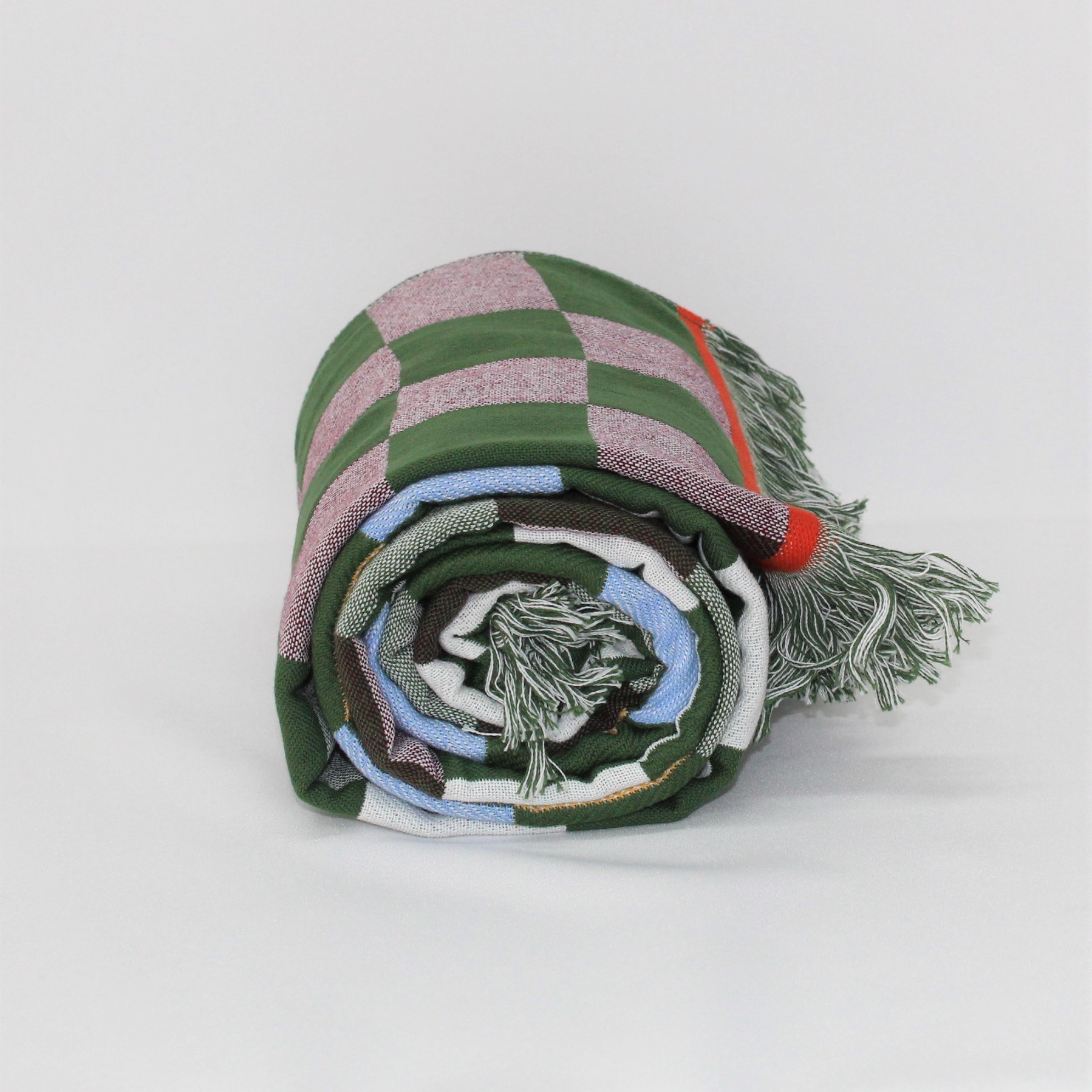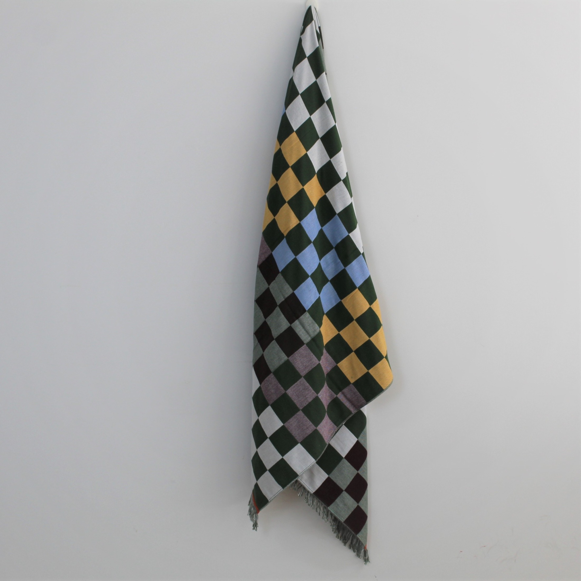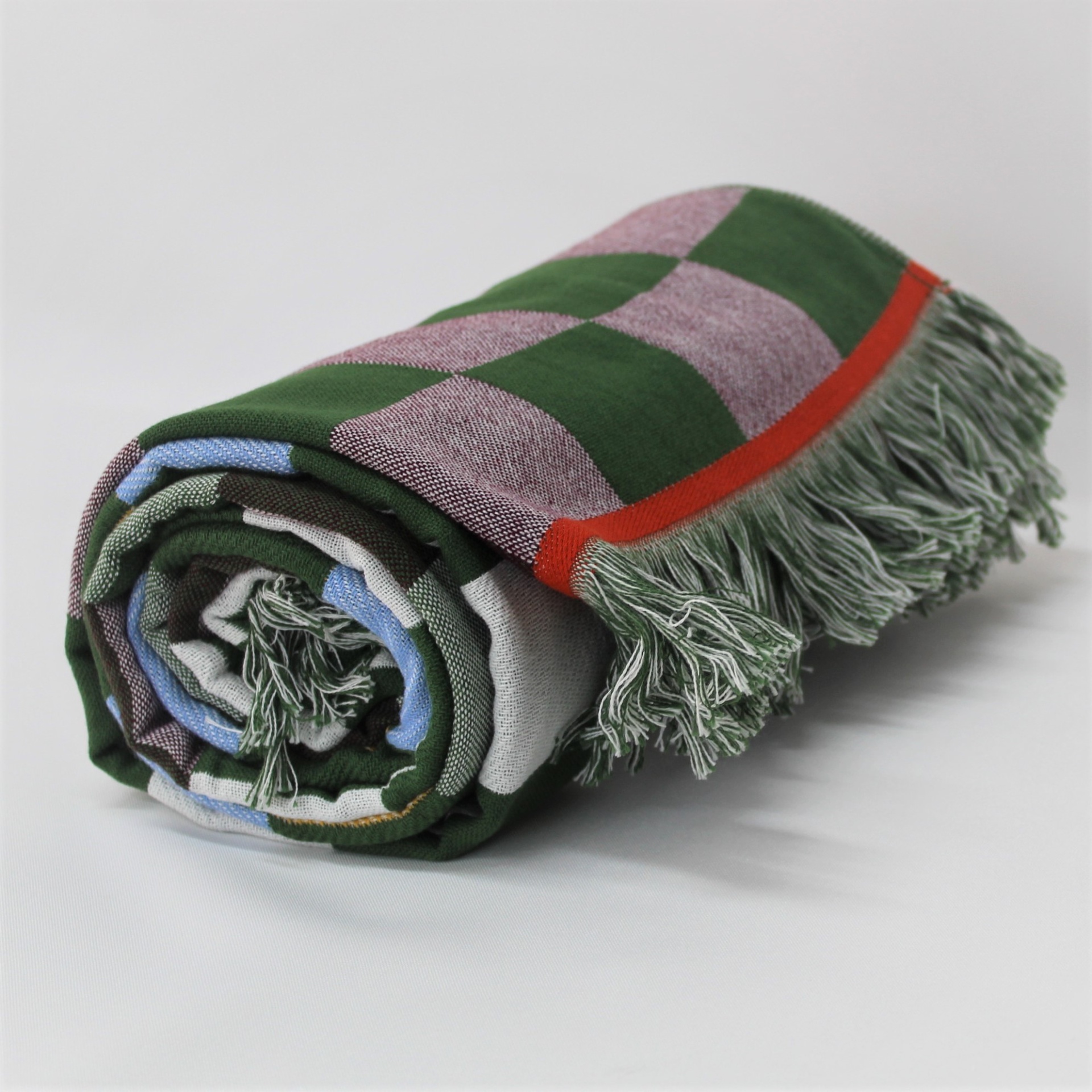 Toalha de praia com estampa de xadrez verde e entre outras cores.