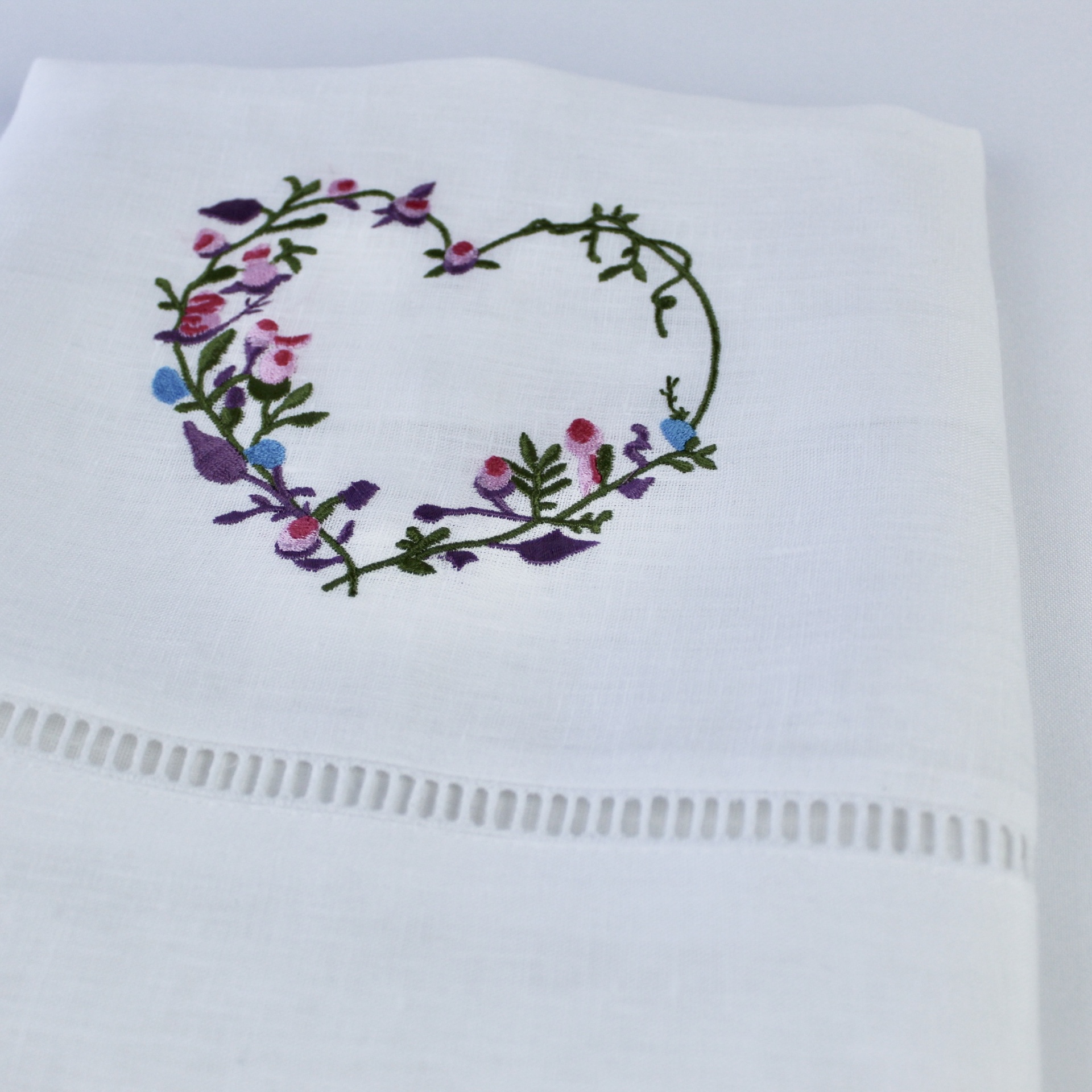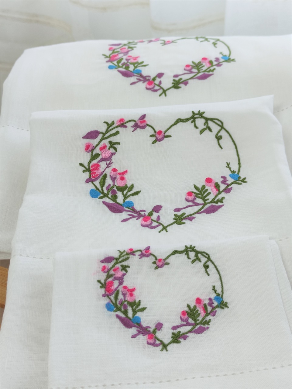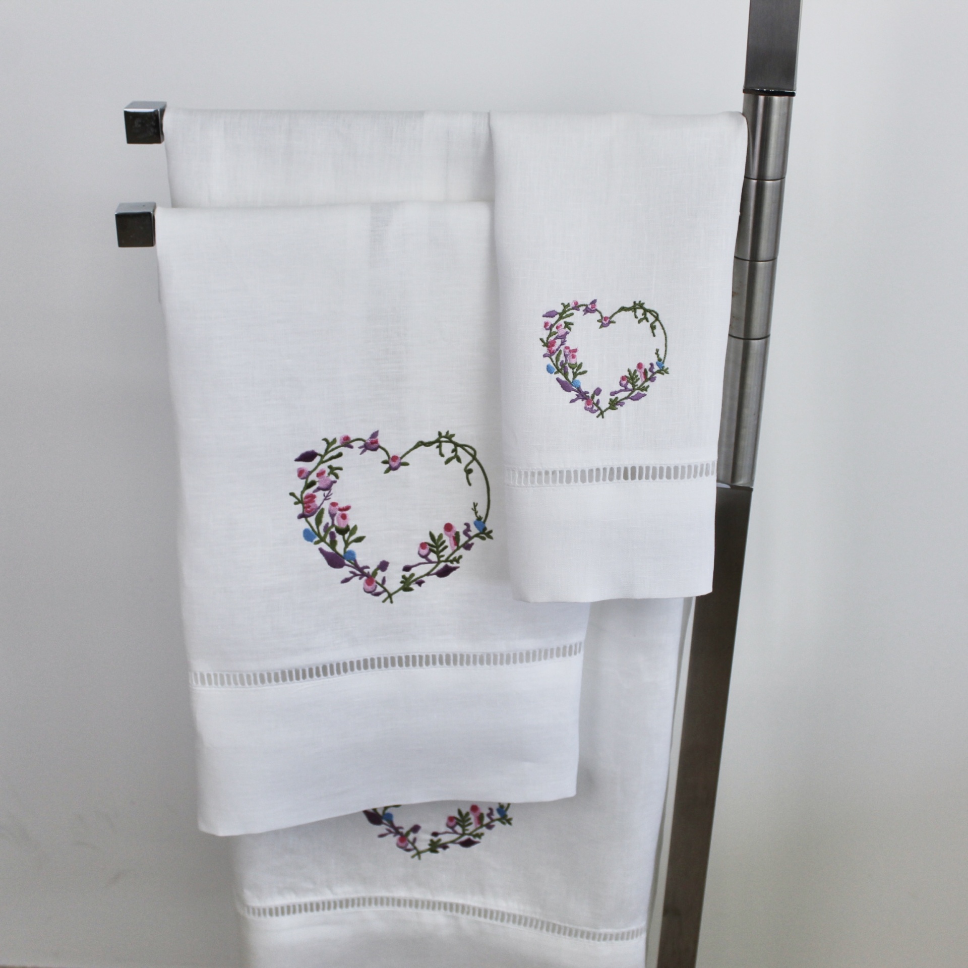 Toalhas de banho, rosto e bidé em linho e escadote com bordado de um coração com opção de personalização com o seu nome/inicial.