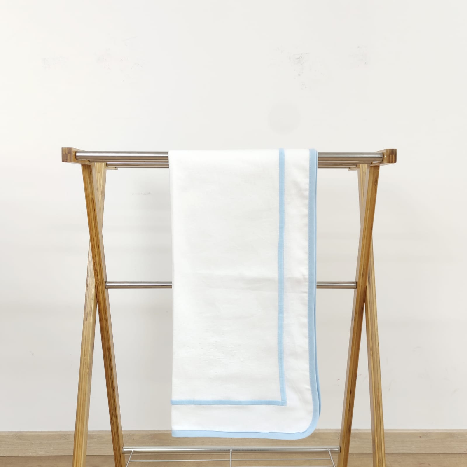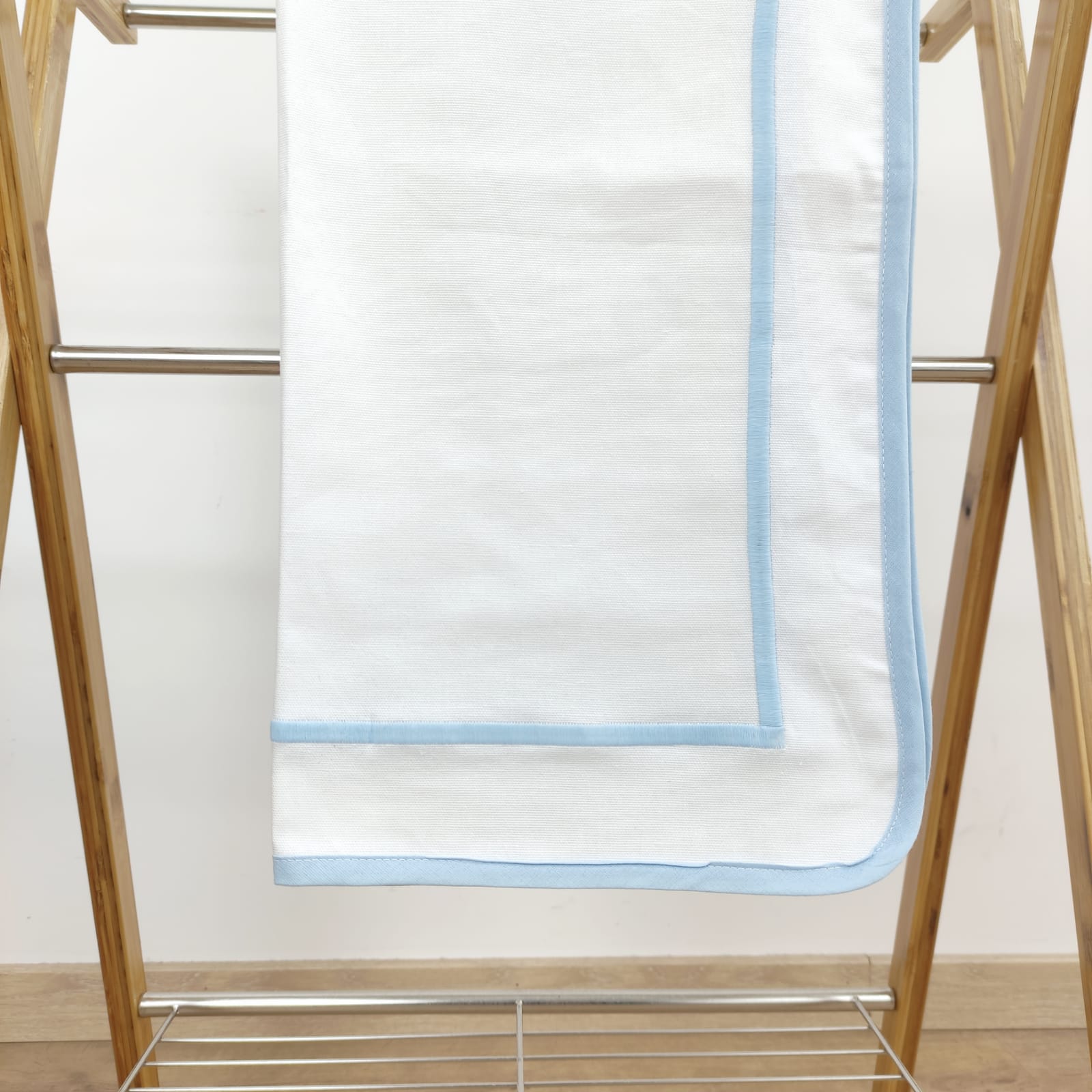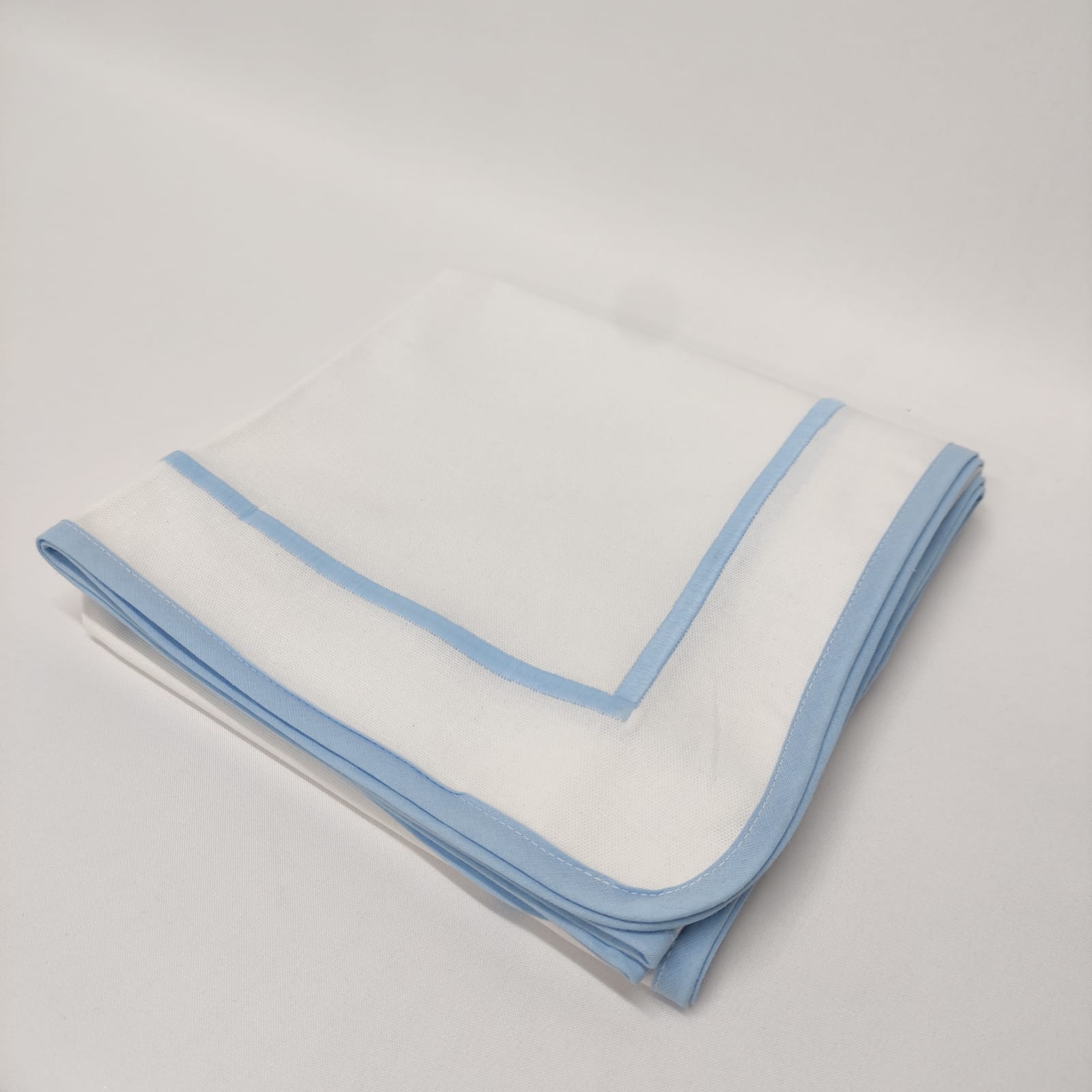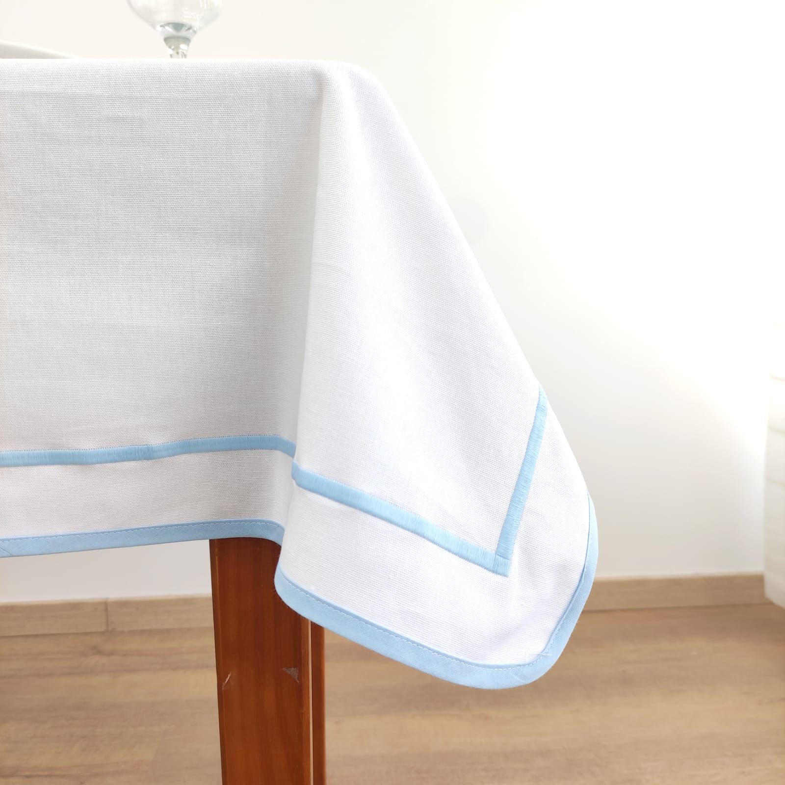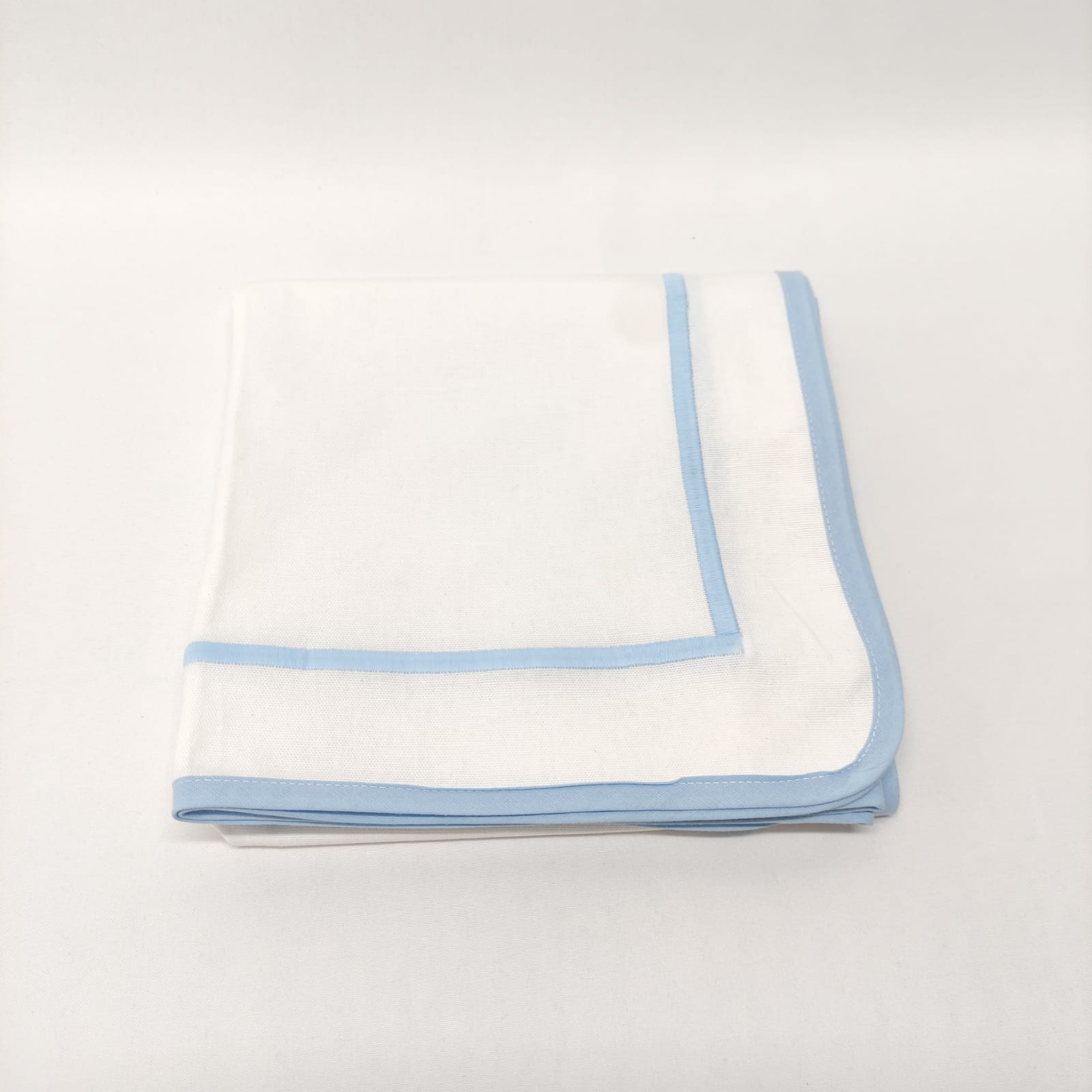 Toalha de mesa em algodão branco com contorno em azul bebé