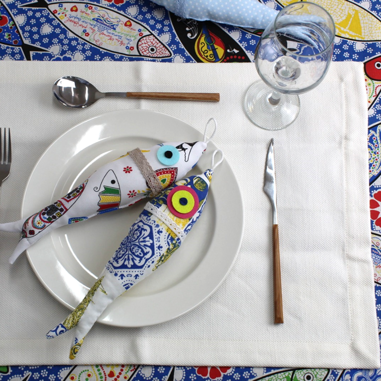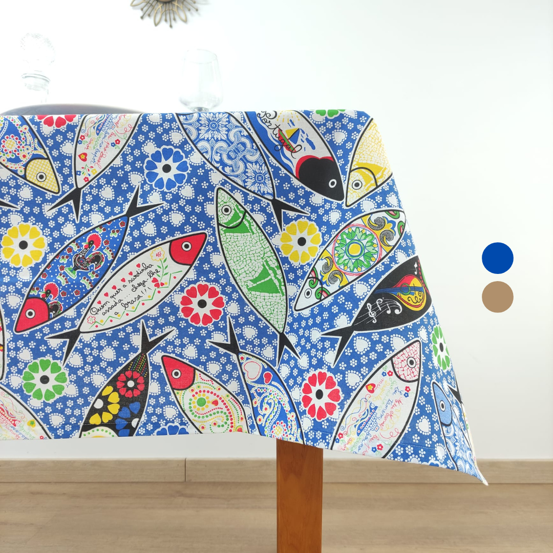 Toalha de mesa em algodão, com padrão sardinhas. Disponivel na cor azul e bege.